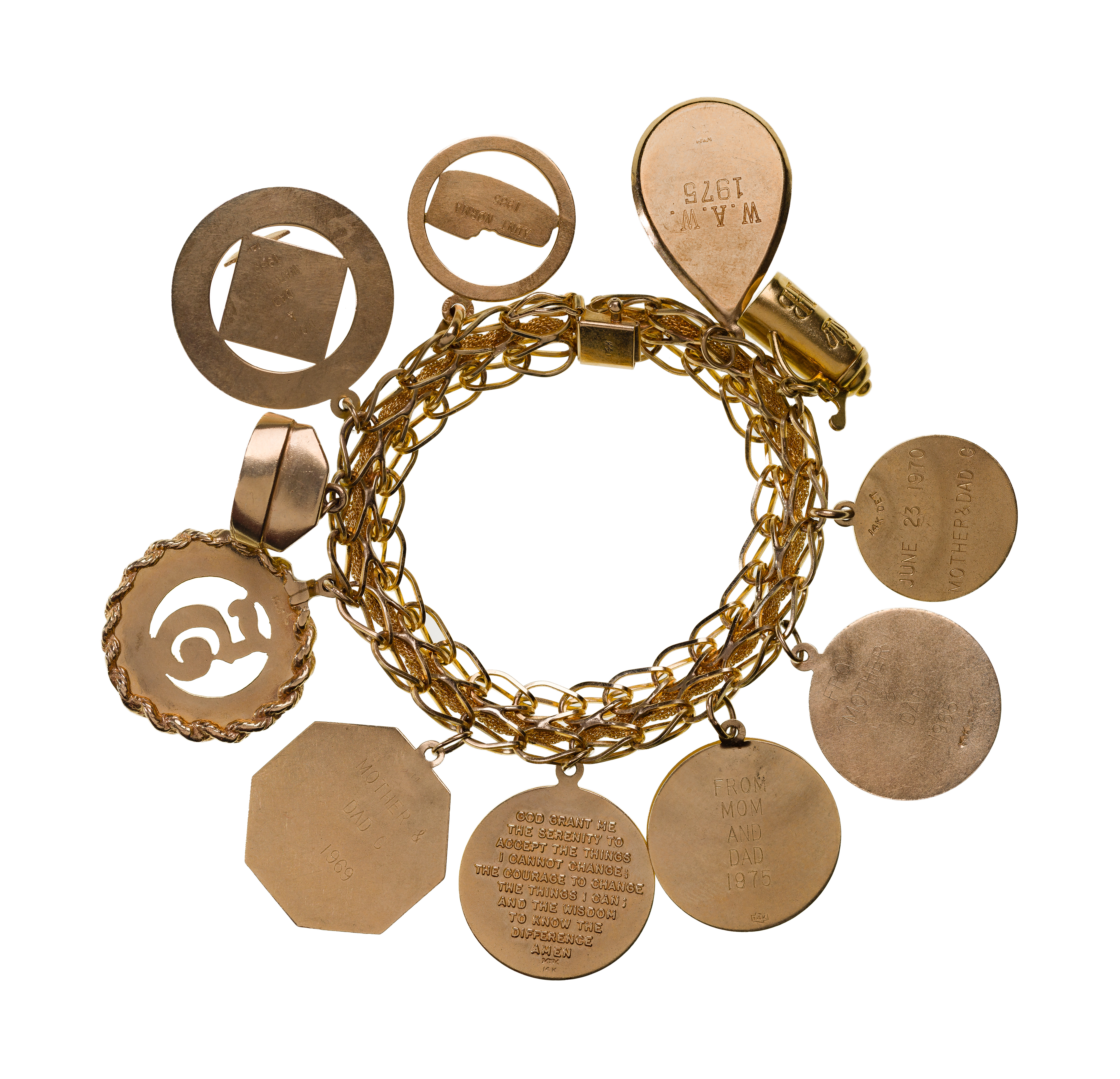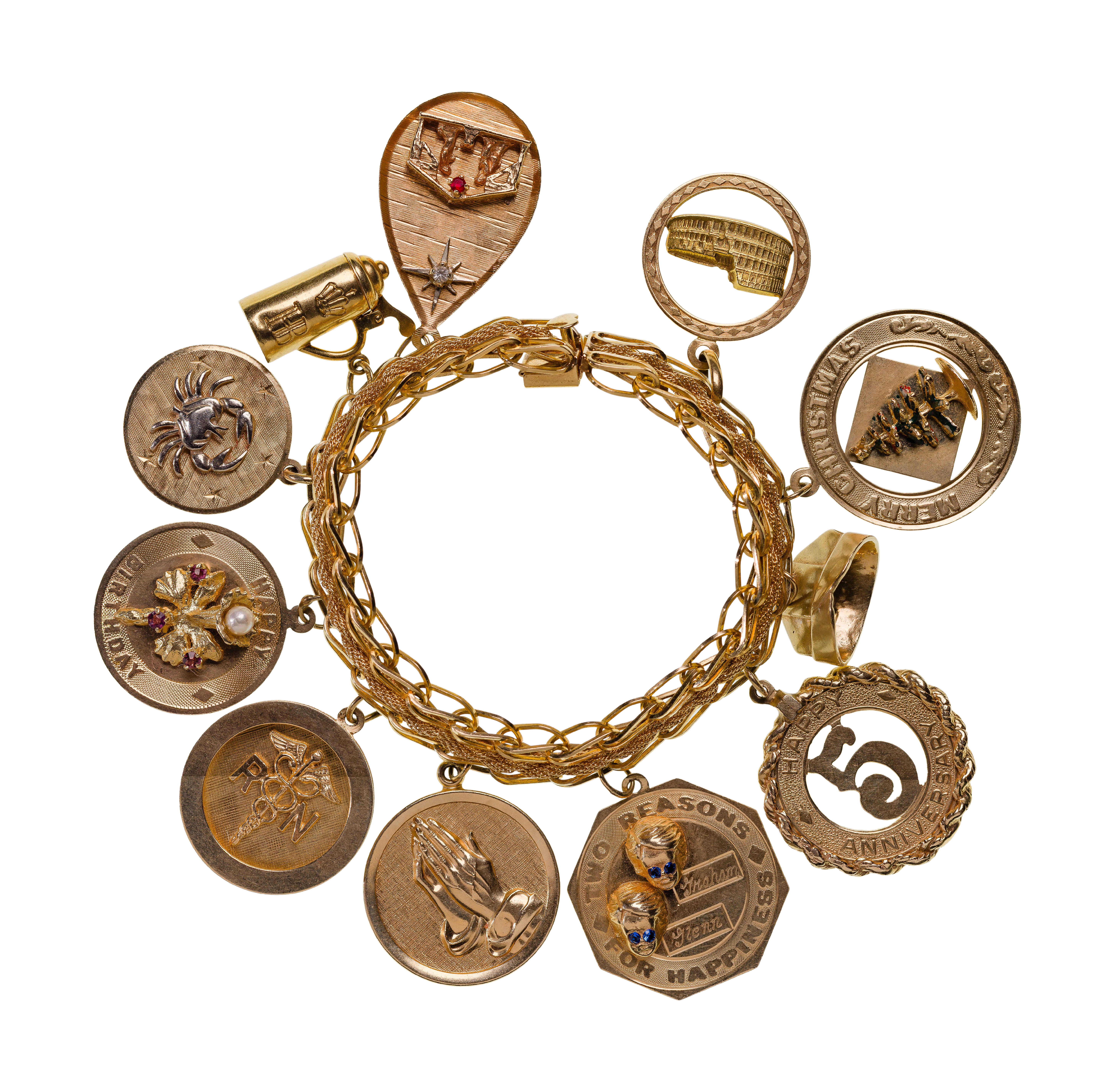A double link and mesh bracelet having eleven attached charms (most marked ’14k’, Parthenon marked ’18k’, stein unmarked 18k)