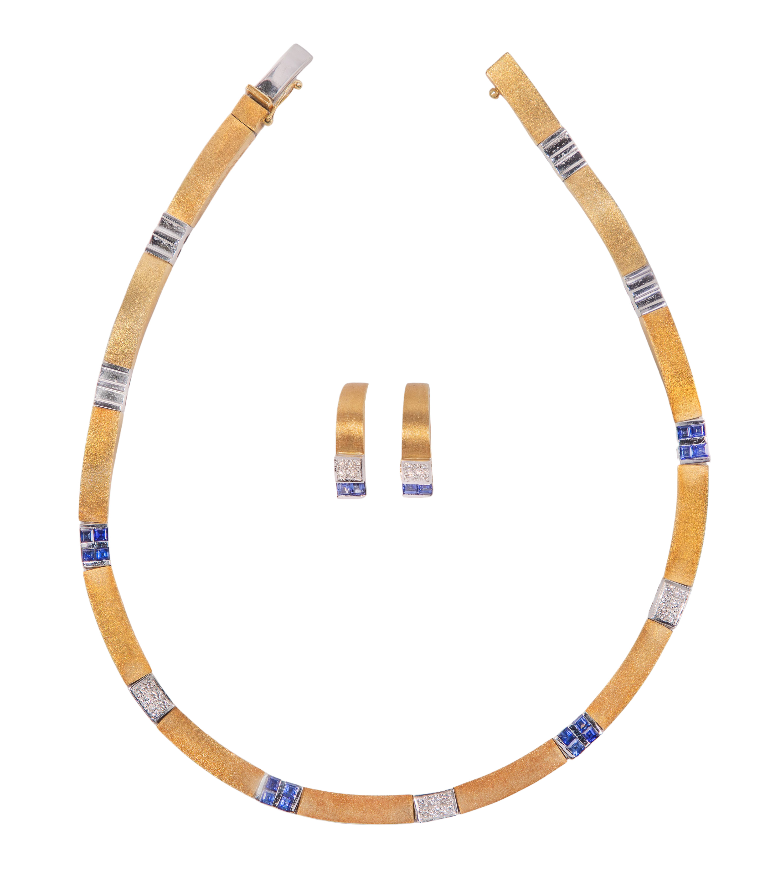 18k Gold, Sapphire and Diamond Necklace and Earrings