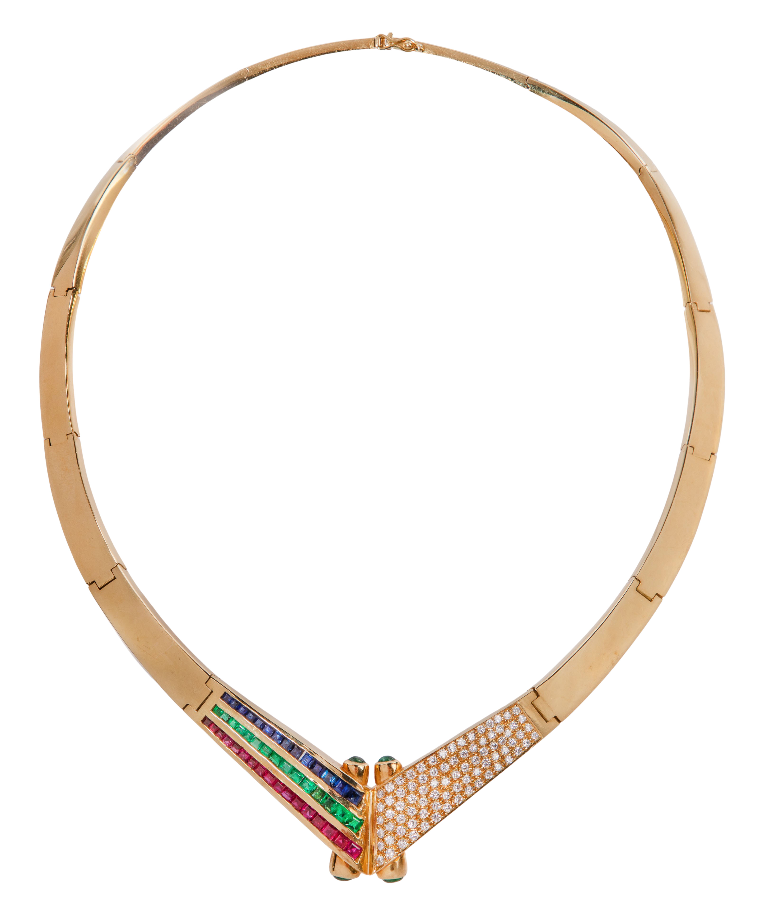A torque style choker in a V-design having round cut diamonds accenting one side and princess cut emeralds, rubies and sapphires on the other, scroll ends having emerald cabochons (marked ‘750’ on tongue of clasp), including a presentation envelope