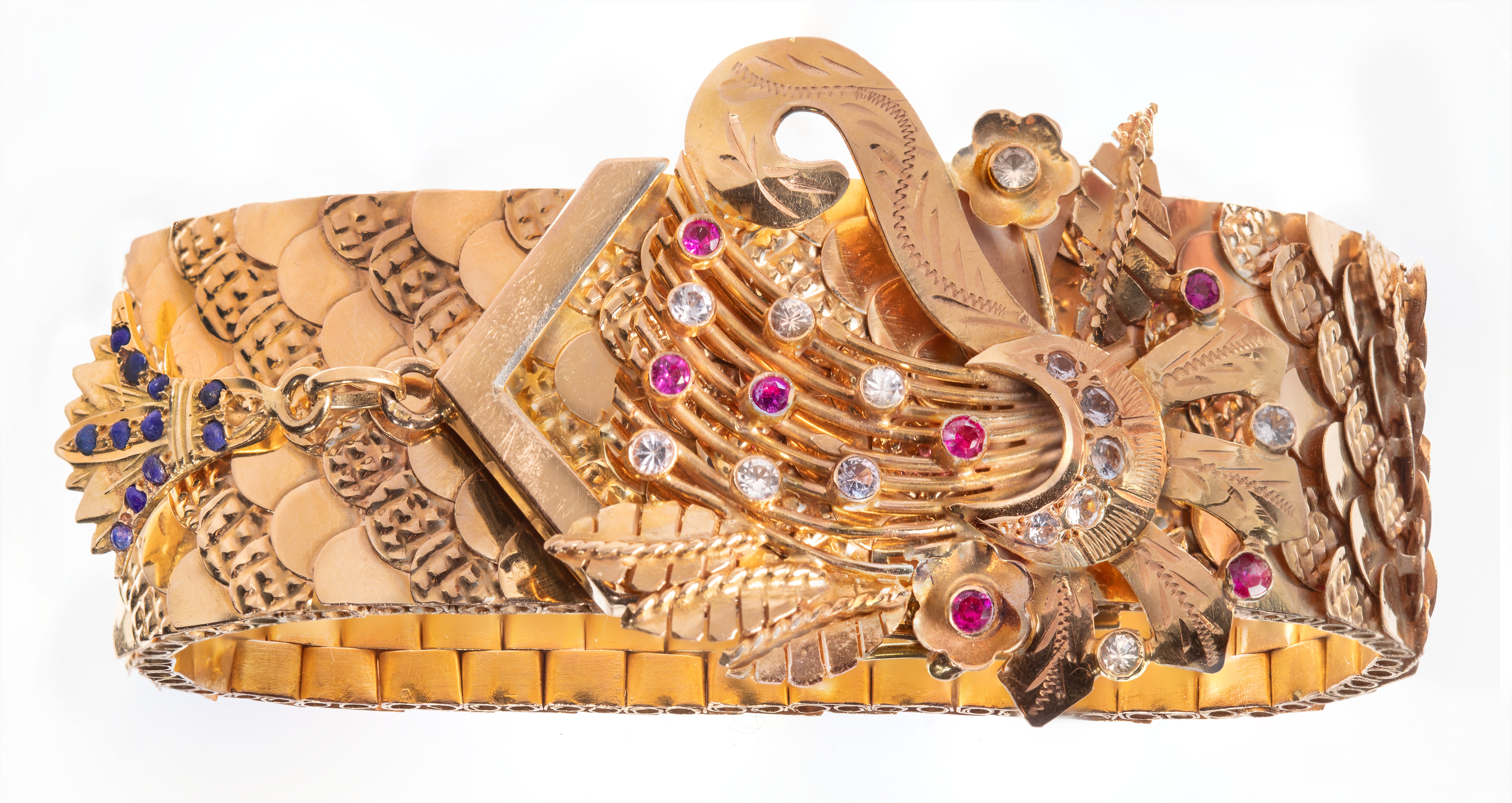A fish tail style bracelet having a buckle clasp accented with ball cut lapis lazuli, round cut rubies and diamonds (foreign marks)