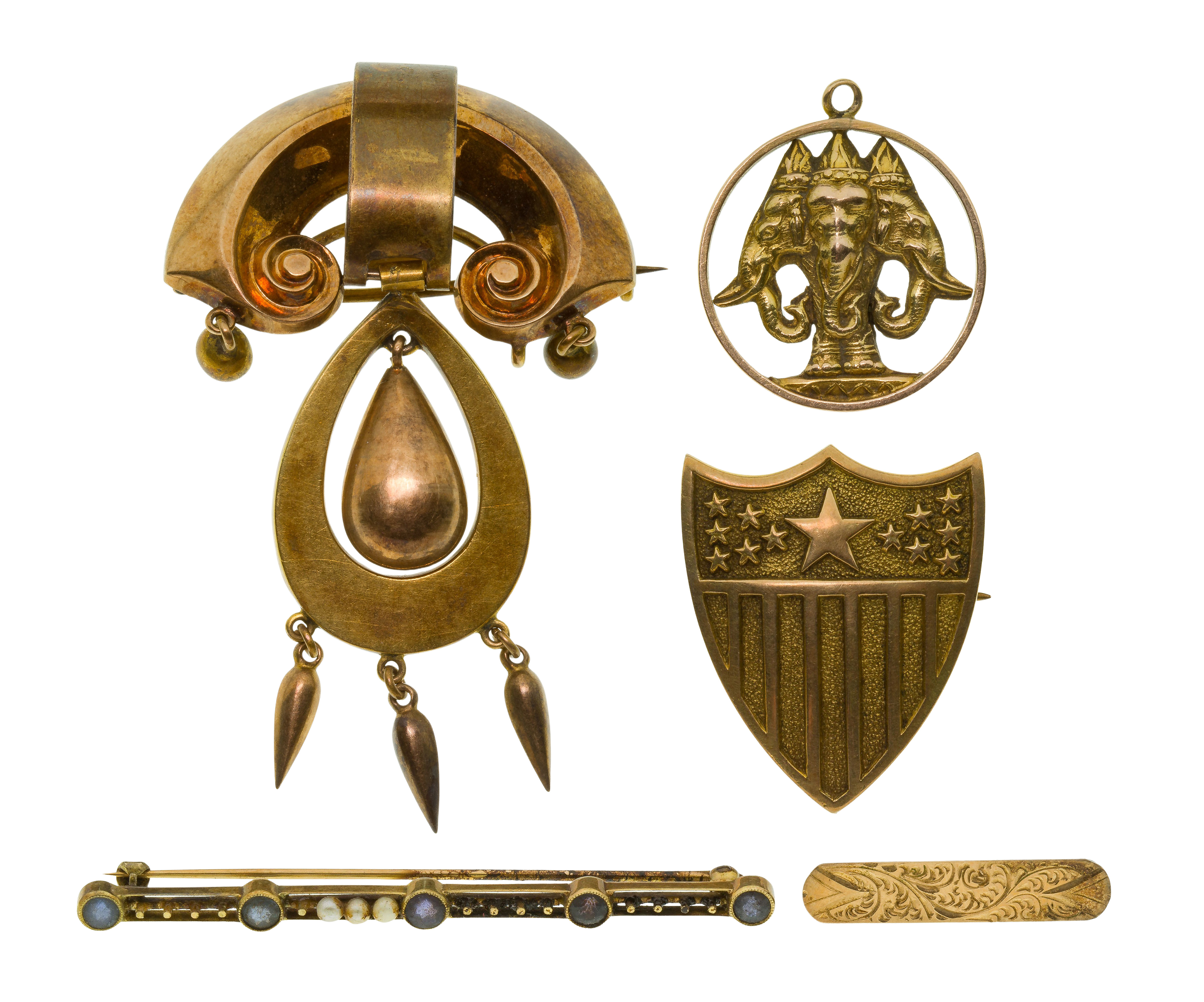 (5) items including a bar pin having semi-precious gemstones, a Victorian style dangle brooch pin, a patriotic shield pin, an elephant motif pendant and a beauty clip style pin (all unmarked)
