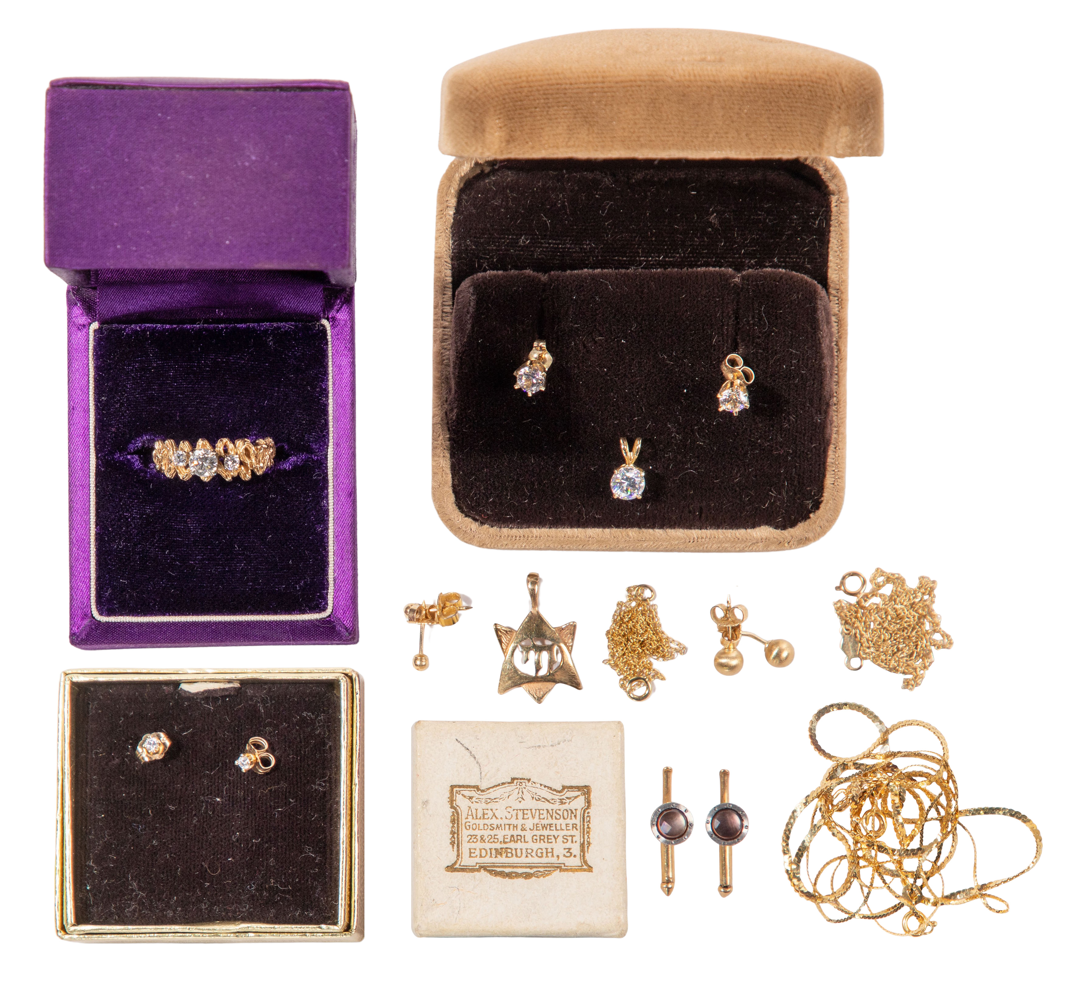 (10) items including a ring having a round cut diamond flanked with two diamonds, (4) necklaces, a cufflink set, (2) pairs of earrings, a star of David pendant and a cubic zirconia solitaire pendant and pair of earrings set (all marked ’14k’ / ‘585’)
