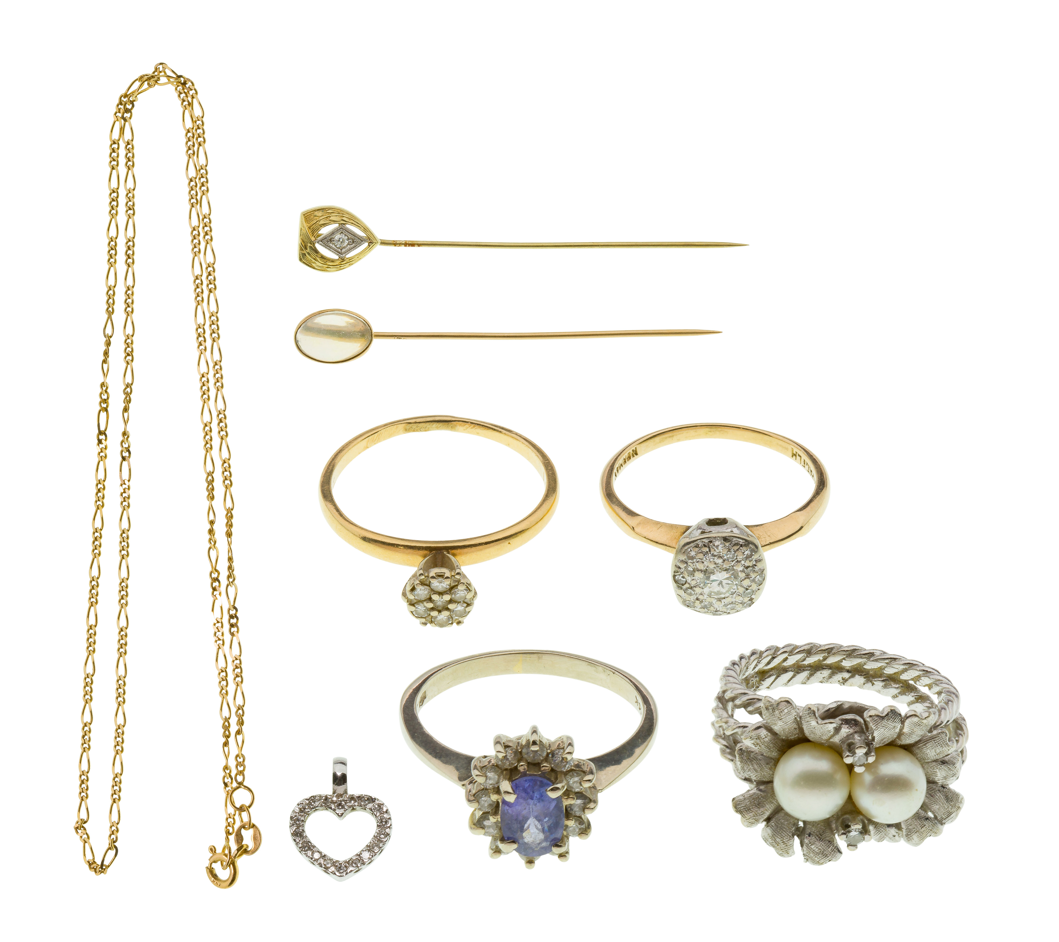(8) items including (2) diamond rings, a pearl ring, a tanzanite and diamond halo ring, (2) stick pins, a white gold and diamond heart pendant and a figaro link necklace (some marked ’14k’)