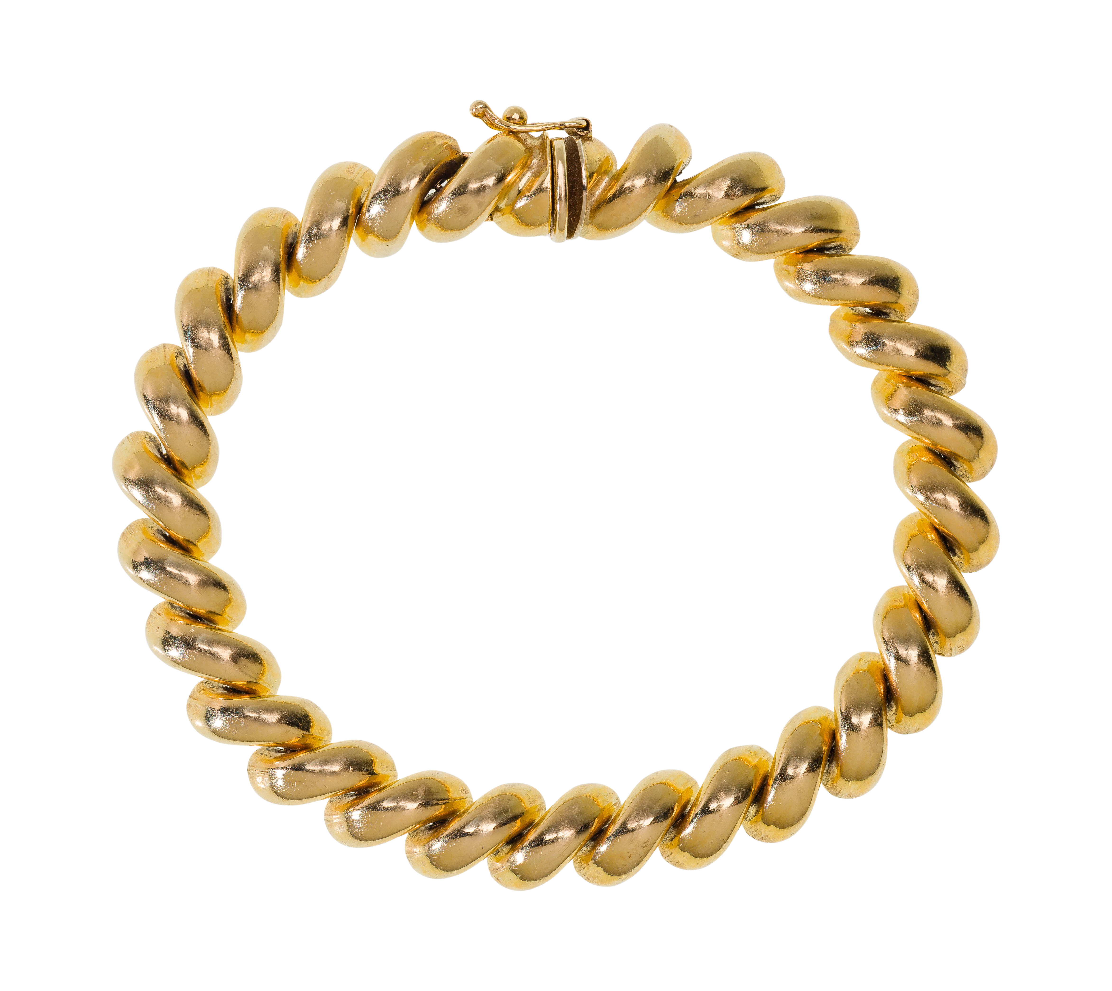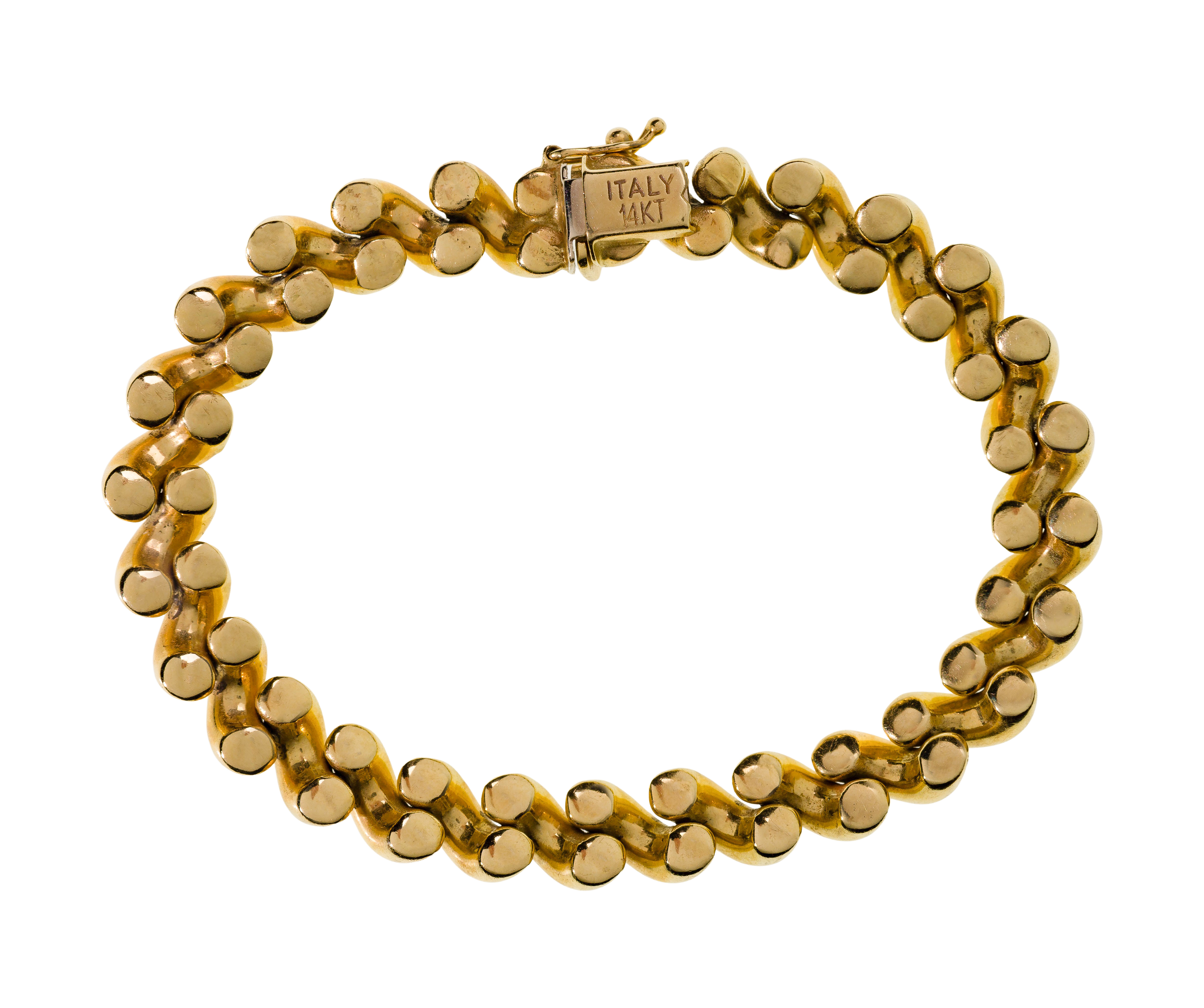 A 0.25-inch wide San Marco style bracelet having smooth interlocking links, polished and flat on the backside (marked ’14k’ on clasp)