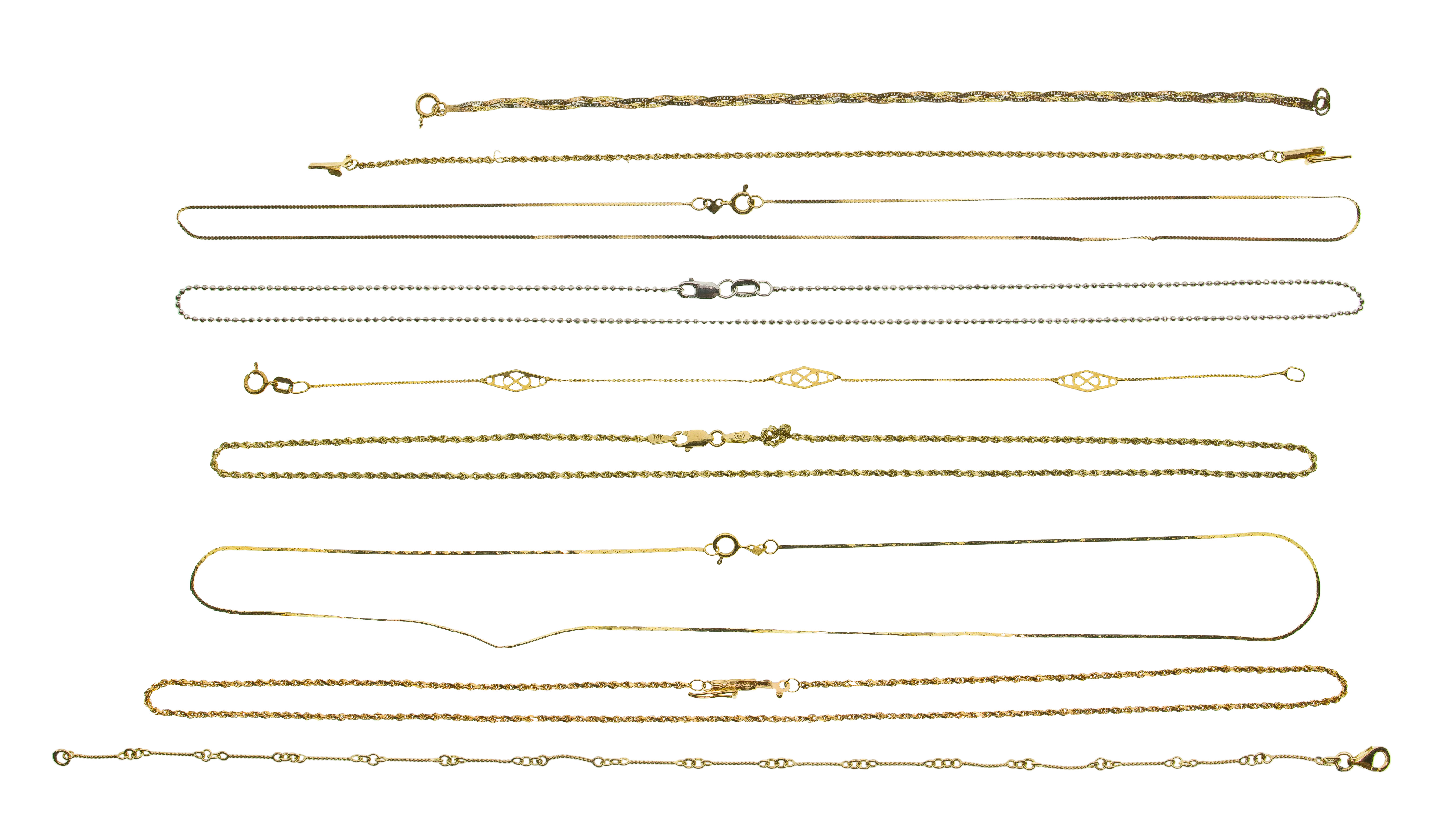 (10) items including a chain style necklace (marked ’18k’), (5) chain style necklaces and (4) chain style bracelets (all marked ’14k’)