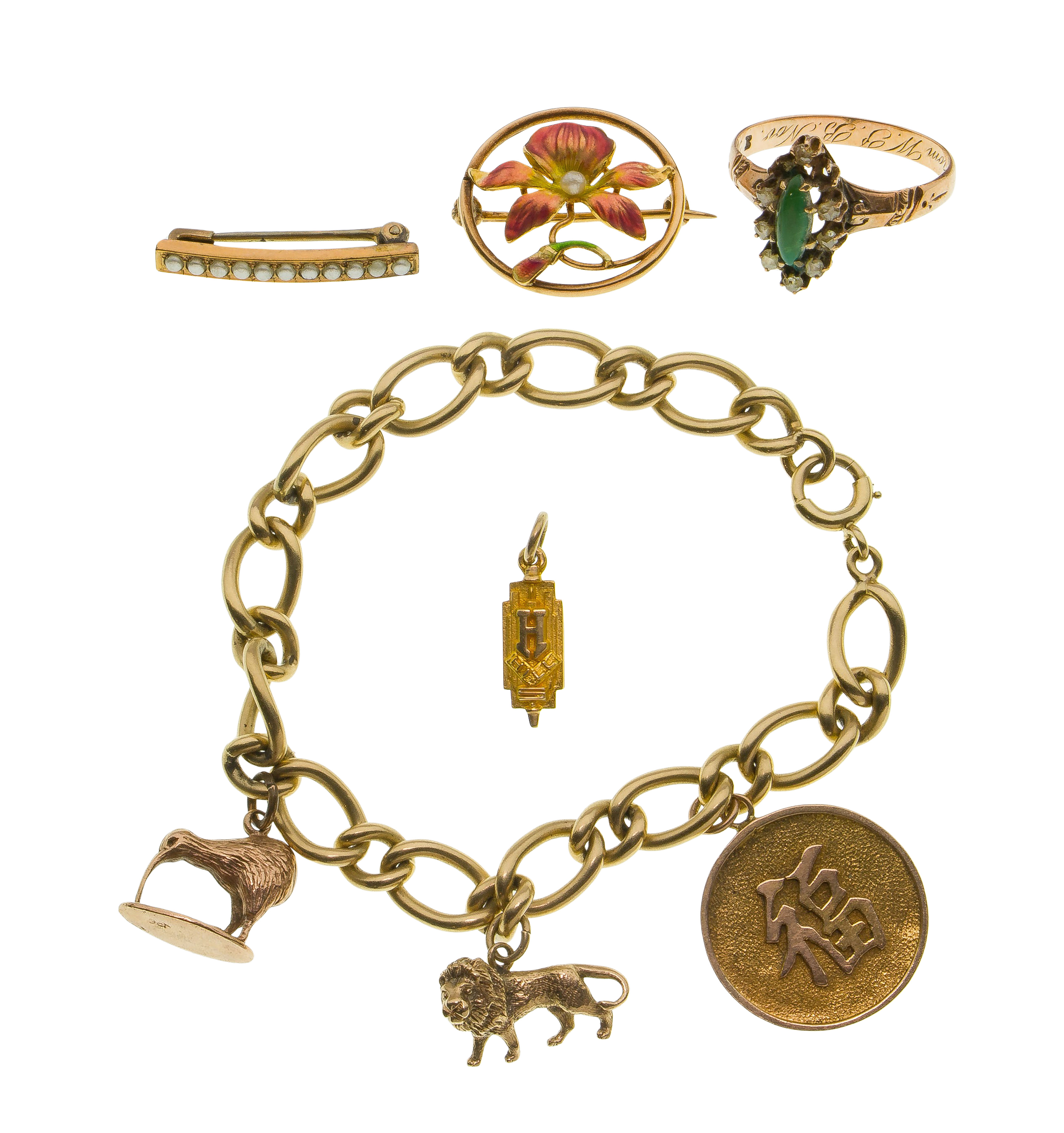 (5) items including a bracelet having animal themed charms, a semi-precious green gemstone and diamond ring, a enameled floral motif pin, a seed pearl beauty clip pin and a high school pendant