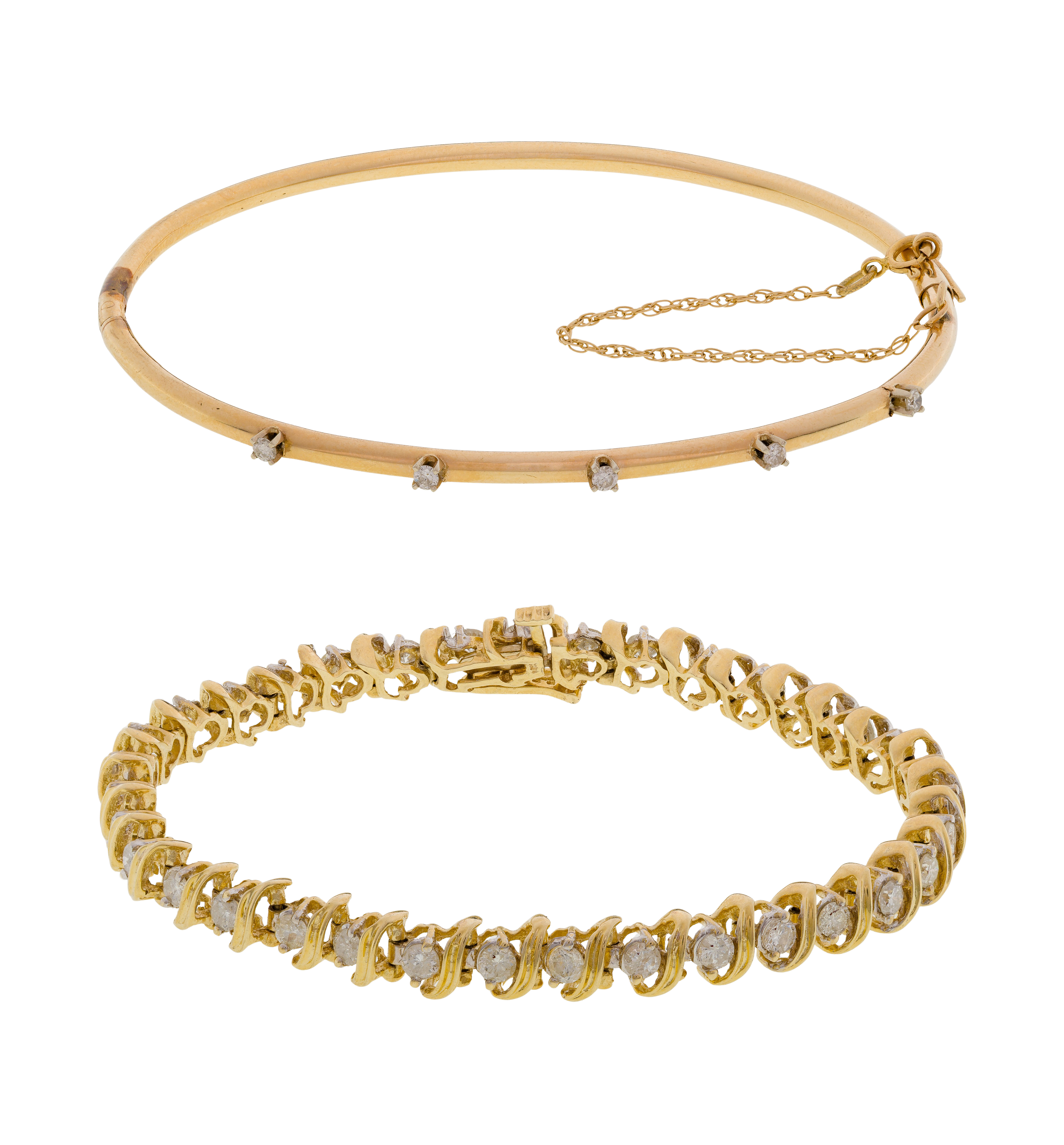 (2) items including an S-link tennis bracelet having thirty-five round cut diamonds and a hinged bangle bracelet accented with five round cut diamonds in raised settings (marked ’14k’)