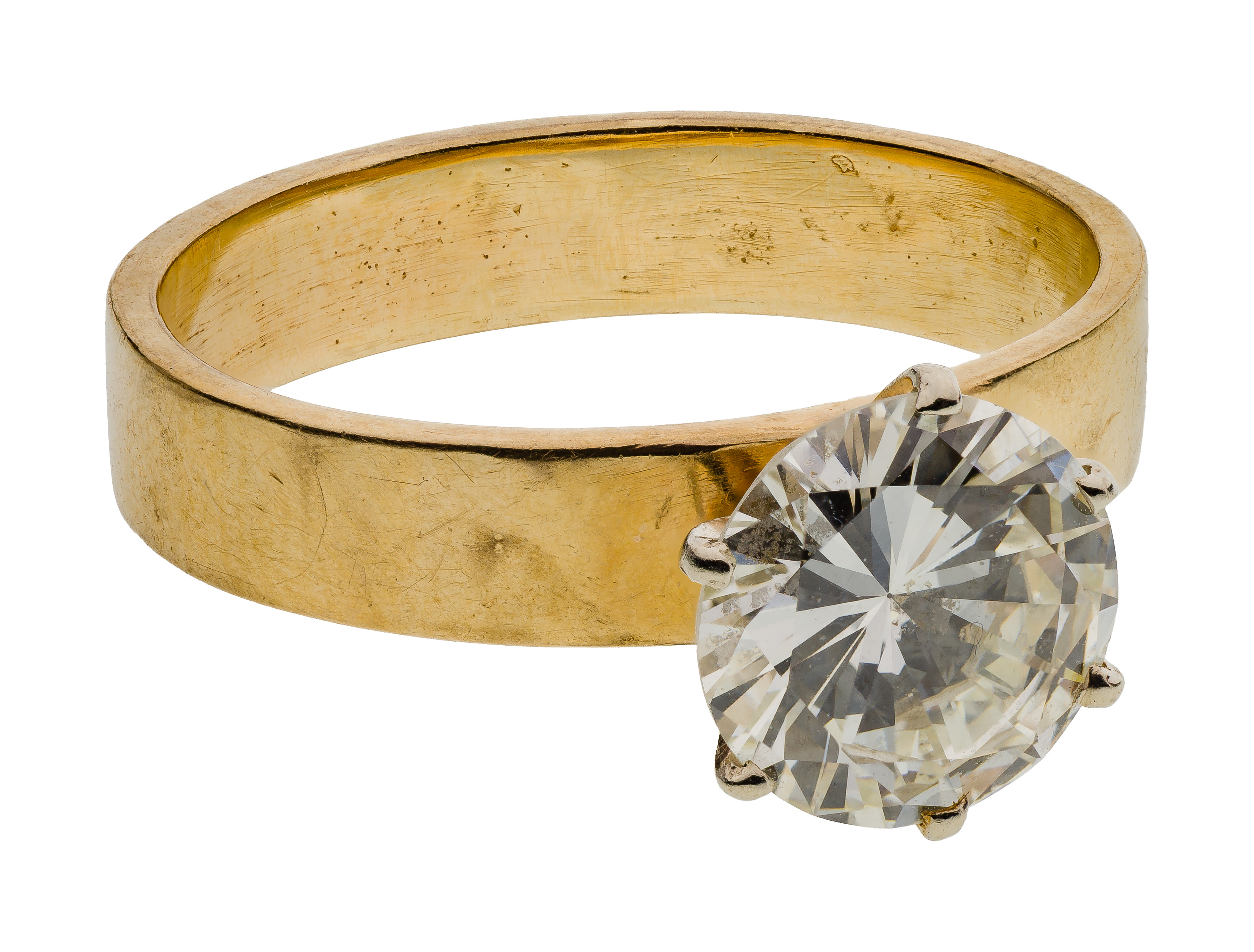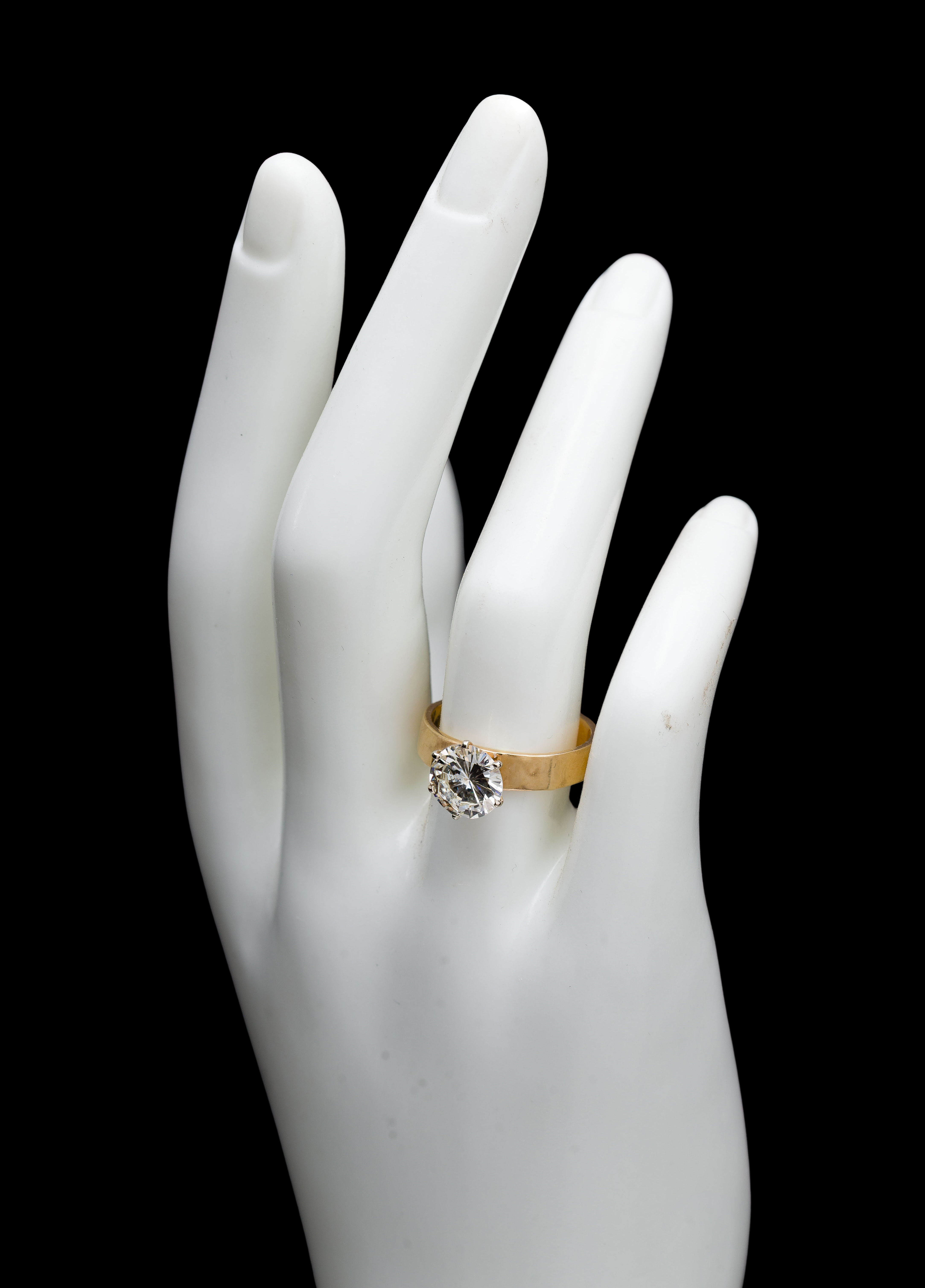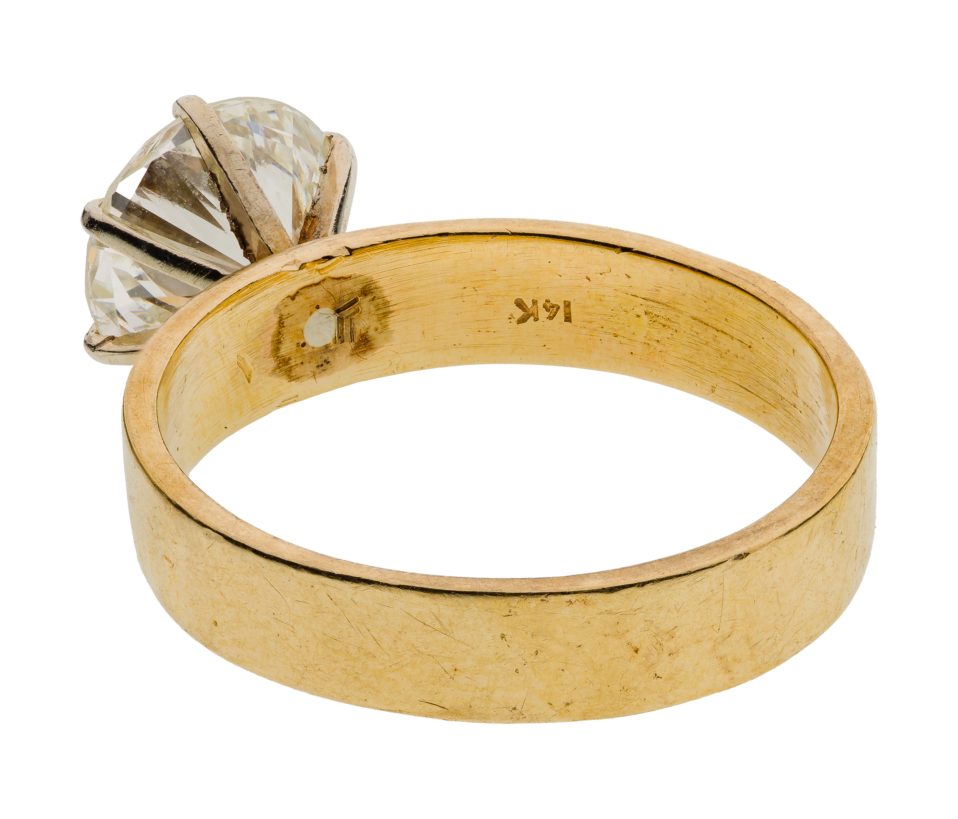 Solitaire style, centering on a prong set round brilliant cut diamond weighing approximately 1.88 carats (8.25 x 8.31 x 4.5mm), K-L color (light brown), VS-2 clarity, no to very light fluorescence noted