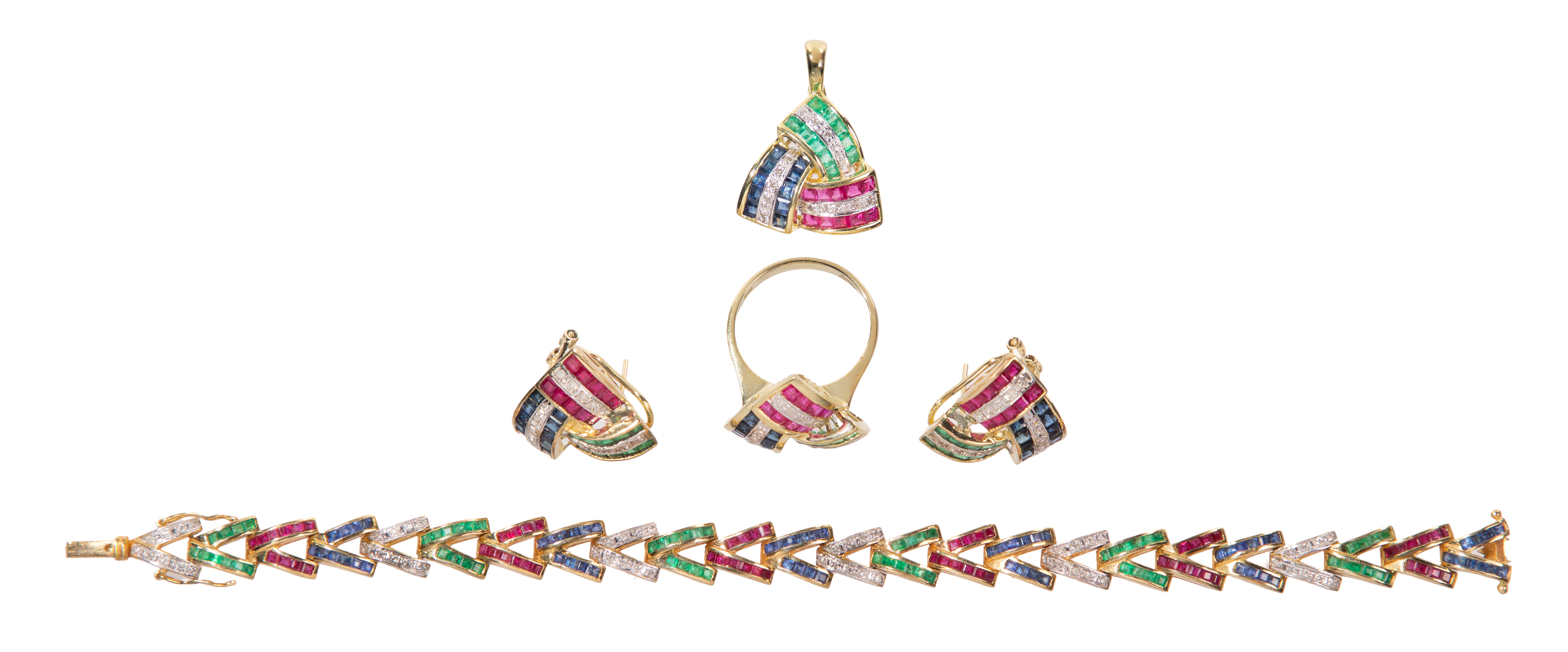 (4) items including a bracelet, a pendant, a ring and a pair of earrings, all having princess cut emeralds, rubies, blue topaz and round cut diamonds (all marked ’14k’)