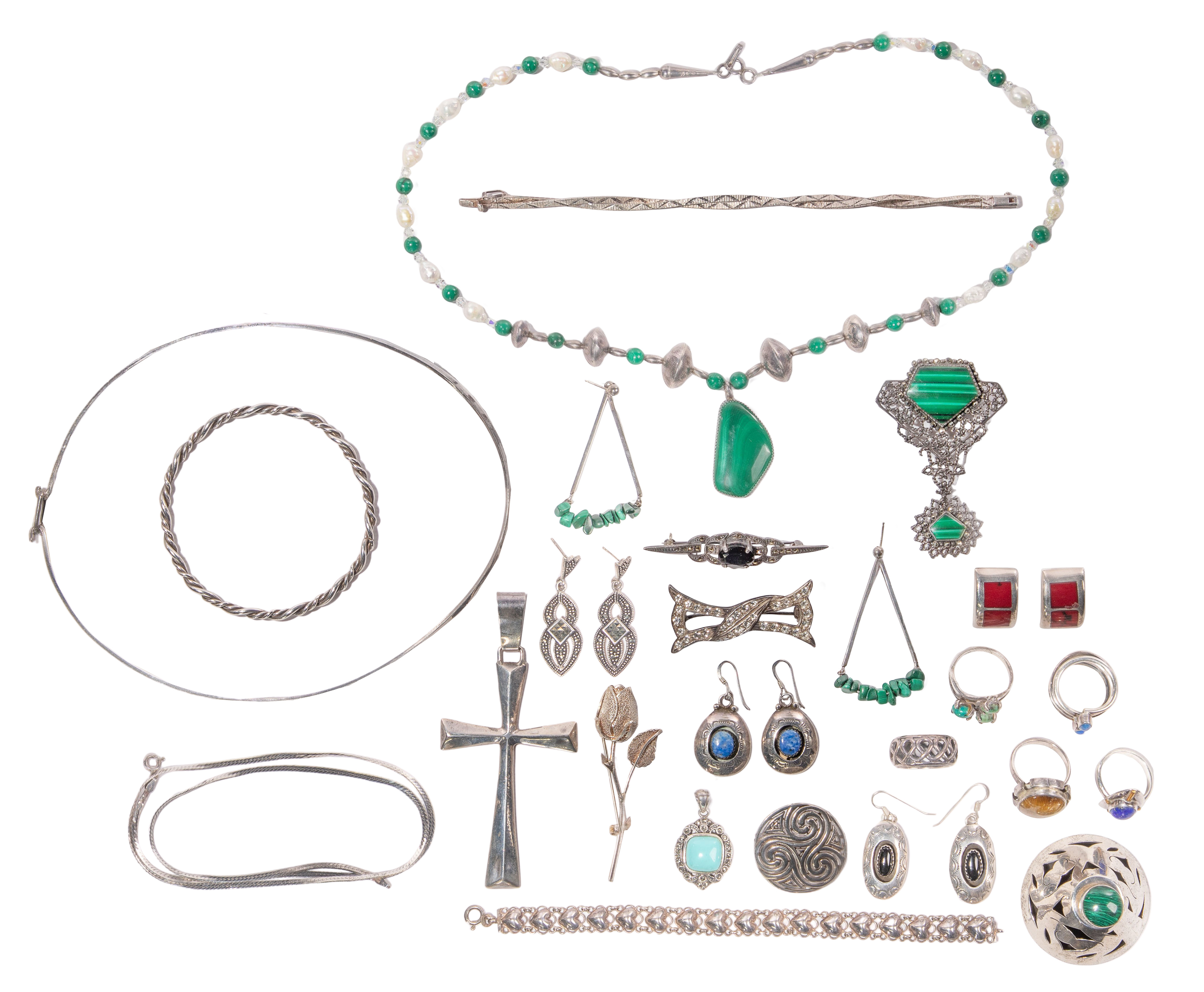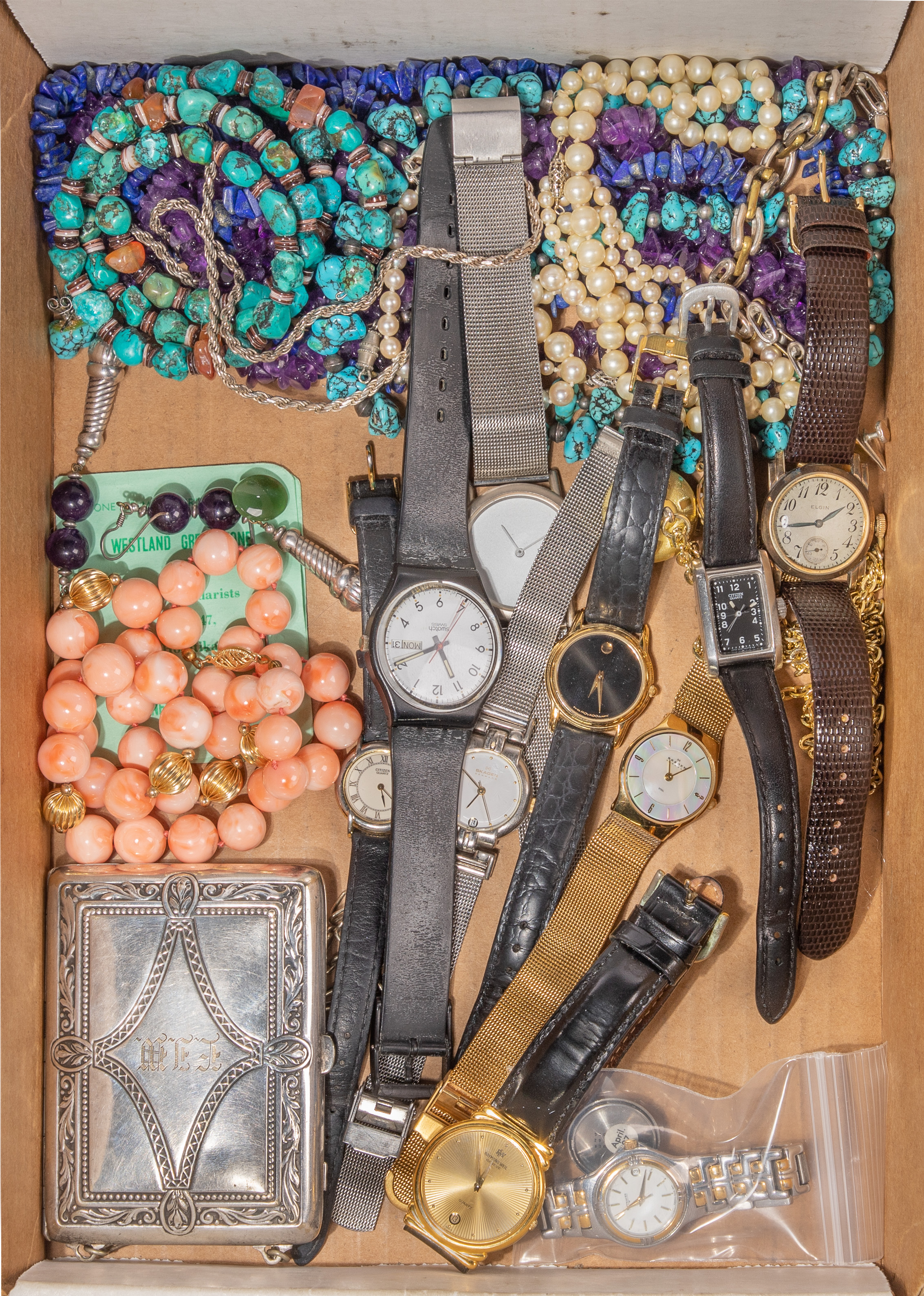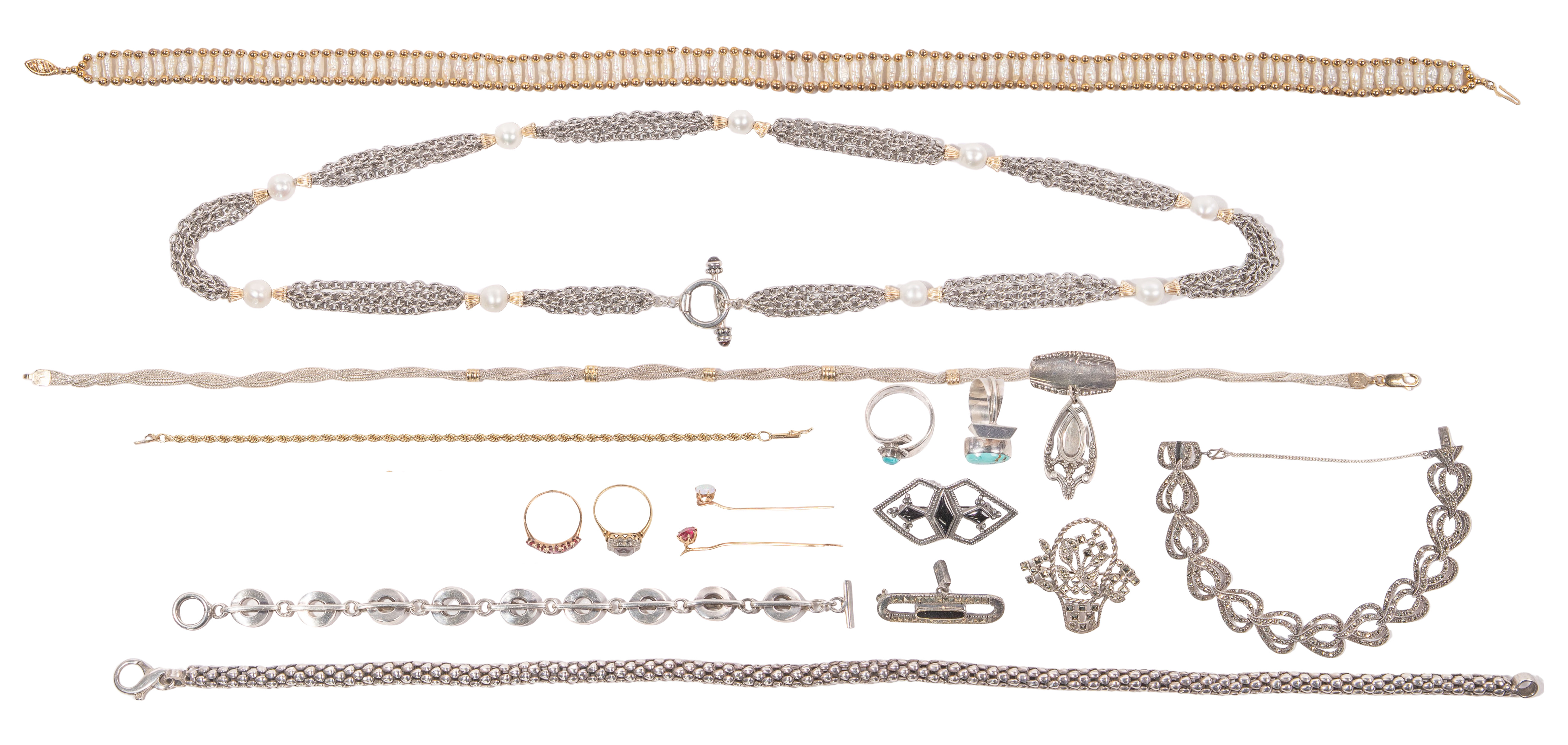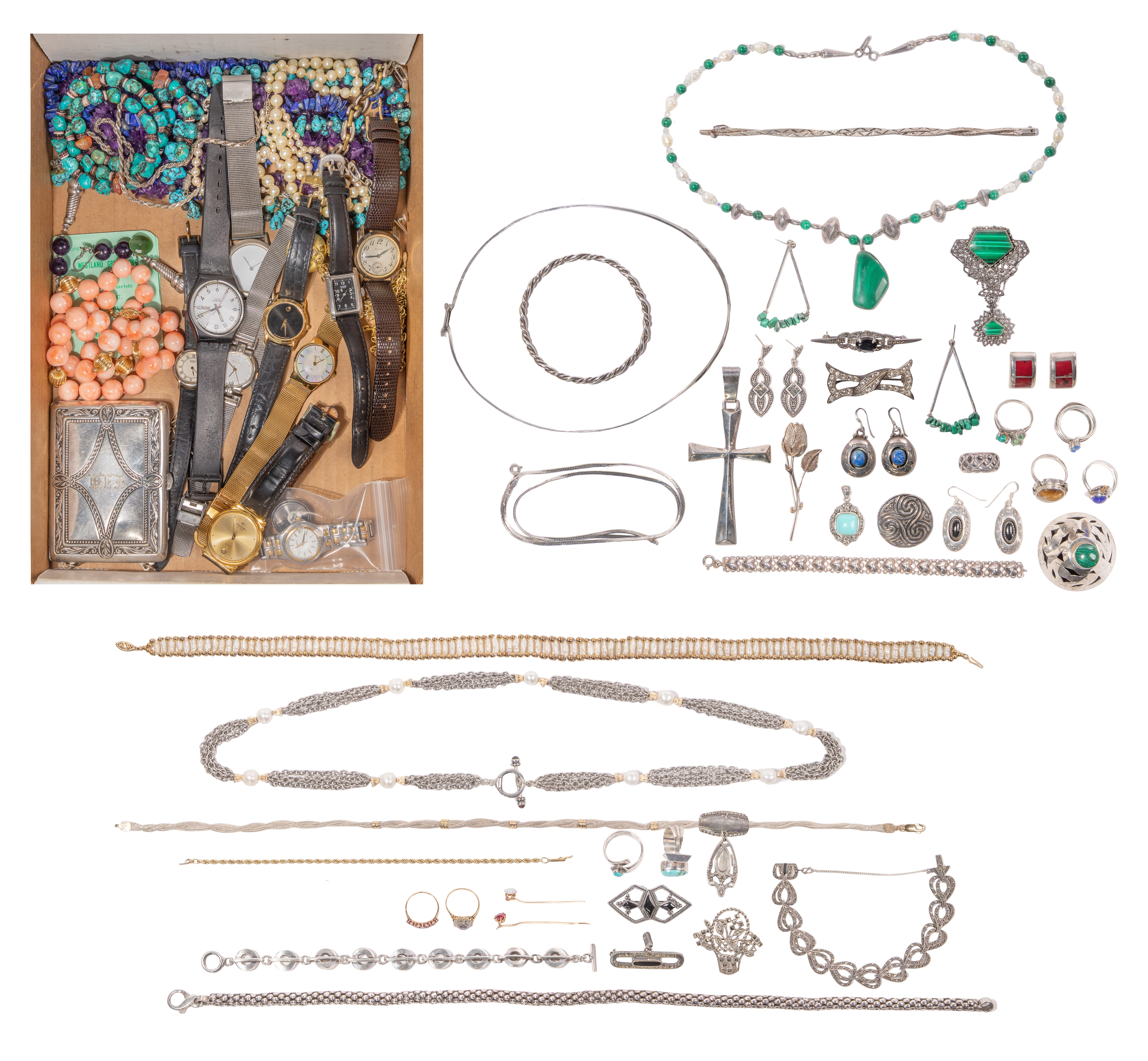 Including a freshwater pearl and bead necklace (marked ’14k’), a silver and gold trim braided rope necklace, a silver and a gold trim pearl necklace (both marked ’14k’ / ‘925’), a semi-precious pink gemstone ring, a rope bracelet, a semi-precious red gemstone ring and (2) stickpins having semi-precious gemstones (one marked ’10k’), assorted necklaces, bracelets, rings, pins and earrings (some marked ‘925’ / ‘sterling’) and costume jewelry wristwatches and necklaces as well as a German silver dance hall change purse