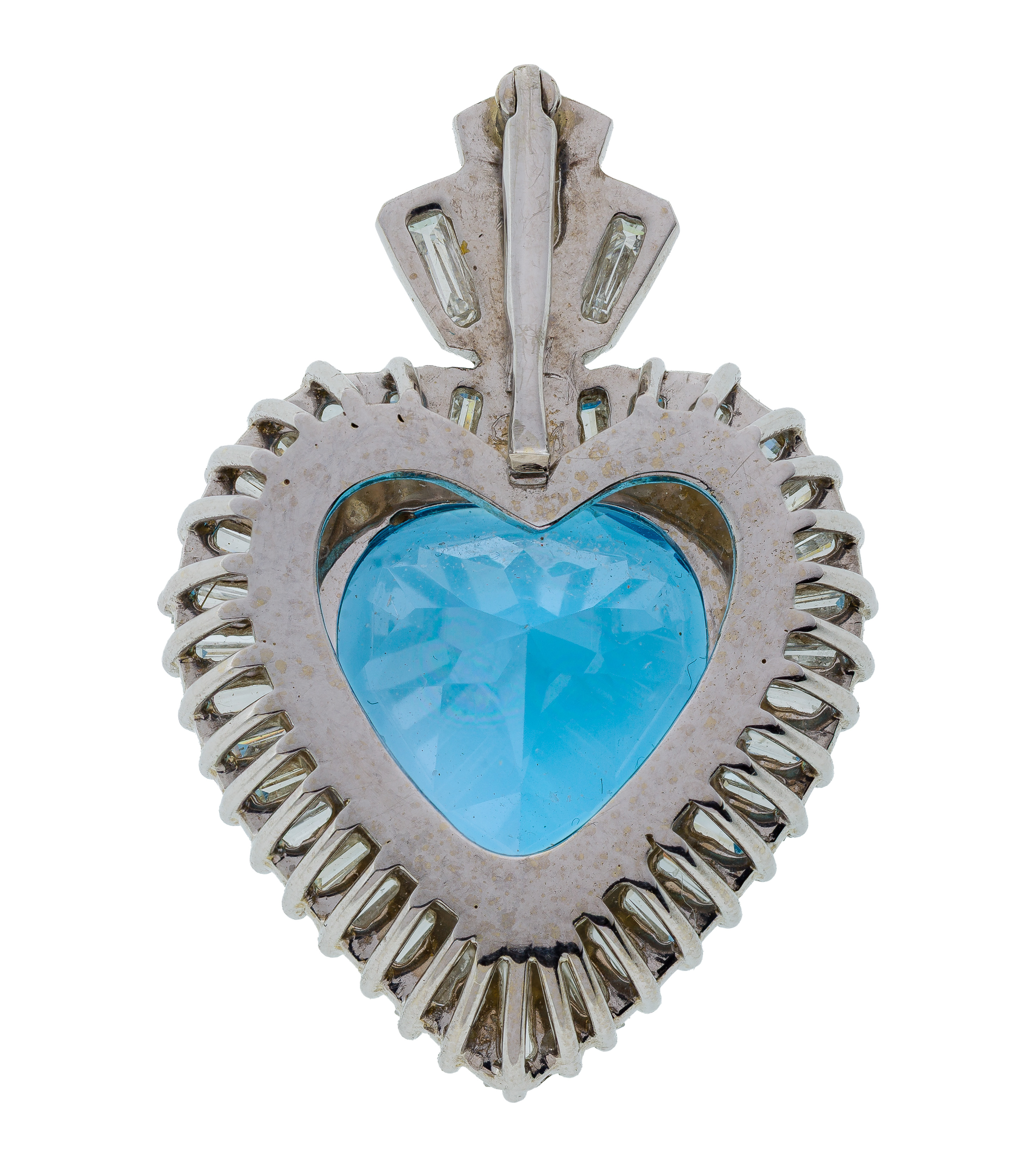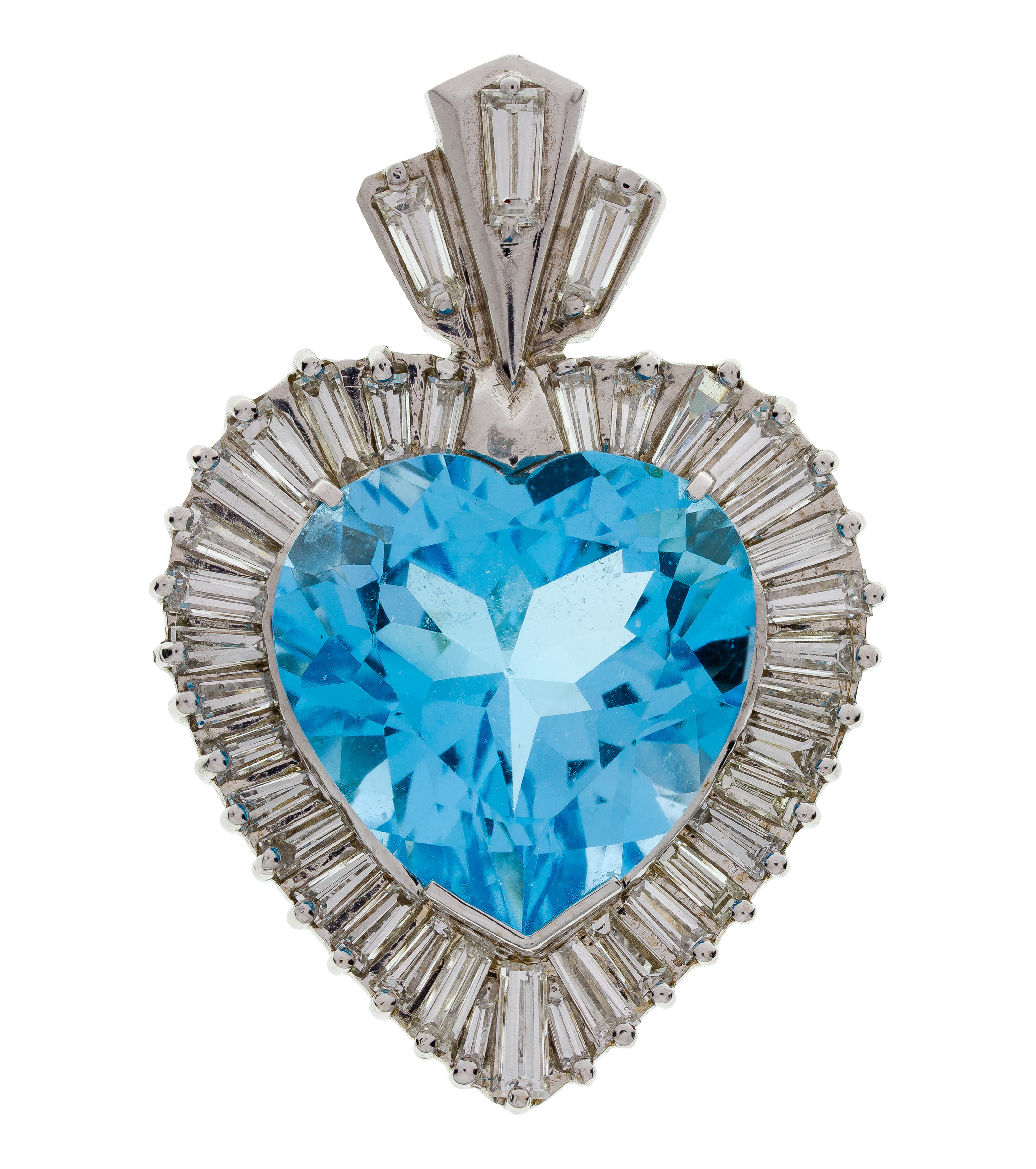 Having a heart cut blue topaz (approximately 16.7 x 16.2 x 9.7mm) surrounded by approximately thirty-eight tapered baguette cut diamonds (marked ’14k’)