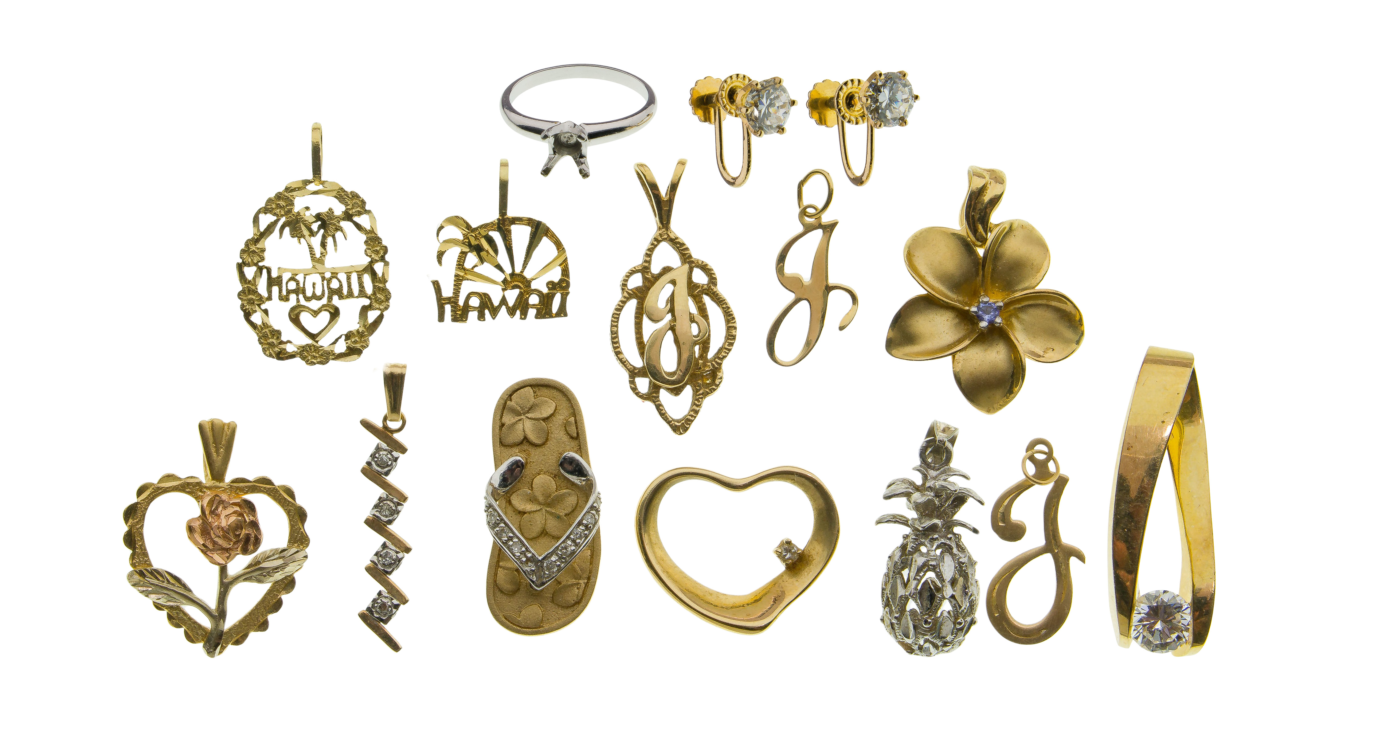 (14) items including (12) pendants / charms, a pair of crystal screw back earrings and a solitaire ring setting (all marked ’14k’ / ‘585’)