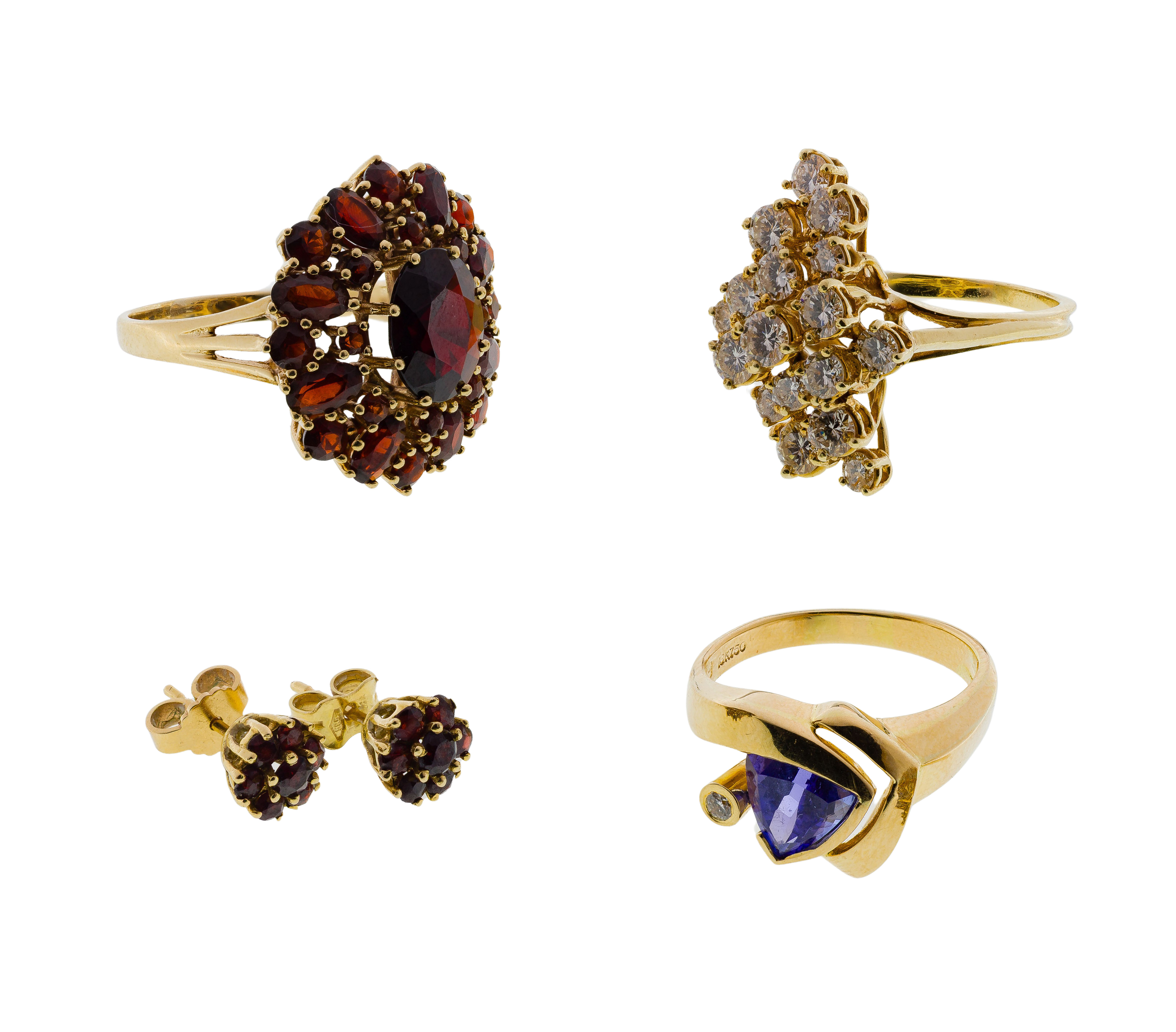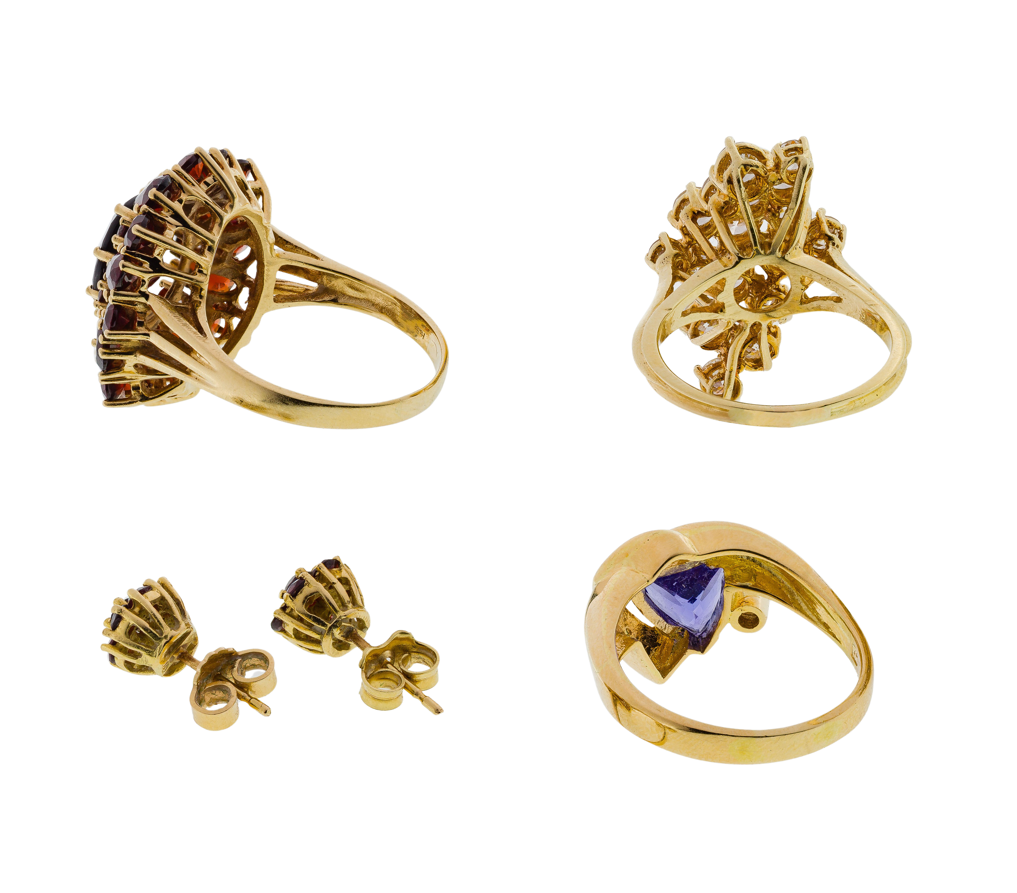(4) items including a ring having a cluster of fourteen round cut diamonds, a ring having various cuts of garnets, a pair of pierced earrings having round cut garnets and a ring having a purple cubic zirconia flanked by a round cut diamonds (all marked ’18k’ or ‘750’)