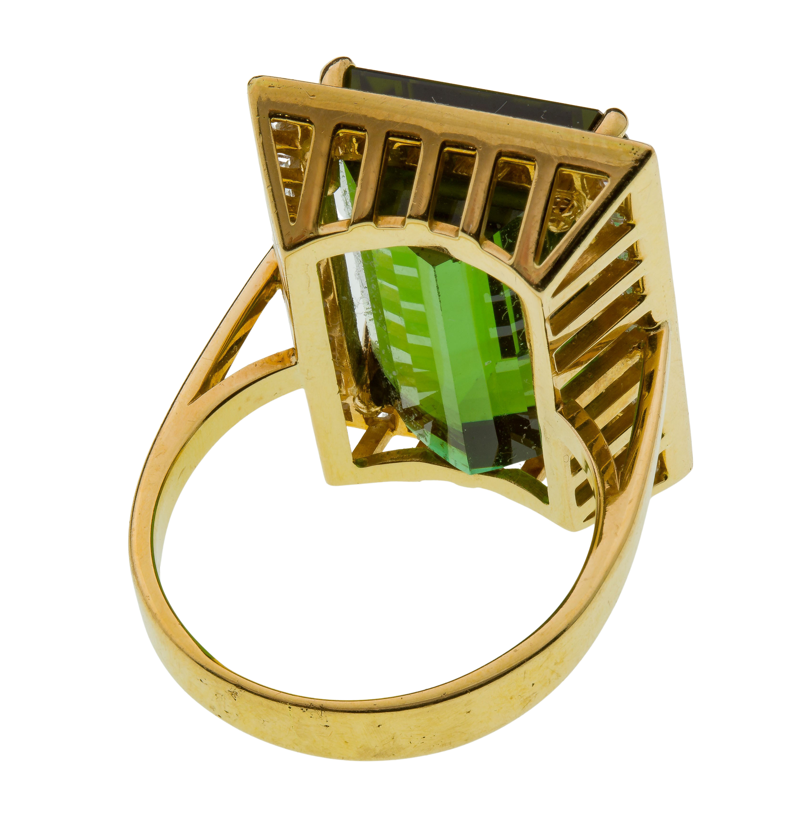 A cocktail ring having a center green tourmaline (approximately 17.2mm by 12.9mm) surrounded by thirty princess cut diamonds (marked ’18k’)