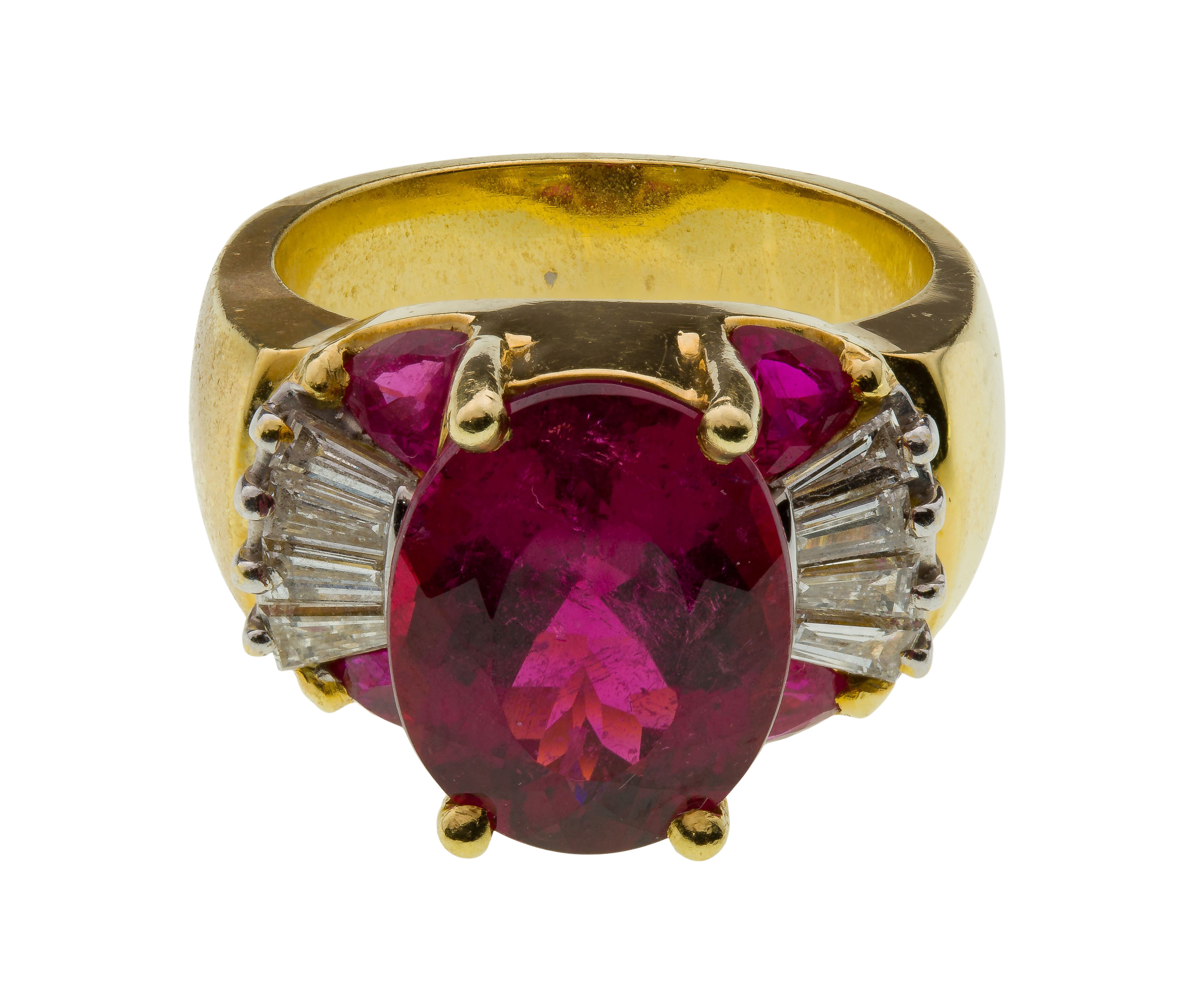 Having an oval cut center gemstone flanked on each side by four tapered diamond baguettes and two trillion cut rubellite tourmaline (marked ’18k’), having COA