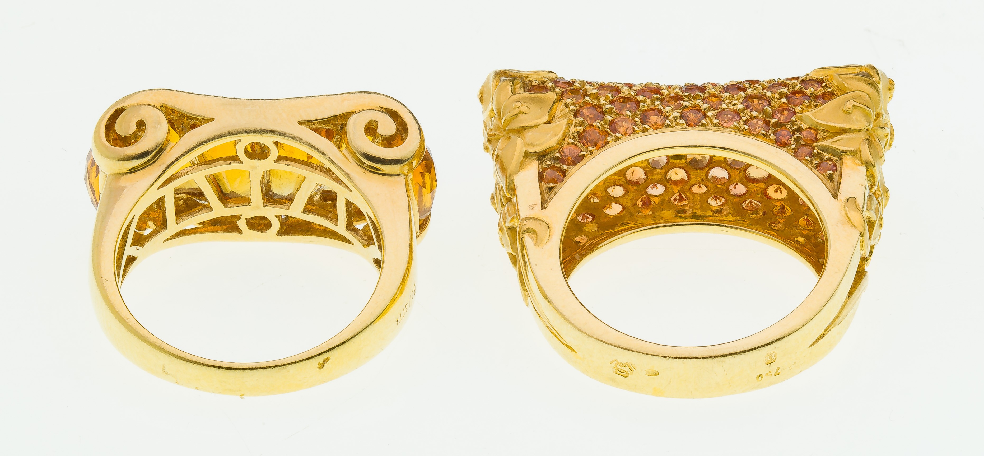 (2) items including a channel set citrines into a scroll shaped setting (marked ‘K18’) and a round cut citrines set into an open-backed grid with floral motif at ends (unmarked)