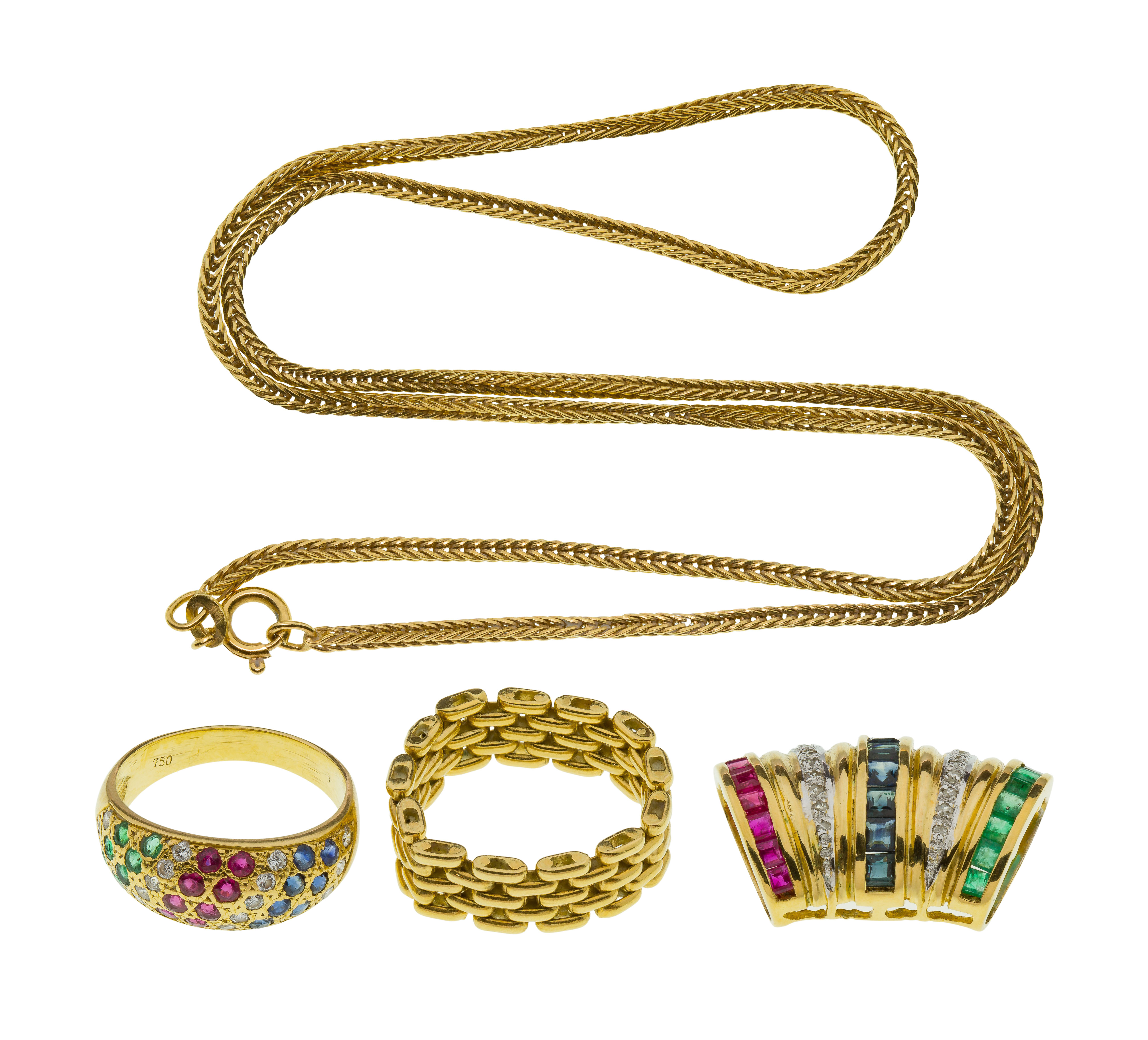 (4) items including a necklace slide pendant having round cut diamonds flanked by princess cut rubies, sapphires and emeralds, a ring having round cut diamonds flanked by round cut rubies, sapphires and emeralds, a link ring and a necklace (all marked ’18k’ or ‘750’)