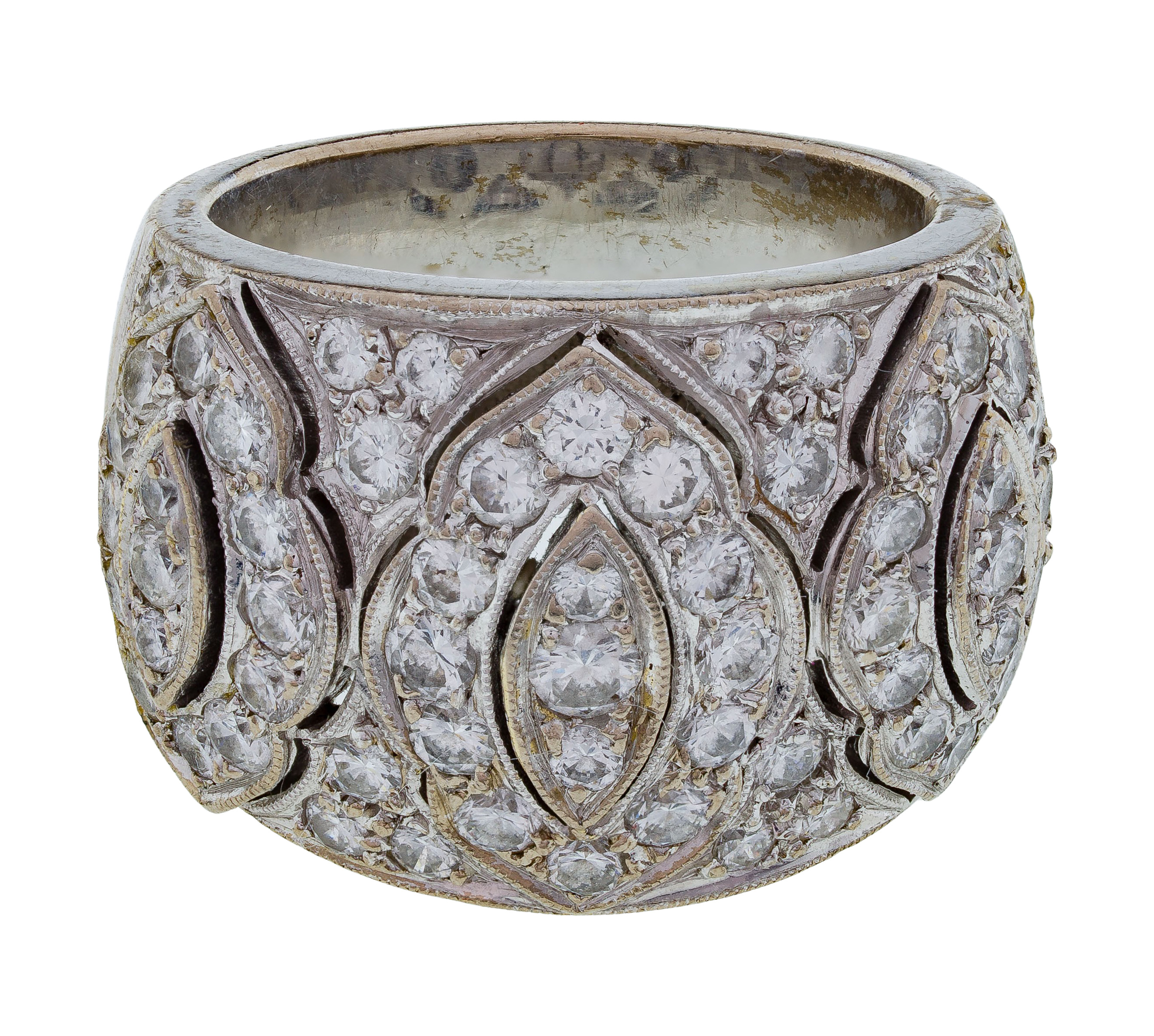 Having three oval medallions containing sixty-nine round cut diamonds in an open-backed setting, diamonds weighing approximately 1.60 carats total (marked ’18k’ / ‘750’)