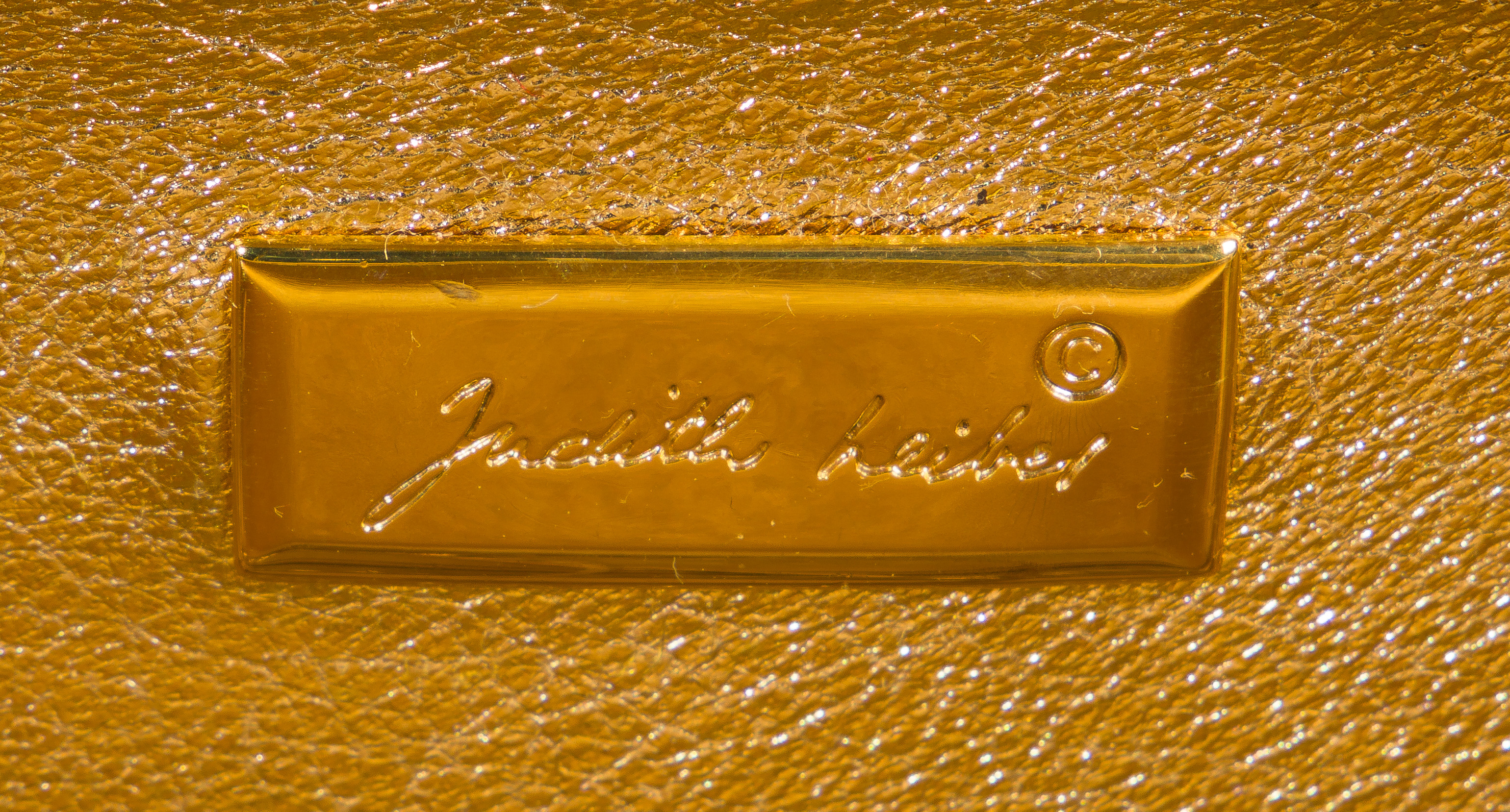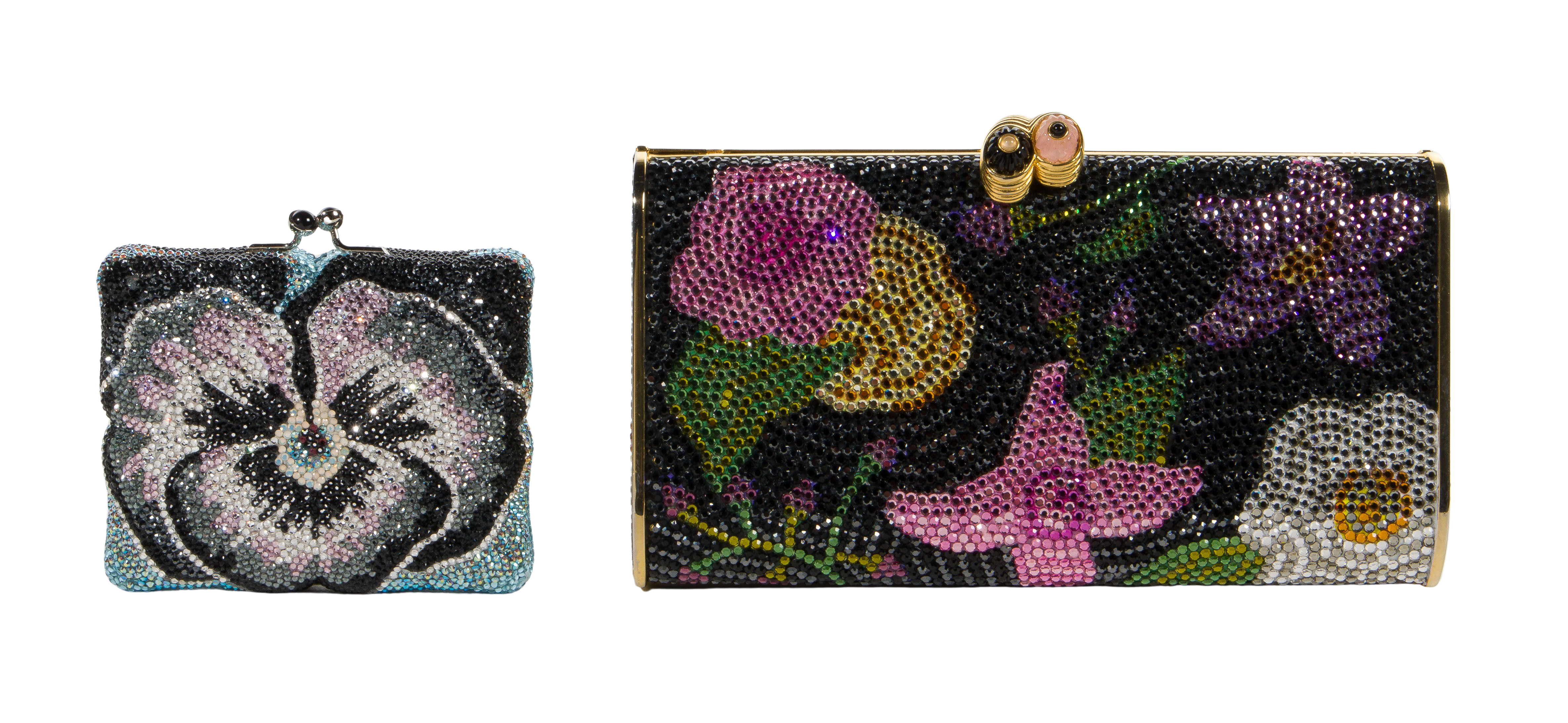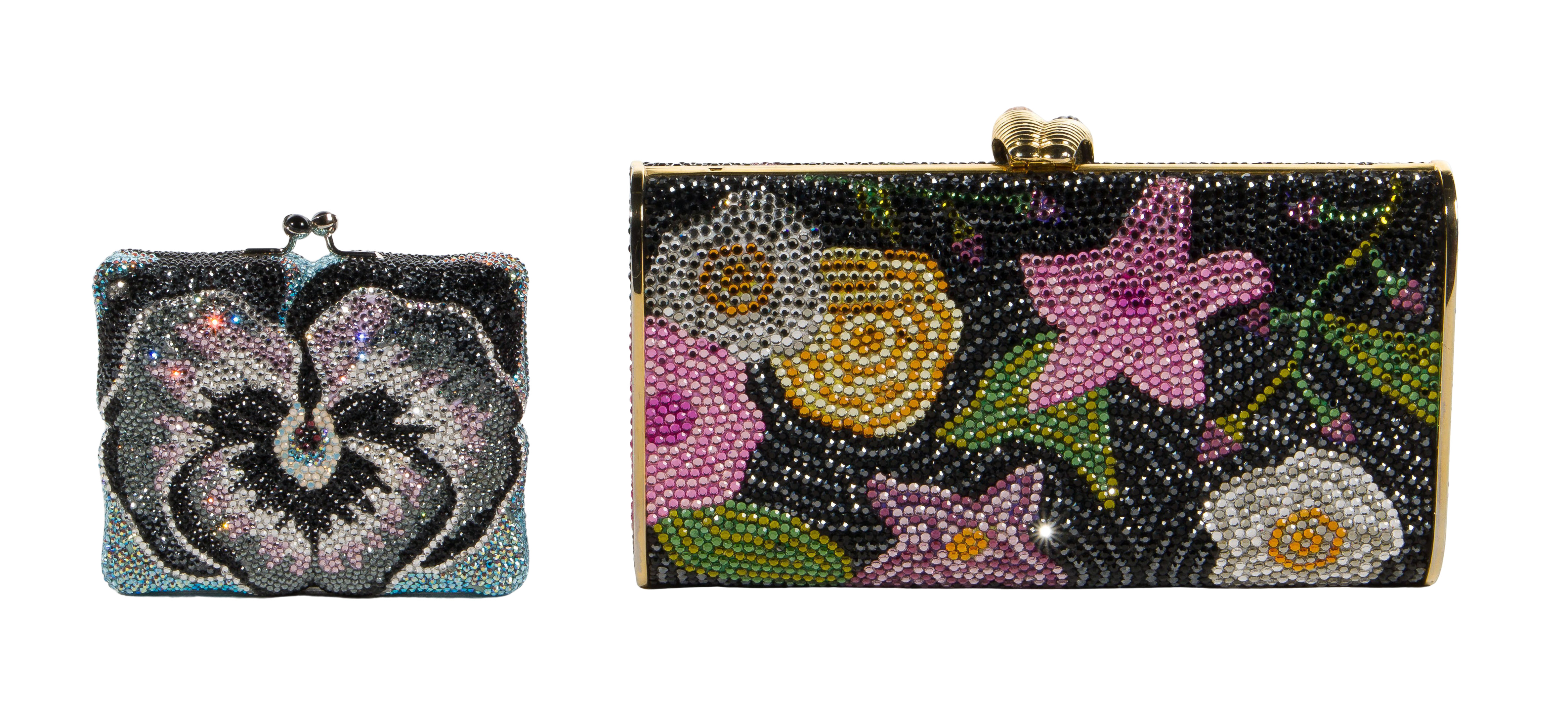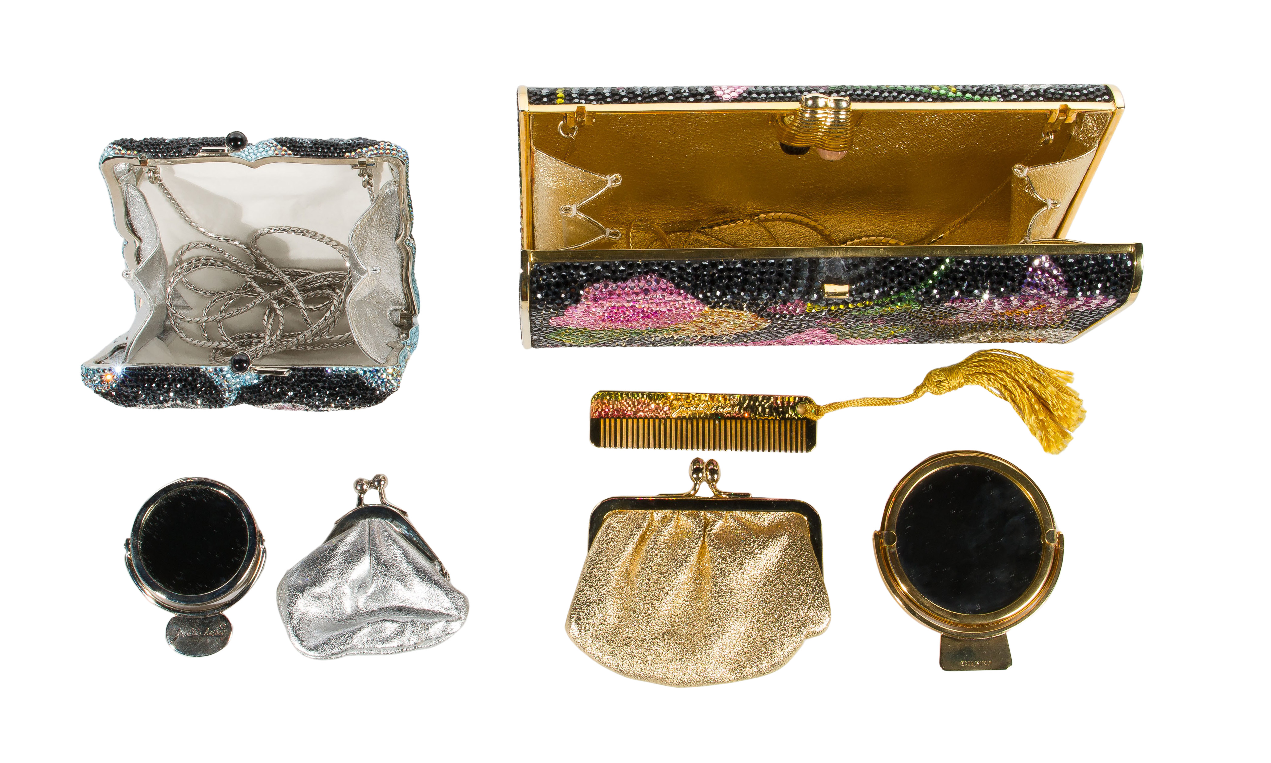 (2) items including a rectangle shape in a floral motif embellished in colored crystals of clear, white, black, green and gold, clutch / shoulder strap having an 18-inch drop, gemstone clasp opening to a gold-tone leather interior, a gold-tone maker tag, also marked on edge, including a hand mirror, comb, change purse as well as a square-shaped floral embellished in colored crystals of silver, black, white, blue and pink, opening to a silver-tone leather interior, including a comb, mirror and change purse and silver-tone metal maker tag, also marked on edge, including box and dust bags