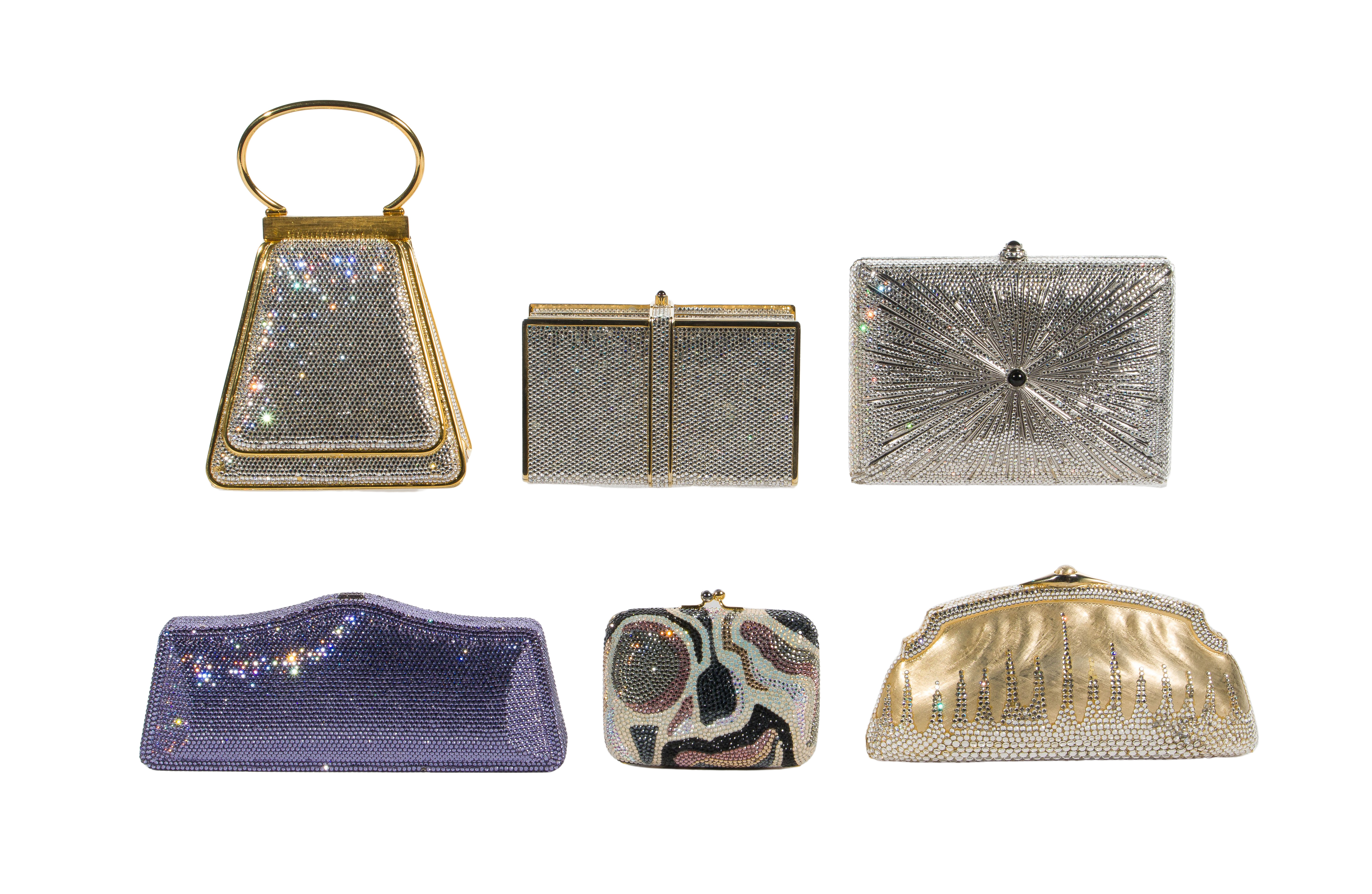 (6) items of different sizes, shapes, colors and motifs, all embellished in crystals, gold- or silver-tones, most having mirror, change purse and comb, all having dust bags and boxes