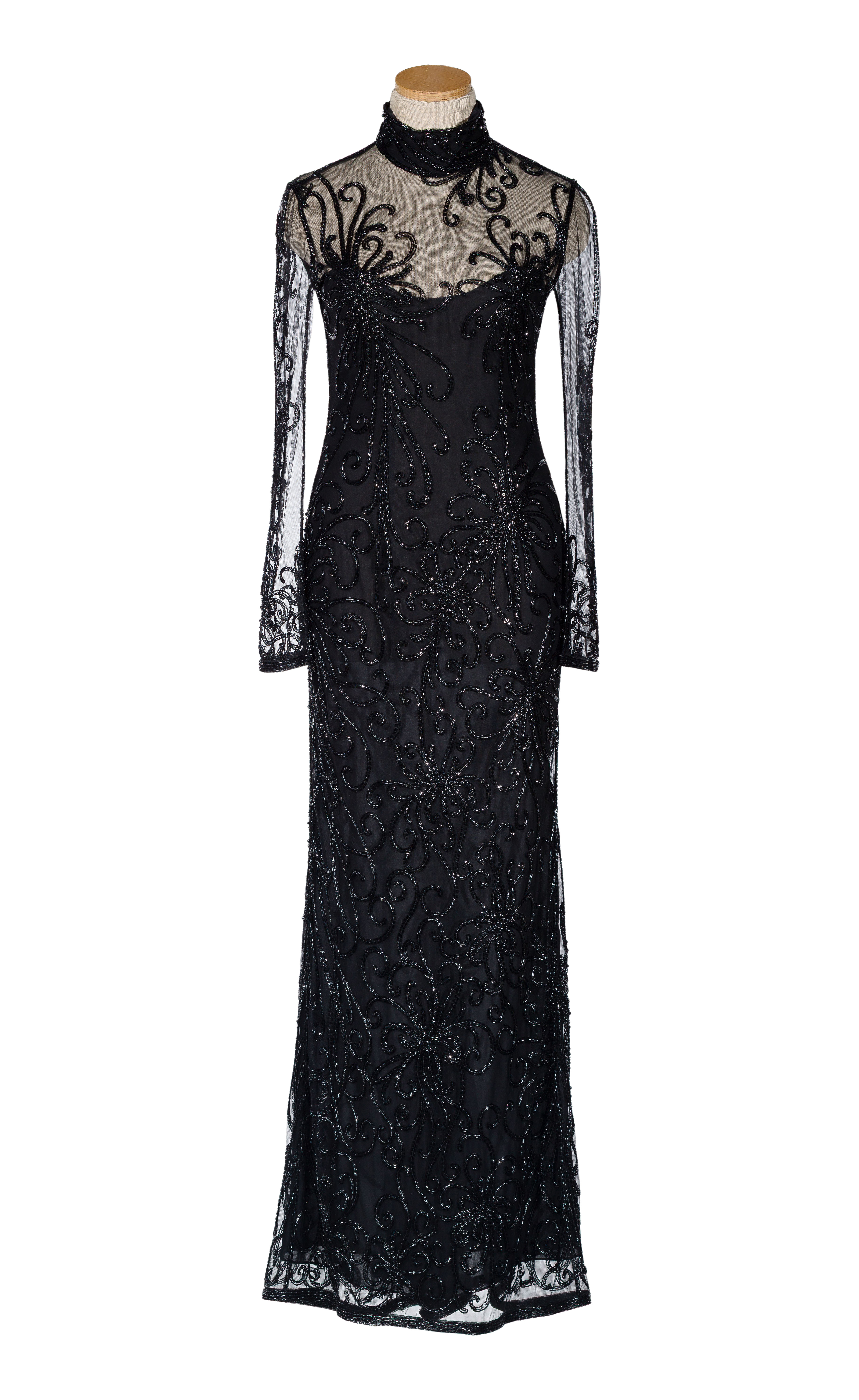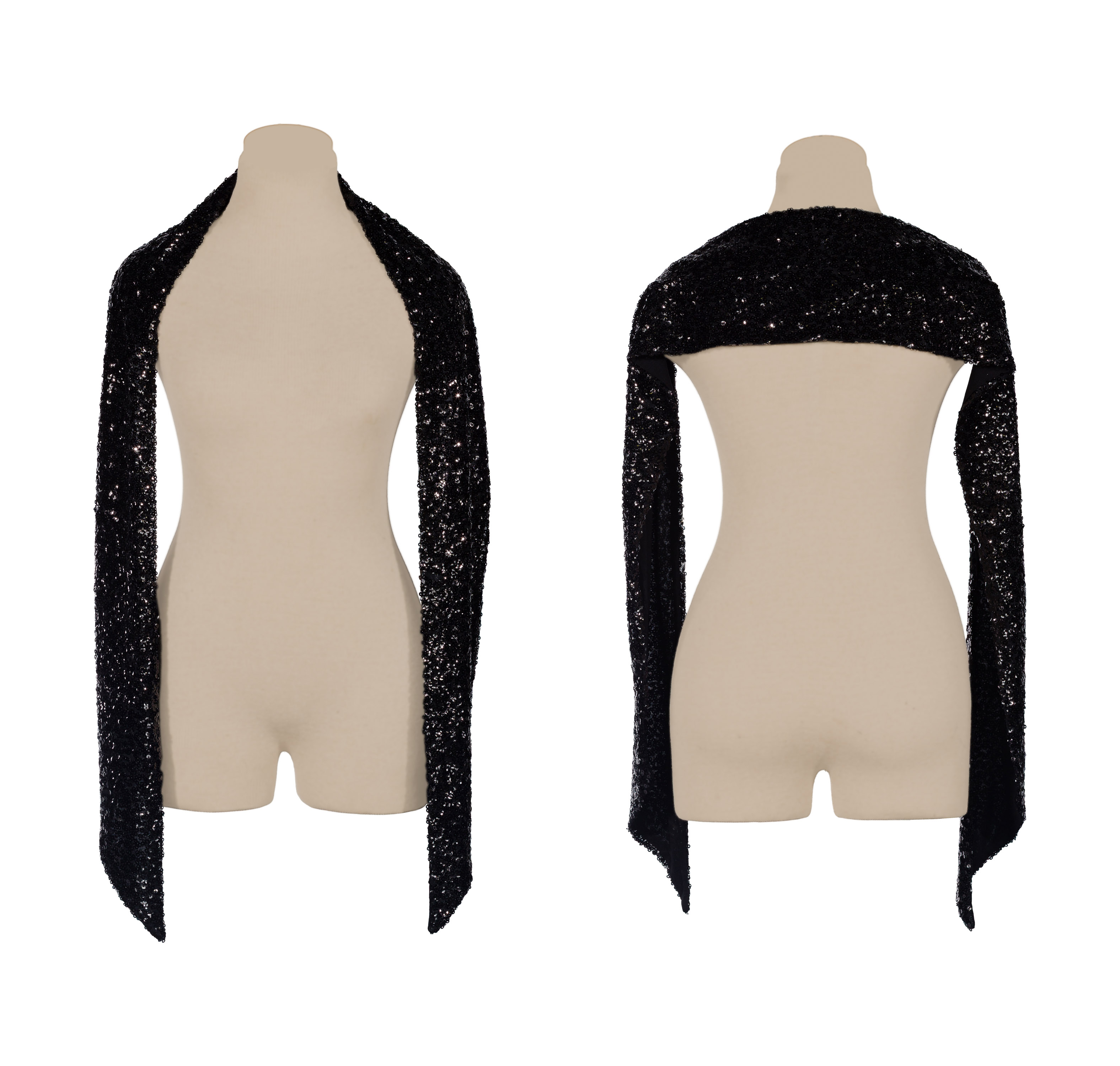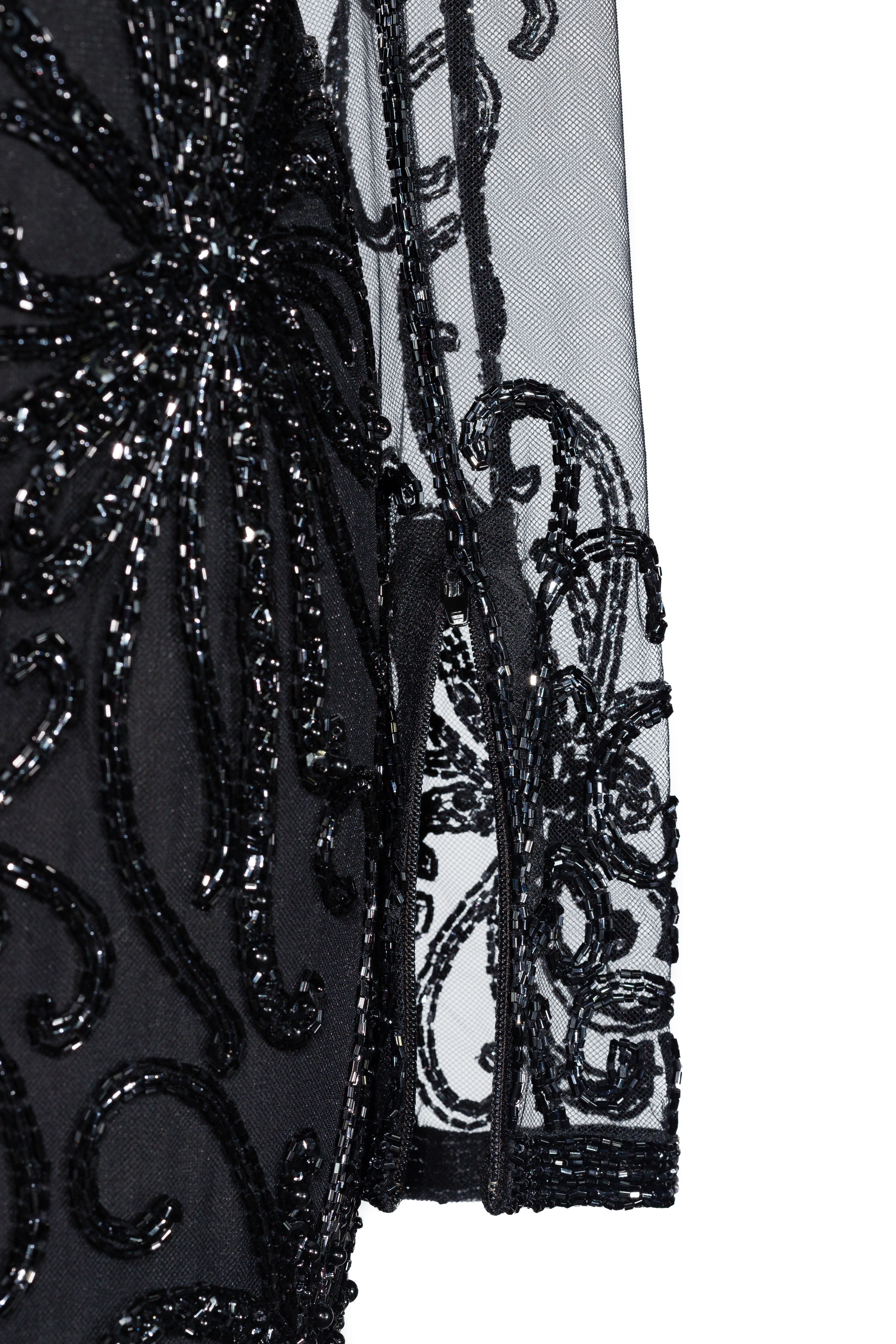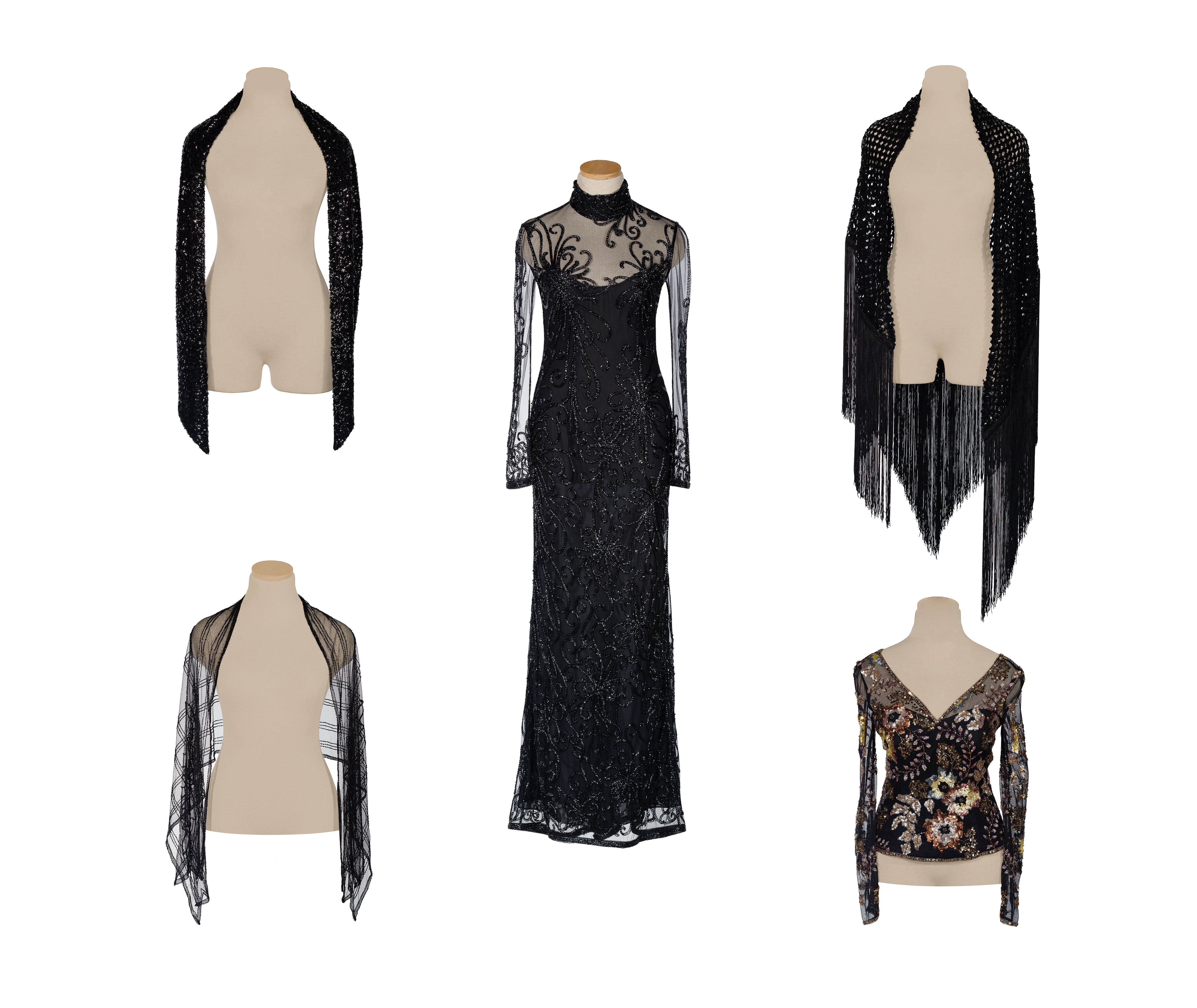 (5) total items including a black sheer fabric having intricate bead work, long sleeves, hidden zippers on each wrist, a fishtail pleat for ease of movement; together with an Alberto Malaki sequin and bead top and (3) sequin and bead on mesh formal shawls