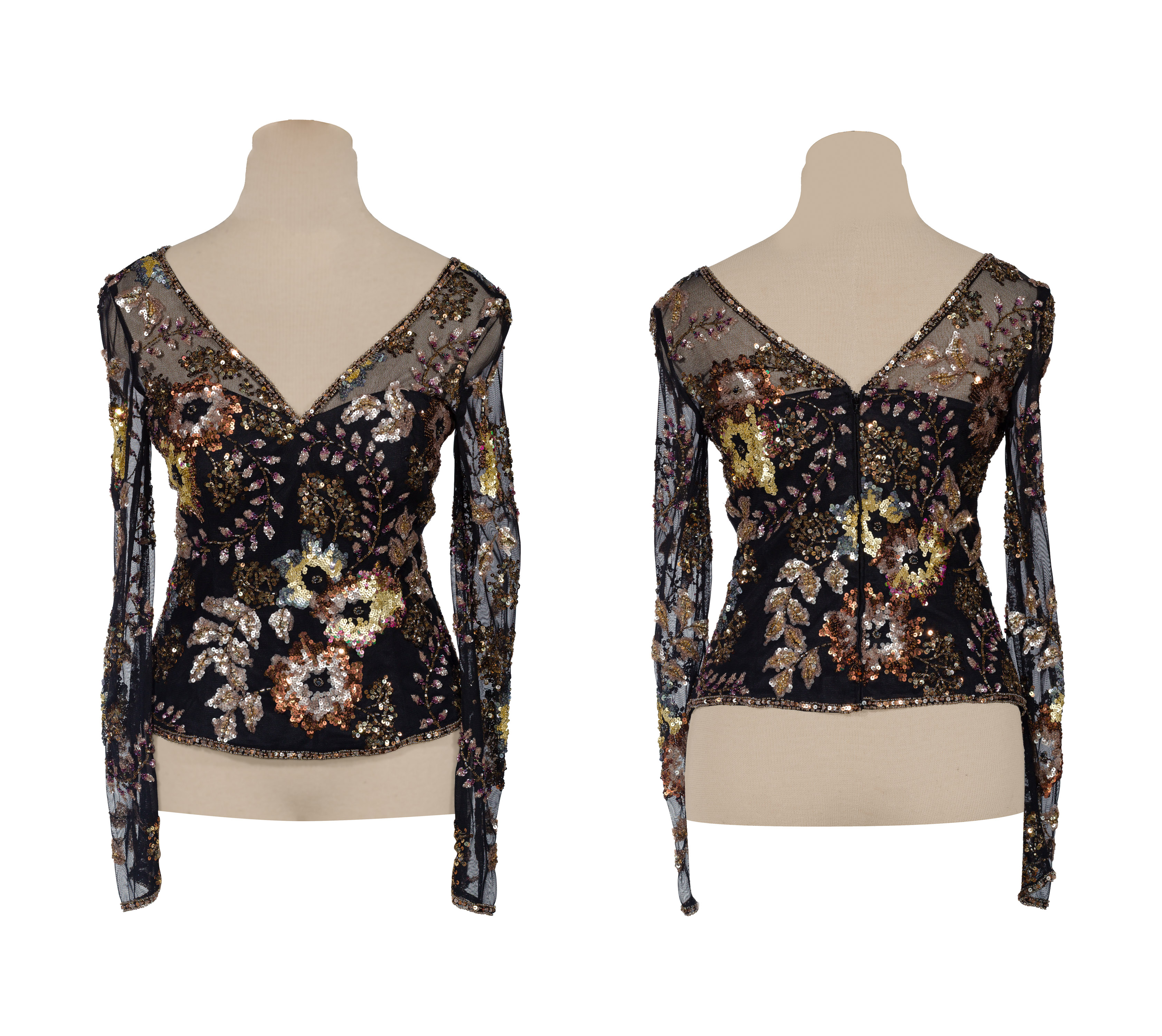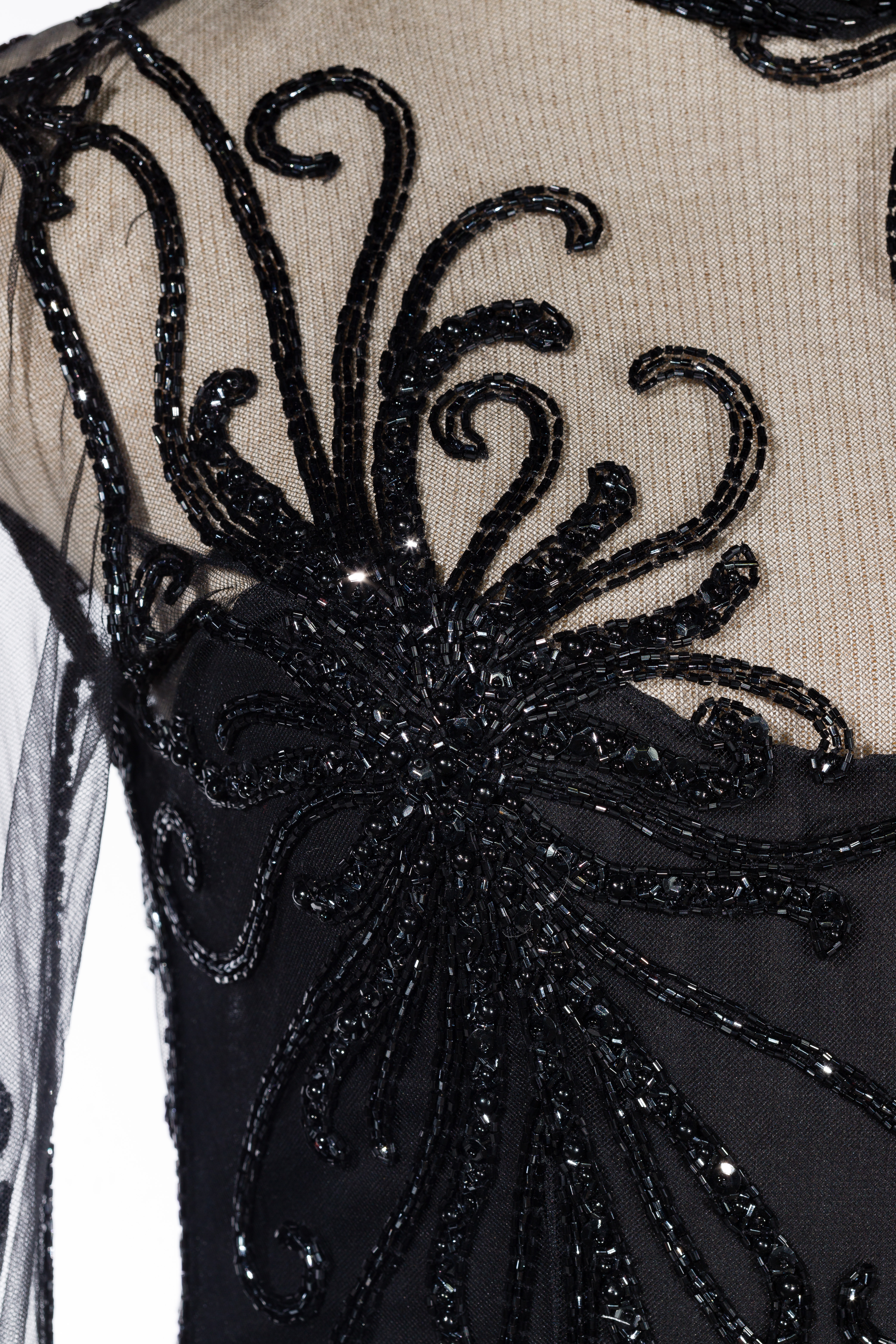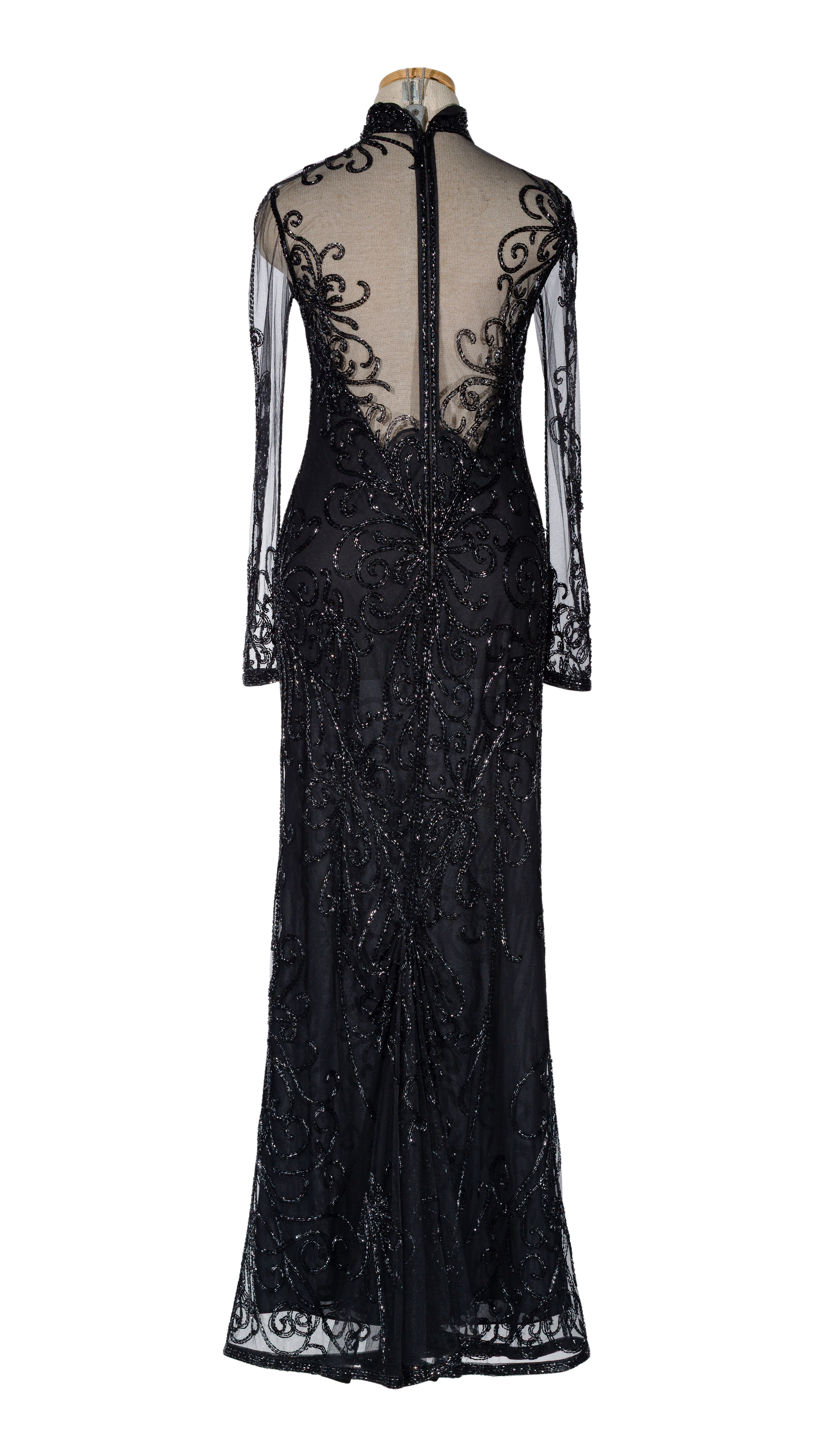 (5) total items including a black sheer fabric having intricate bead work, long sleeves, hidden zippers on each wrist, a fishtail pleat for ease of movement; together with an Alberto Malaki sequin and bead top and (3) sequin and bead on mesh formal shawls