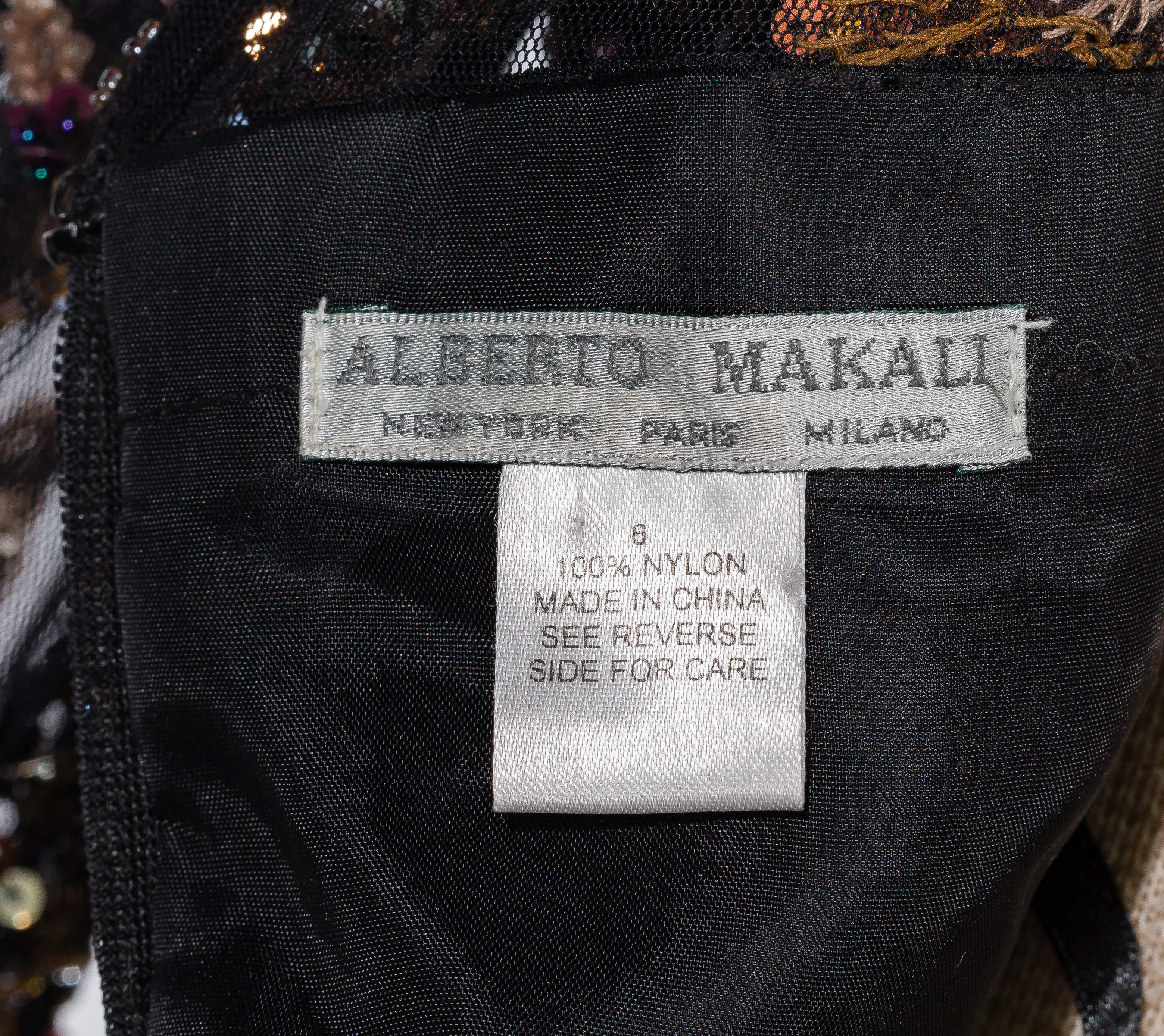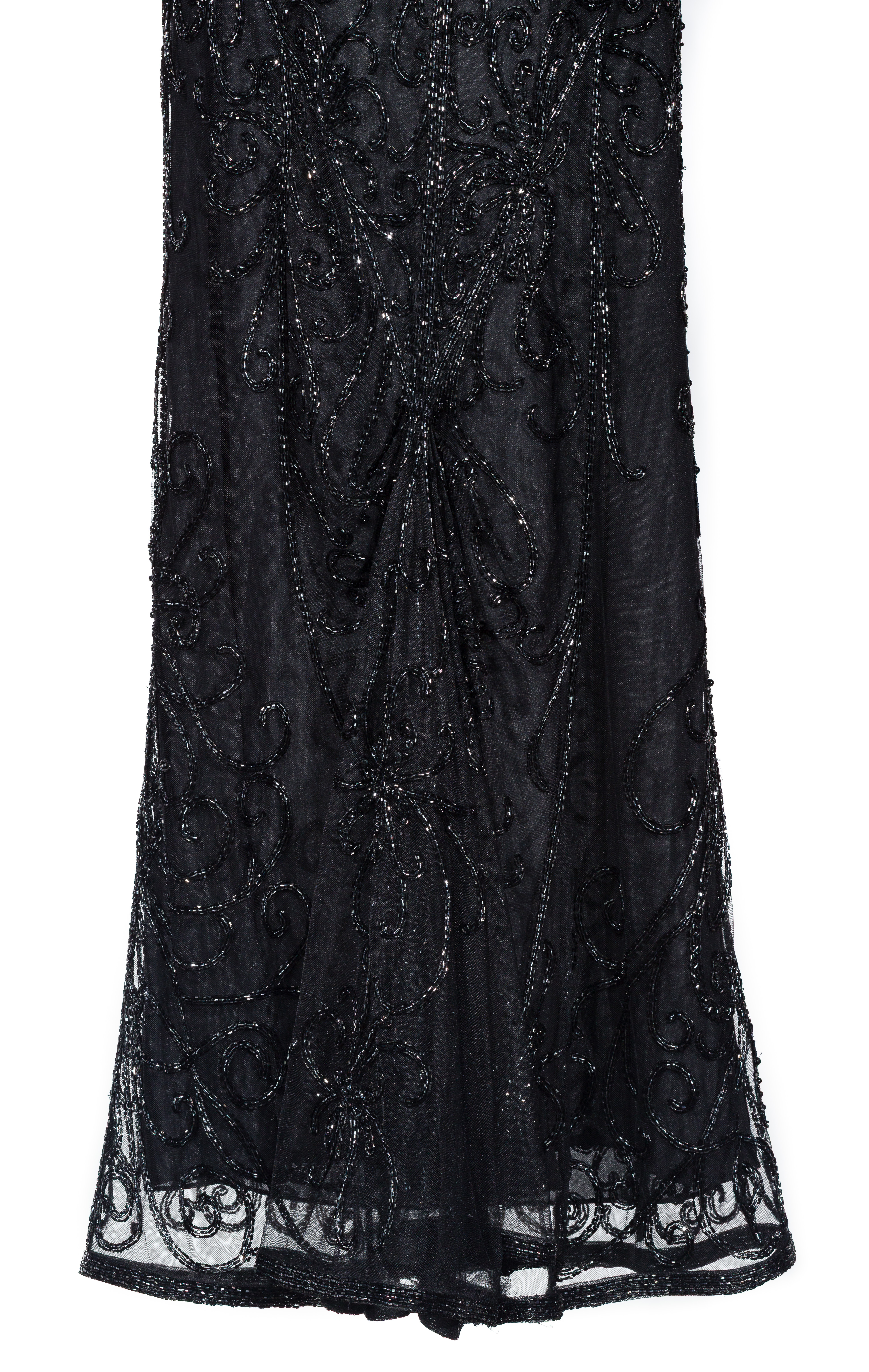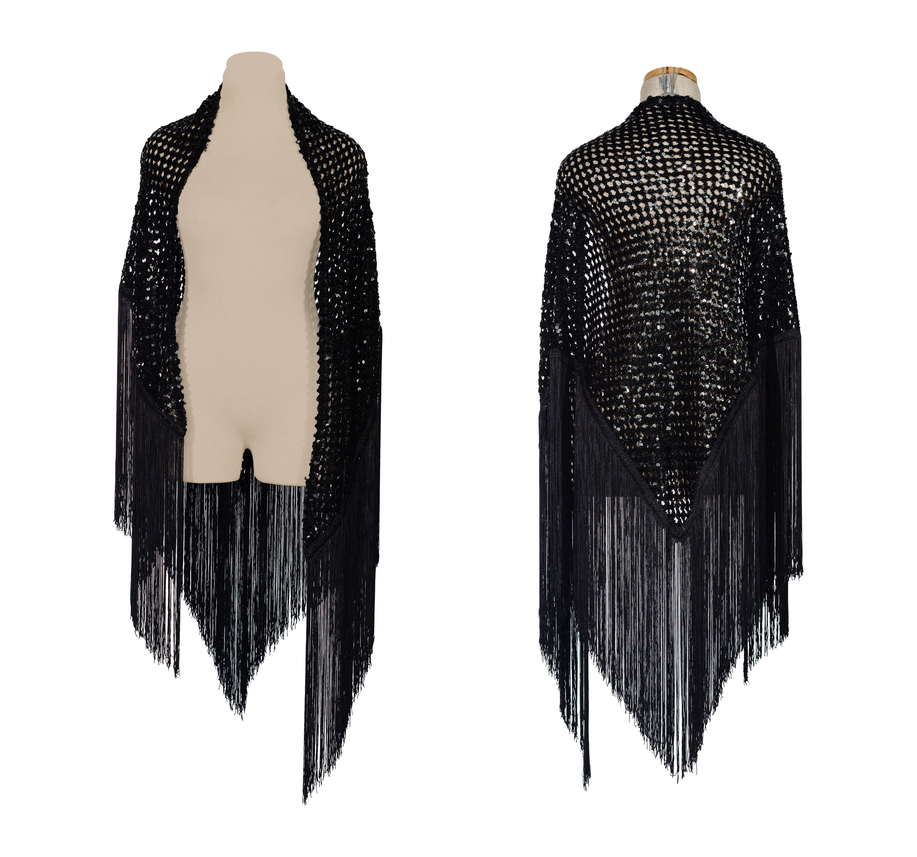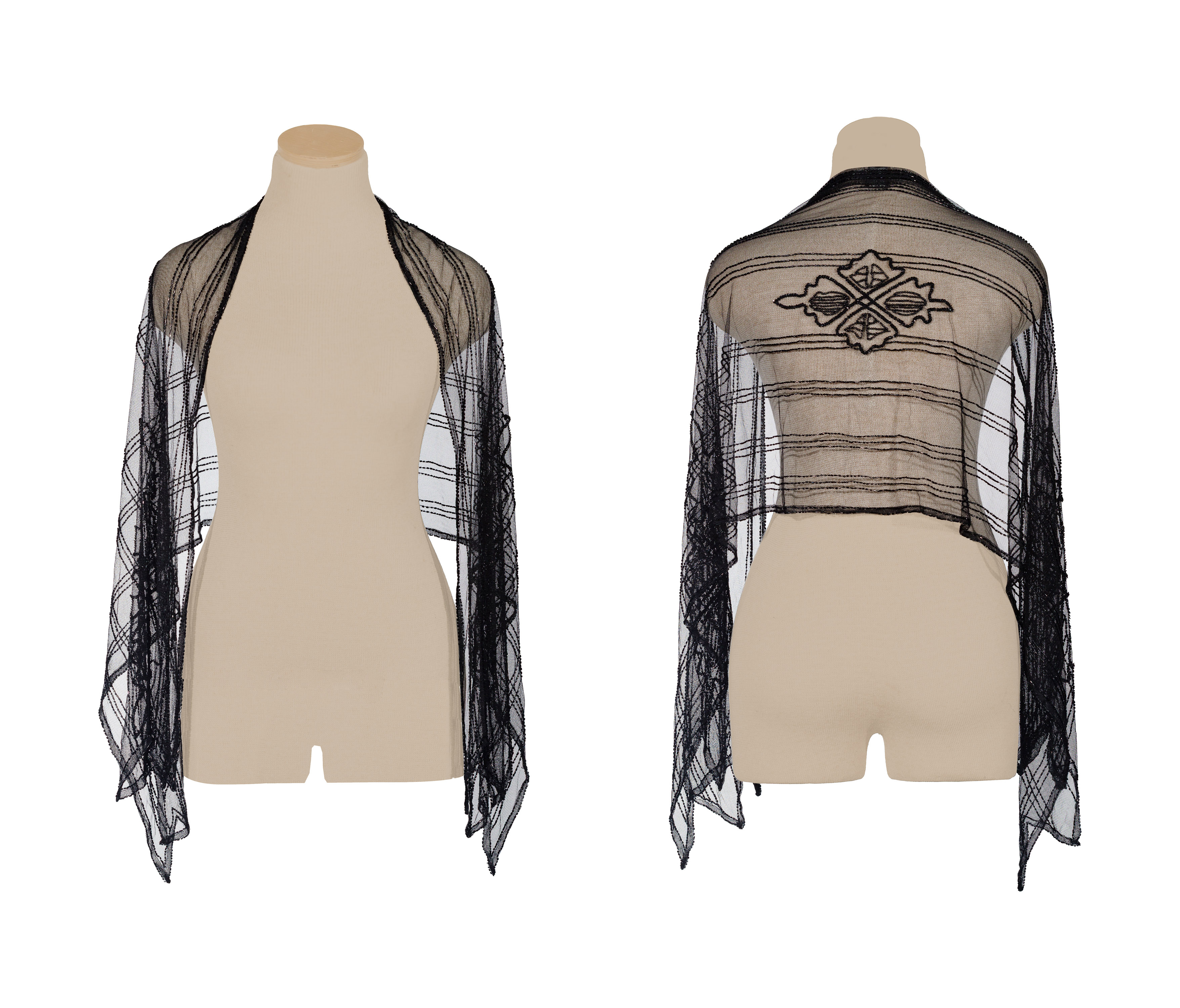 (5) total items including a black sheer fabric having intricate bead work, long sleeves, hidden zippers on each wrist, a fishtail pleat for ease of movement; together with an Alberto Malaki sequin and bead top and (3) sequin and bead on mesh formal shawls