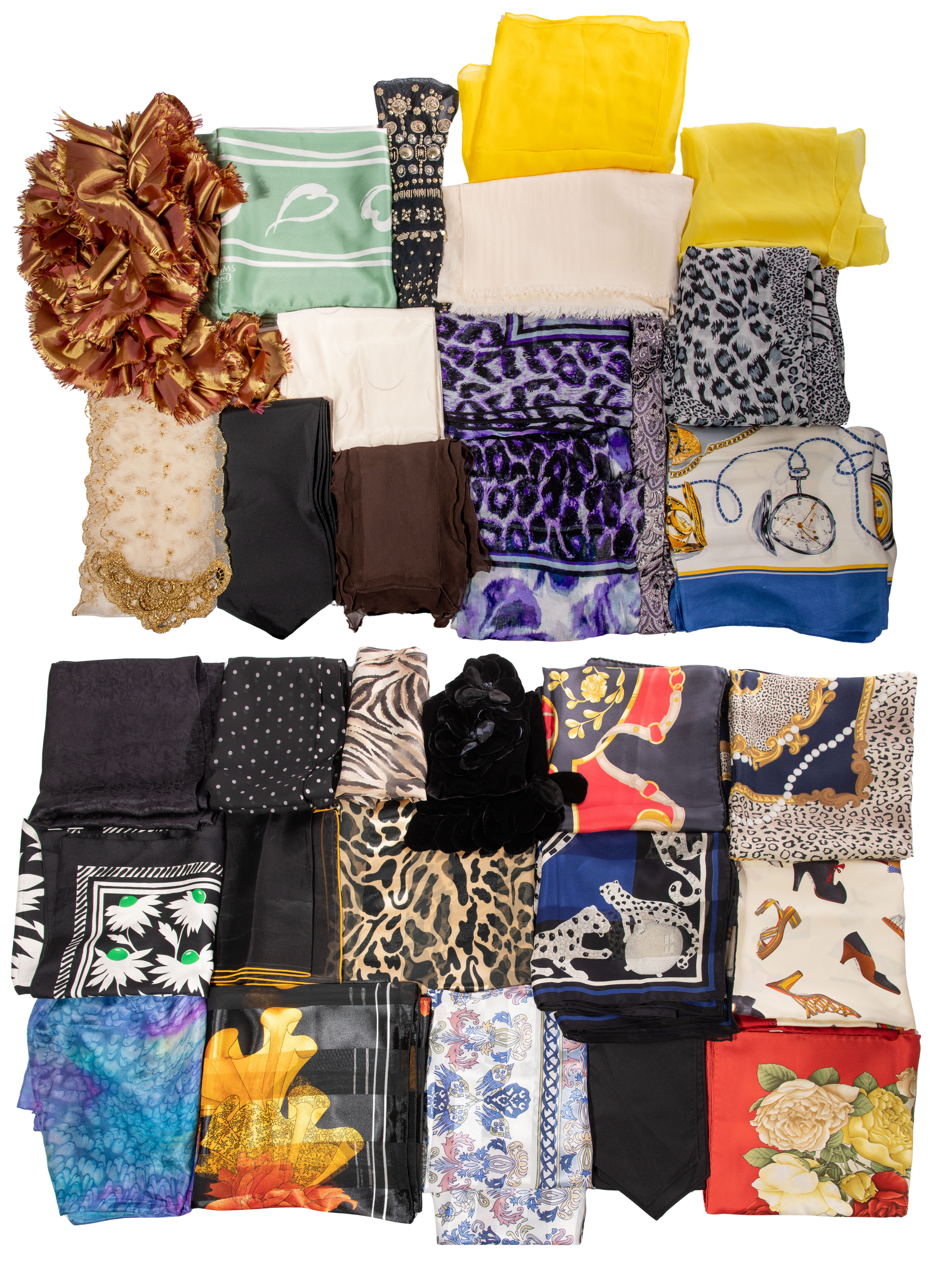 Approximately (30) items including scarves, belts, collars and wraps, from designers including Ferragamo, Cartier, Vittadini, Cache and Rolex, in fabrics including silk, cotton and velvet
