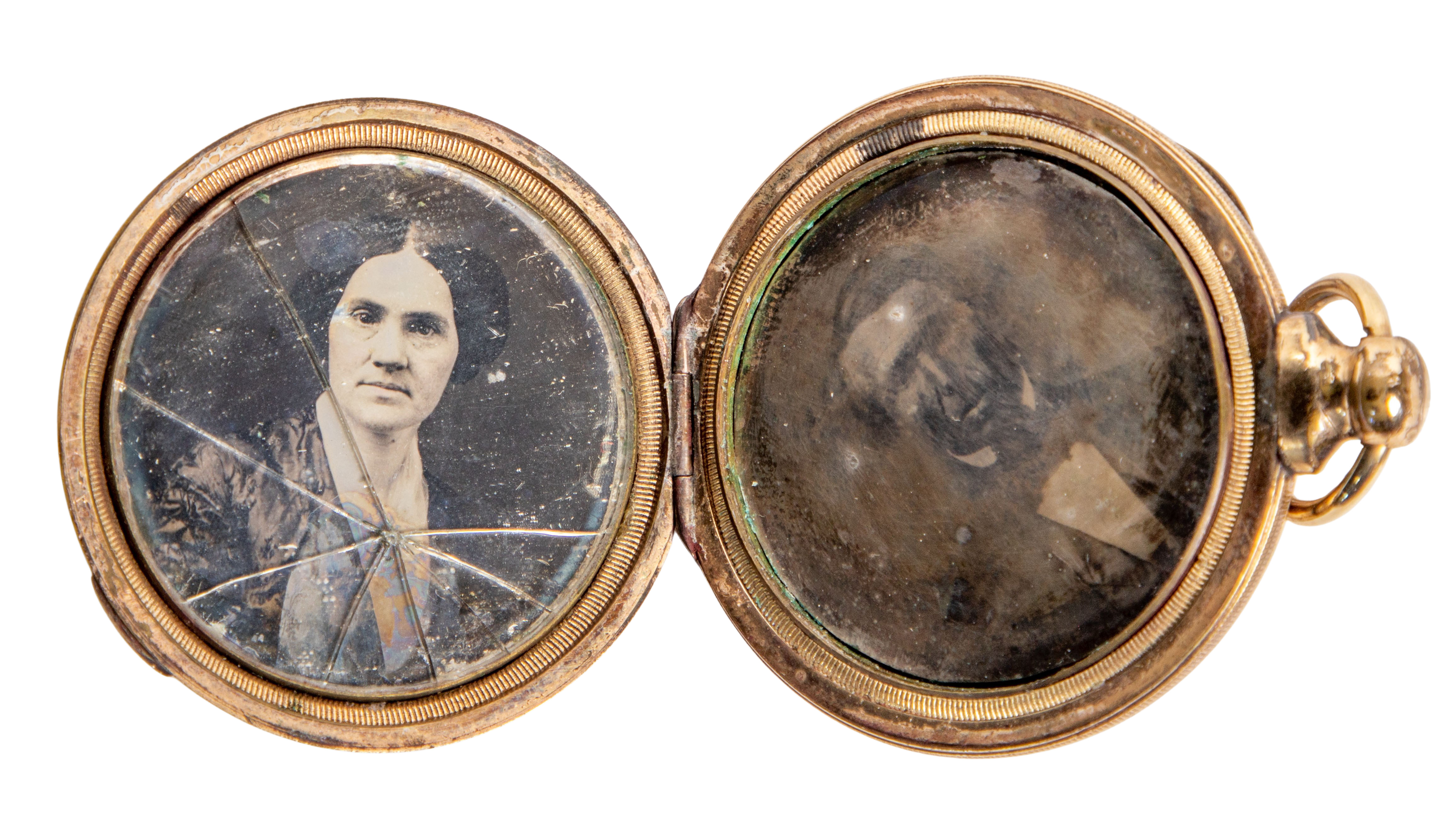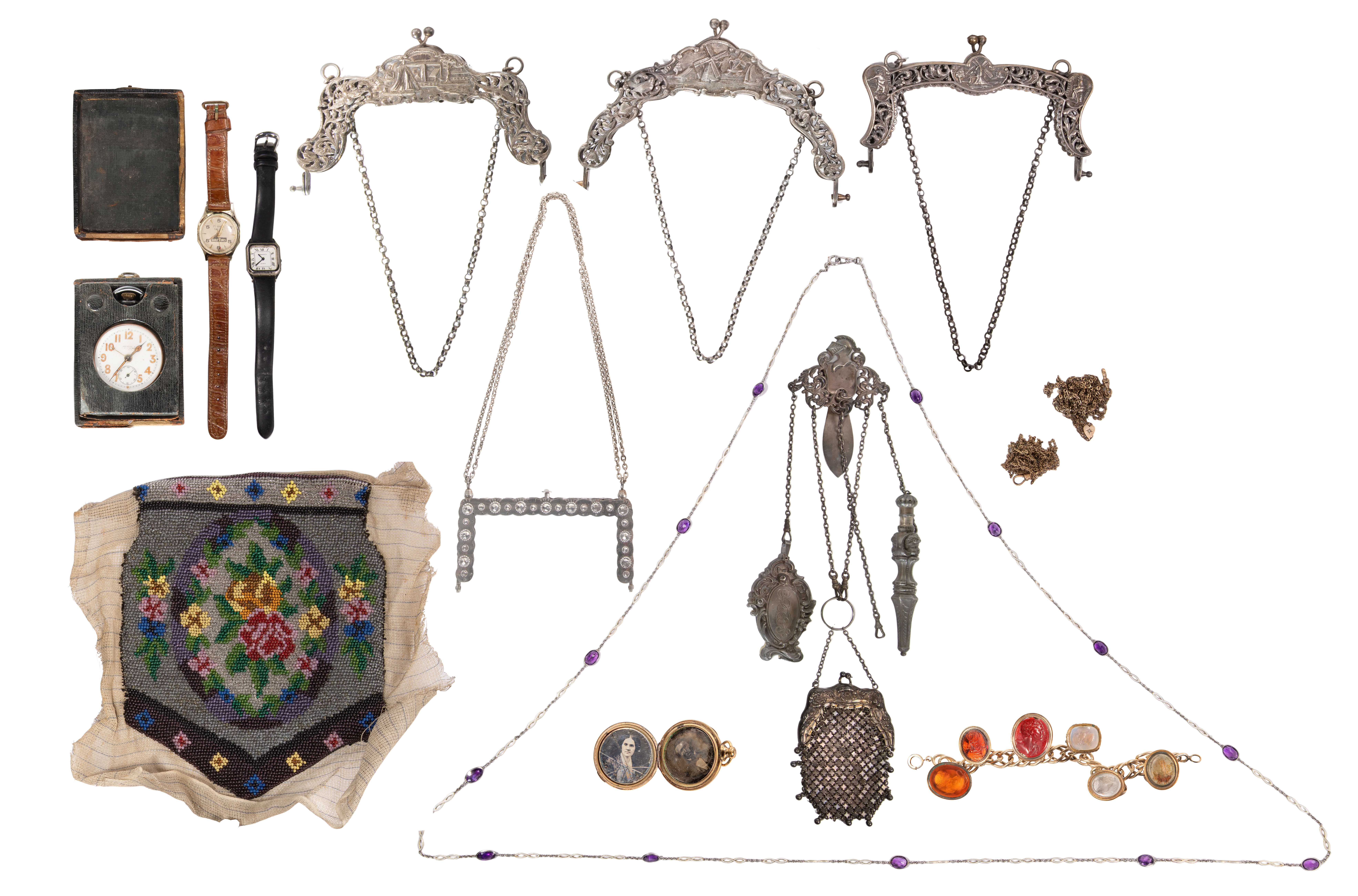 (14) items including a daguerreotype hunter case watch style locket (unmarked 10k), amethyst and link style necklace (unmarked platinum clasp and 9k white gold), a chatelaine (marked ‘sterling’), handbag frames (unmarked 900 and 830 silver) as well as watches, clock, handbag parts