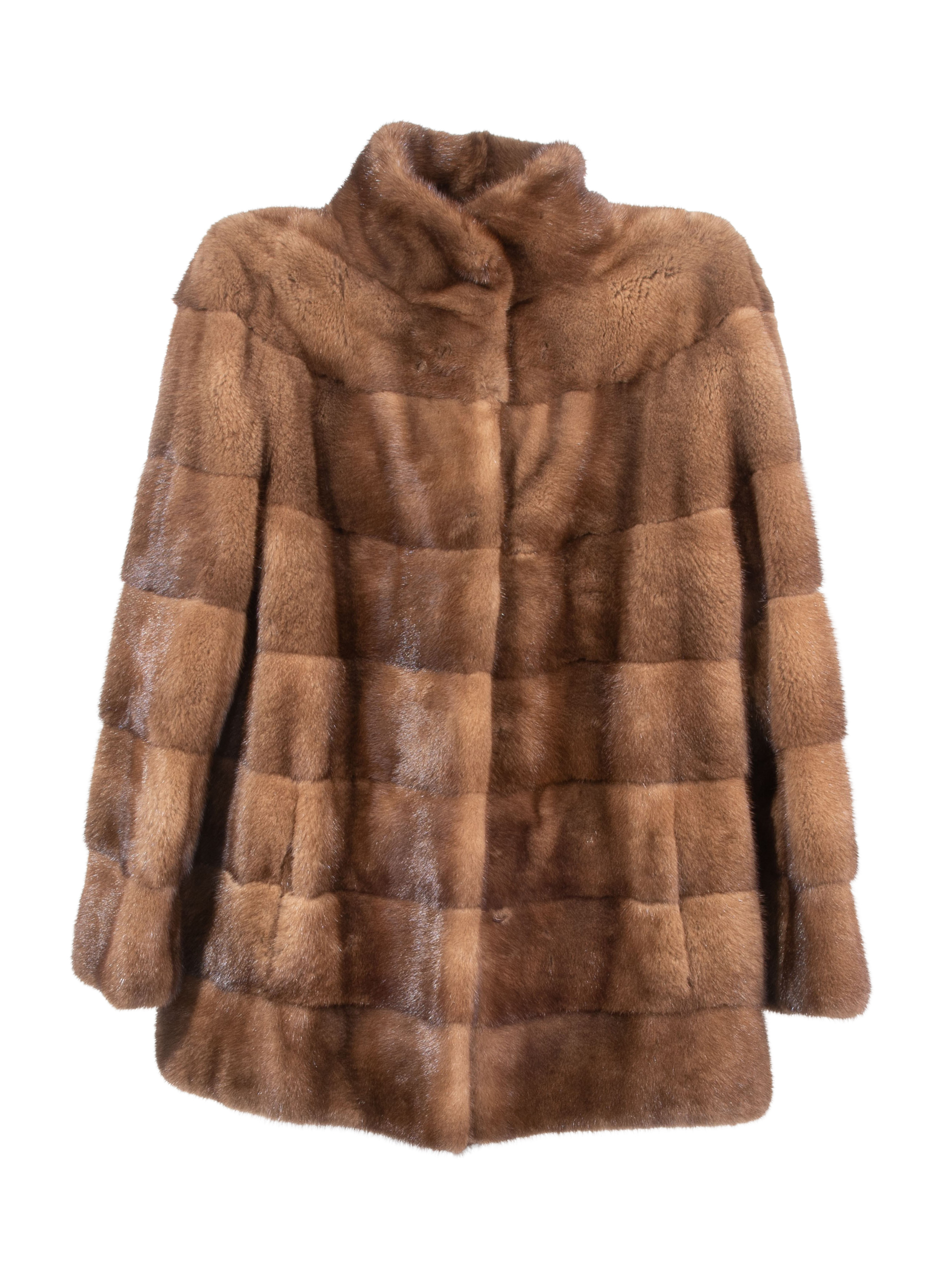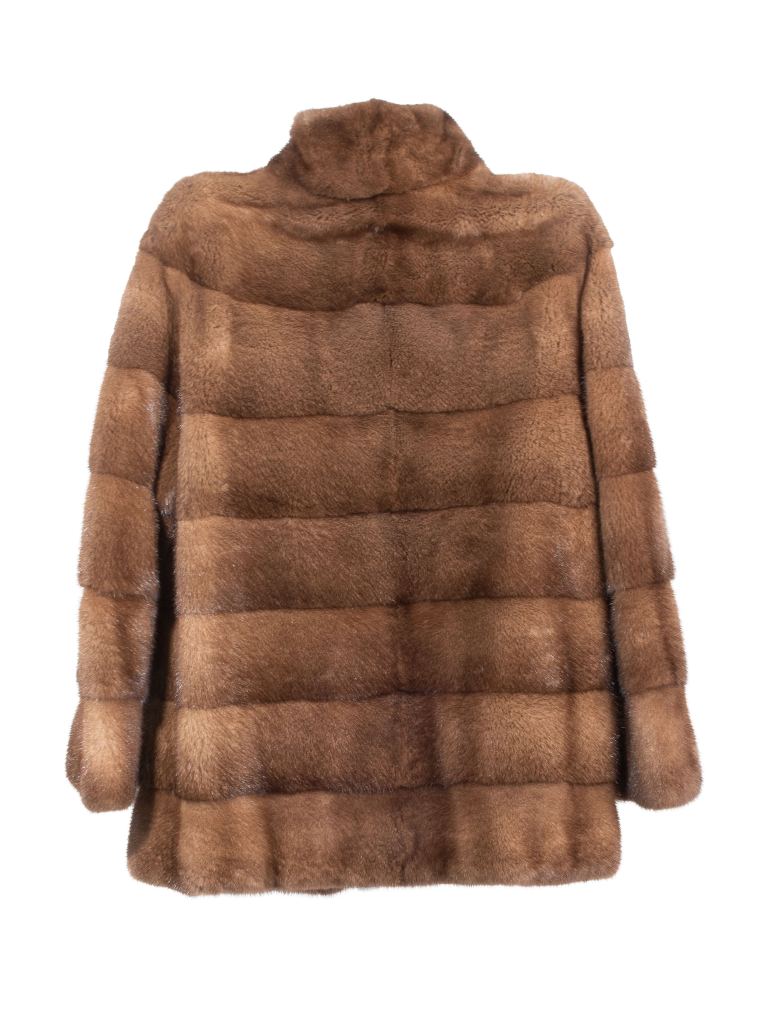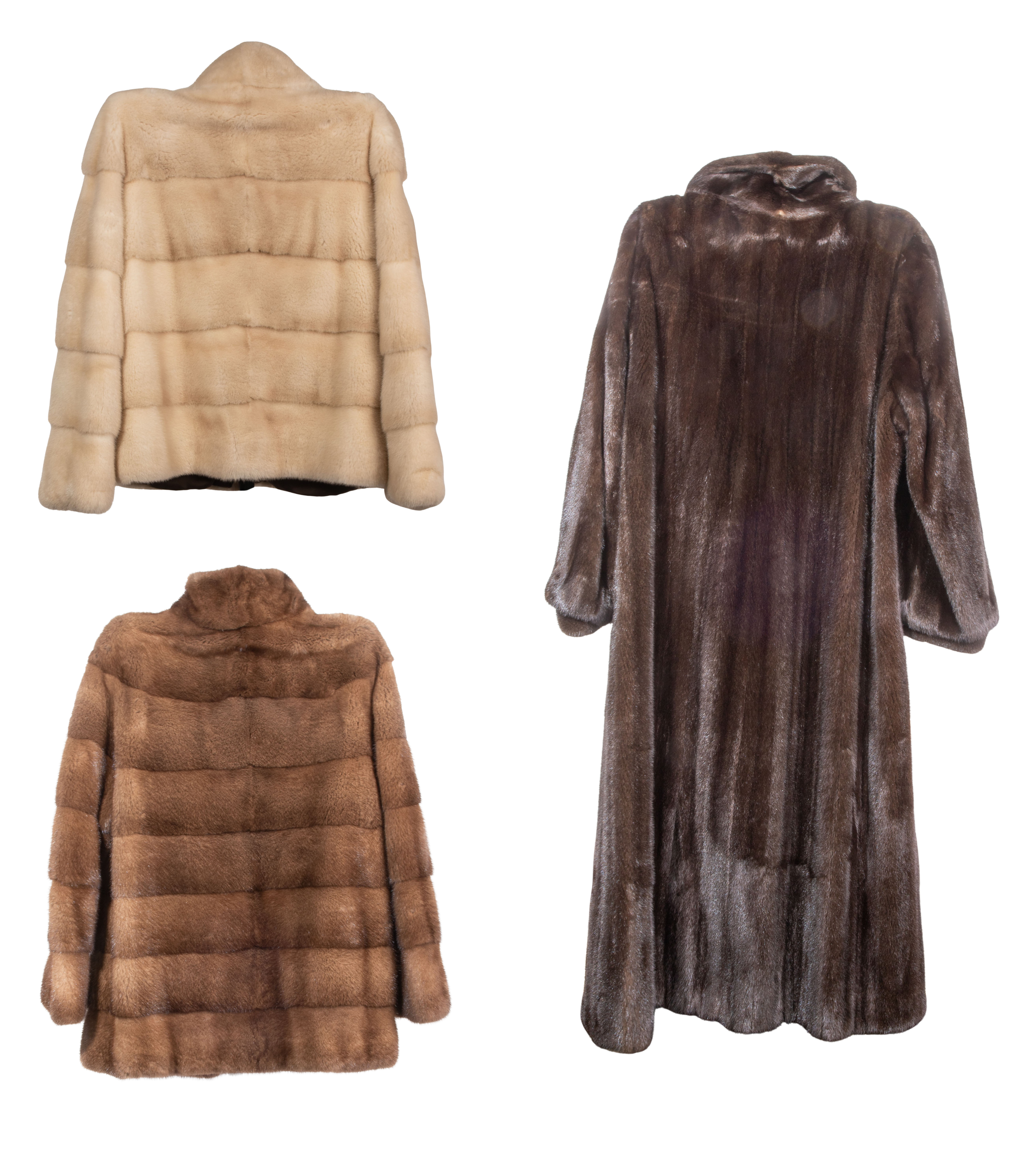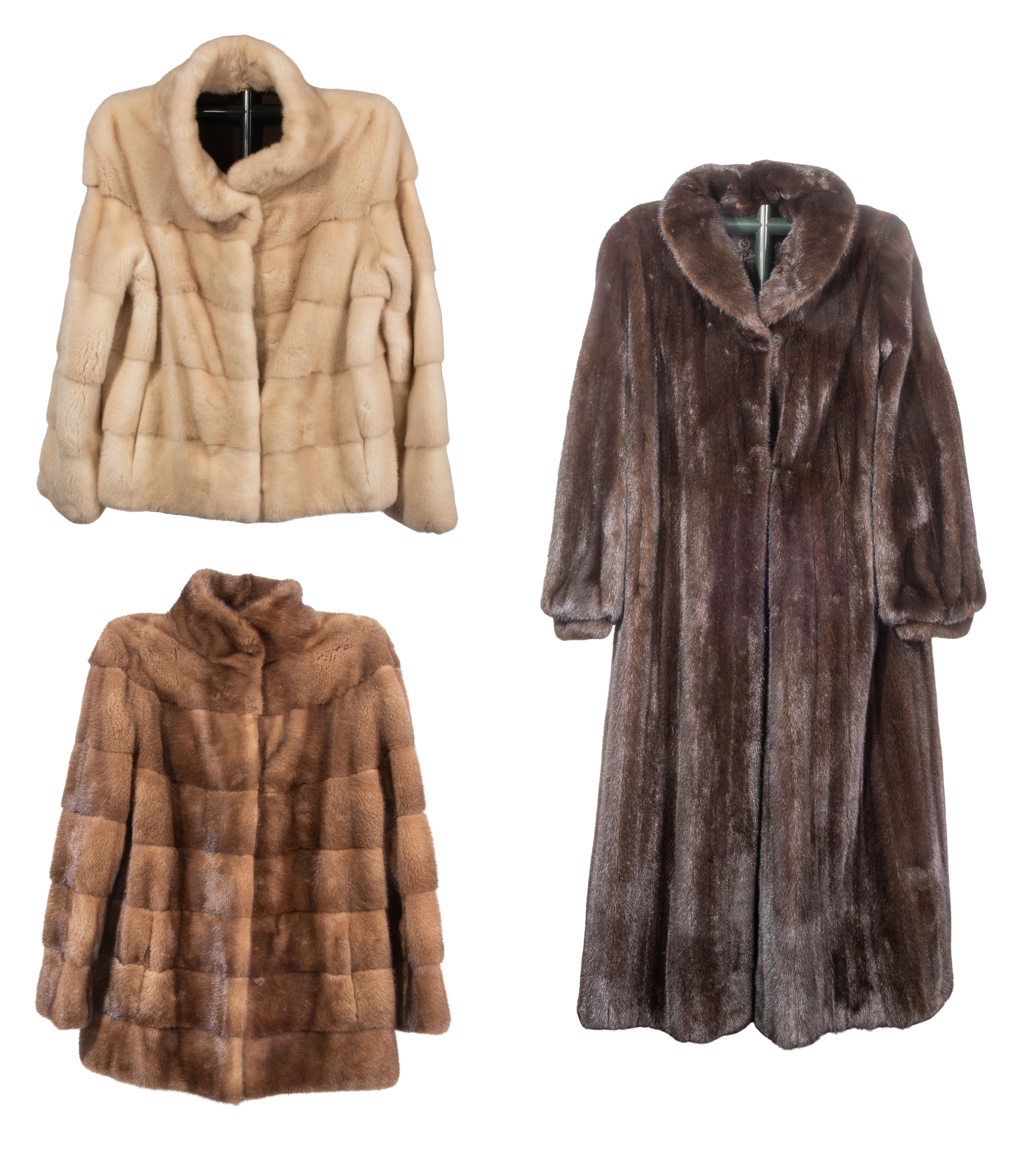 (3) items including a dark brown full length coat having a banded cuff puff sleeve, hook and eye closure, slit pockets as well as a champagne jacket having hook and eye closure, a mock stand up collar, slit pockets and horizontal pelts (size S) and a brown jacket, having hook and eye closure, a mock stand up collar, slit pockets and horizontal pelts (size S)