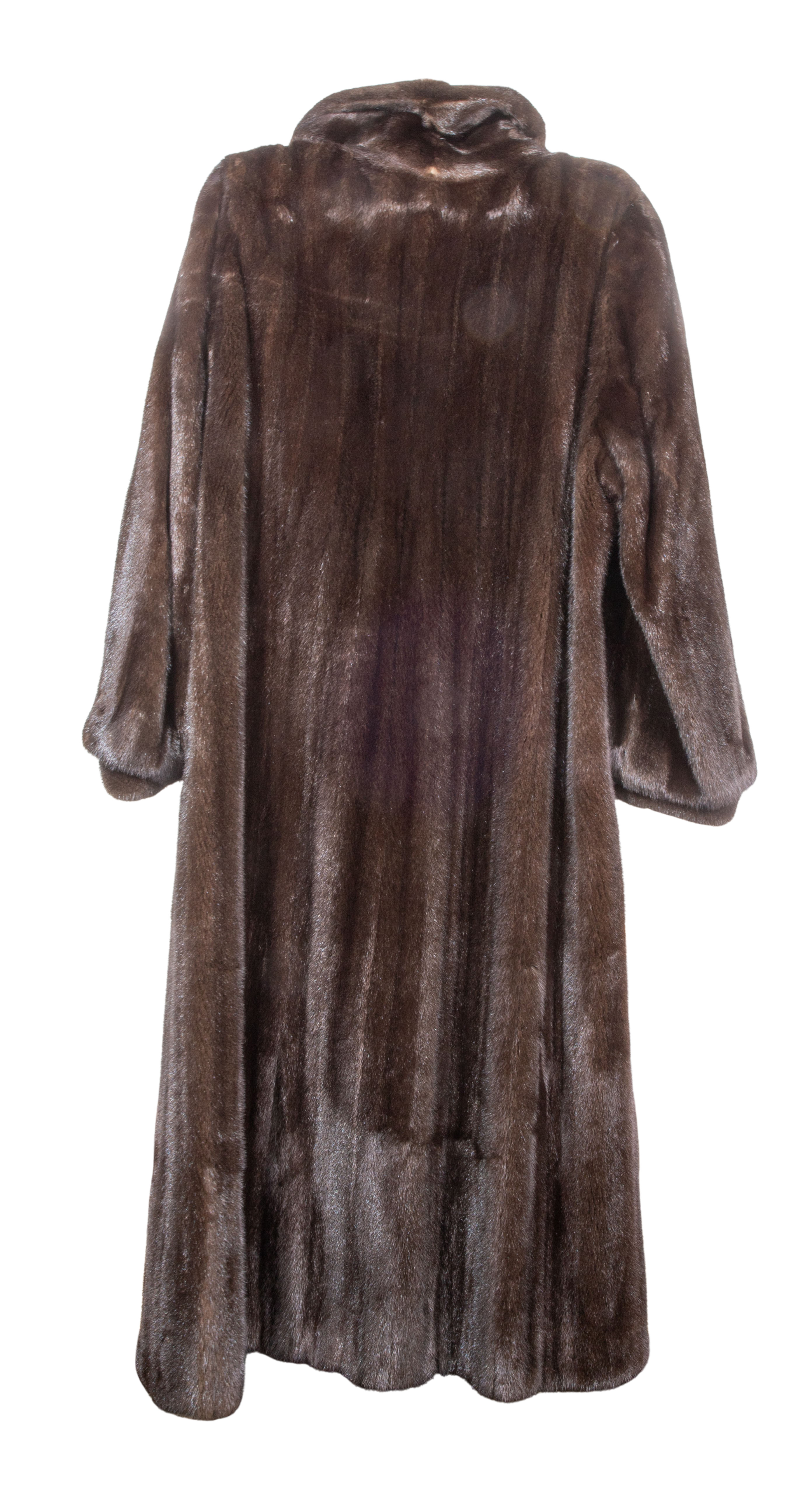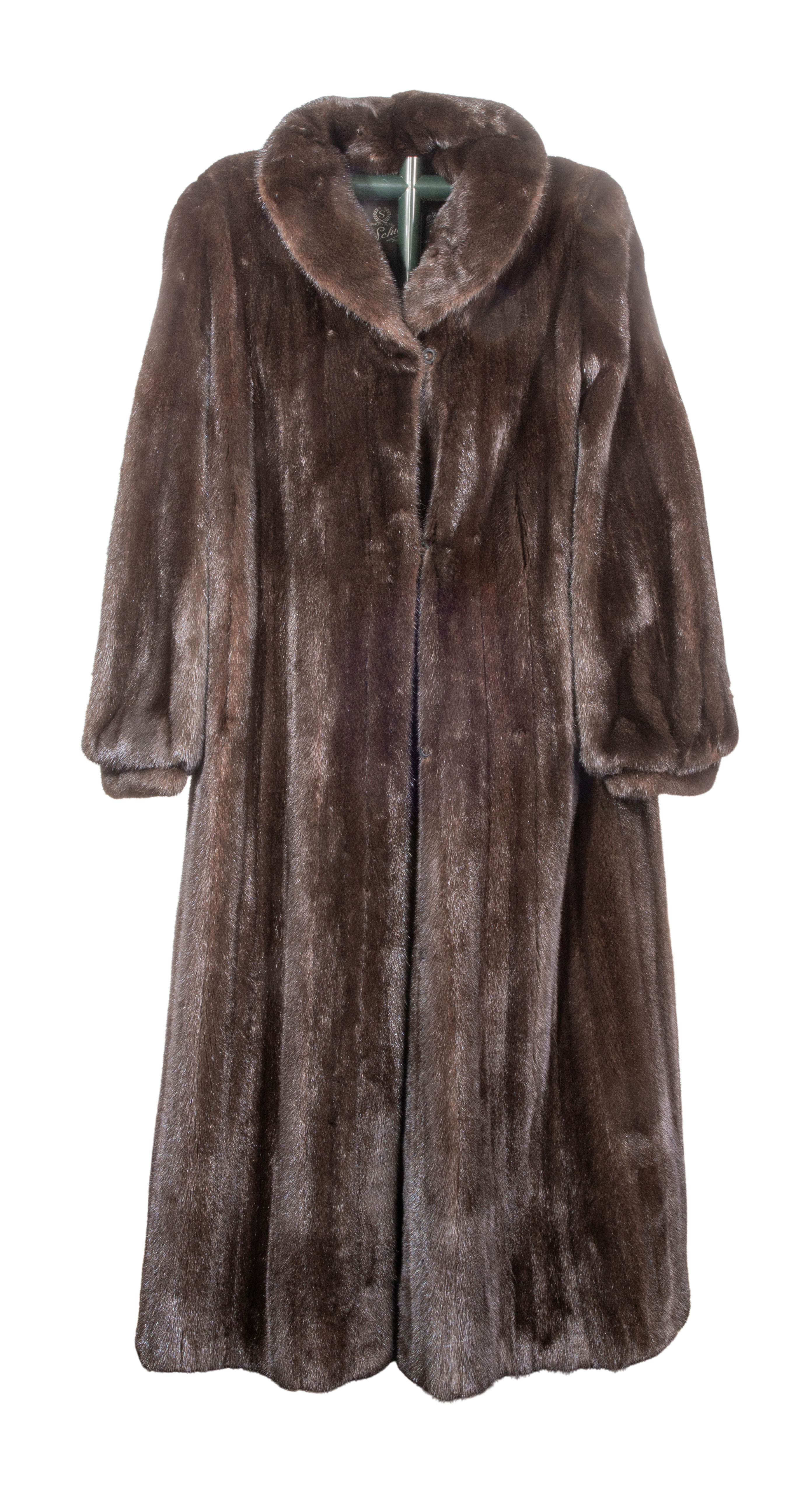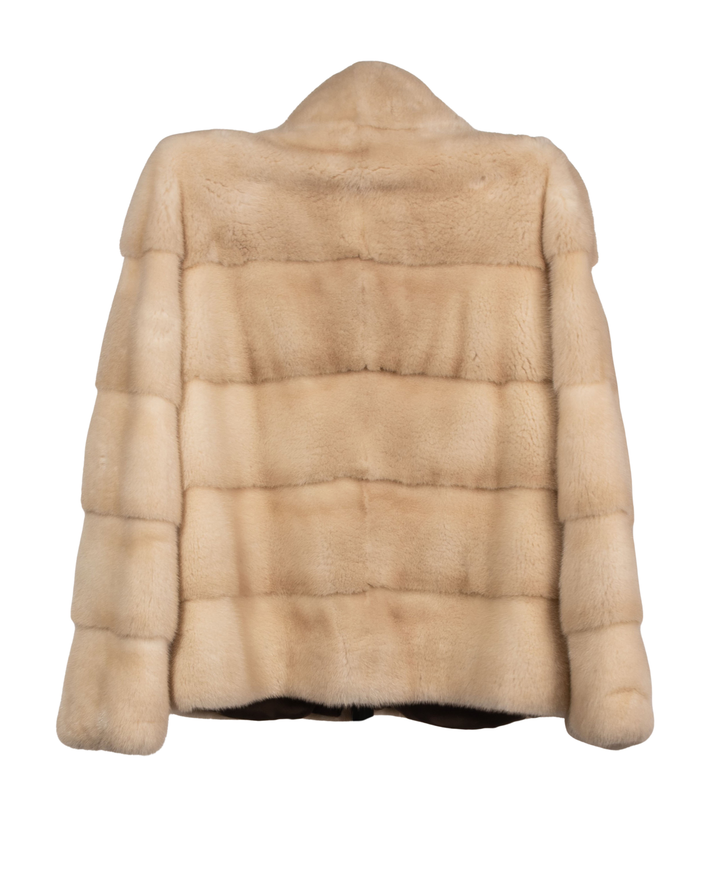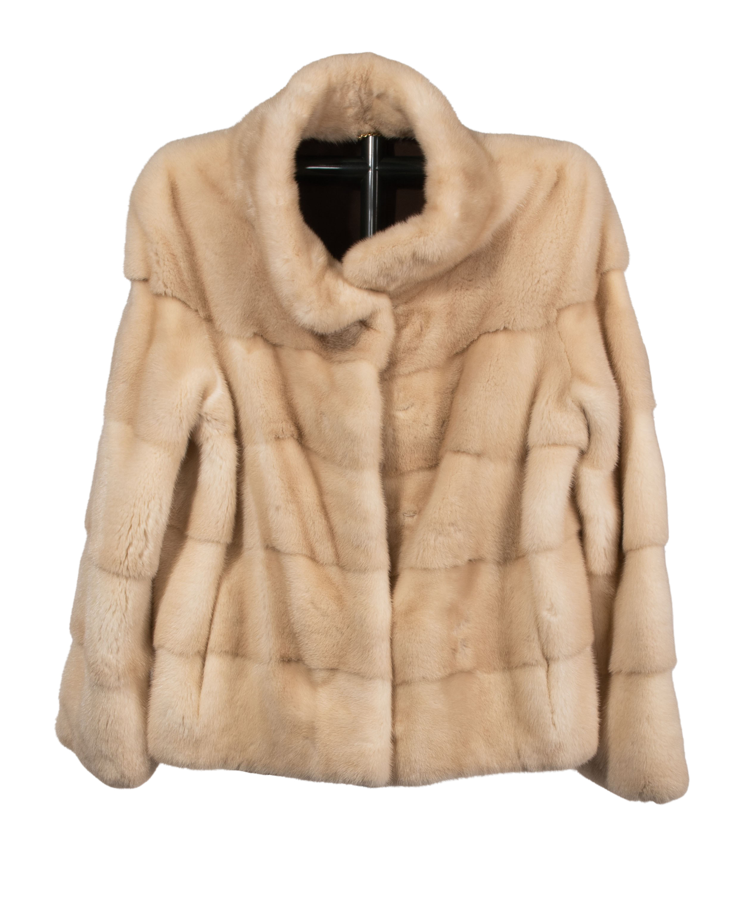 (3) items including a dark brown full length coat having a banded cuff puff sleeve, hook and eye closure, slit pockets as well as a champagne jacket having hook and eye closure, a mock stand up collar, slit pockets and horizontal pelts (size S) and a brown jacket, having hook and eye closure, a mock stand up collar, slit pockets and horizontal pelts (size S)