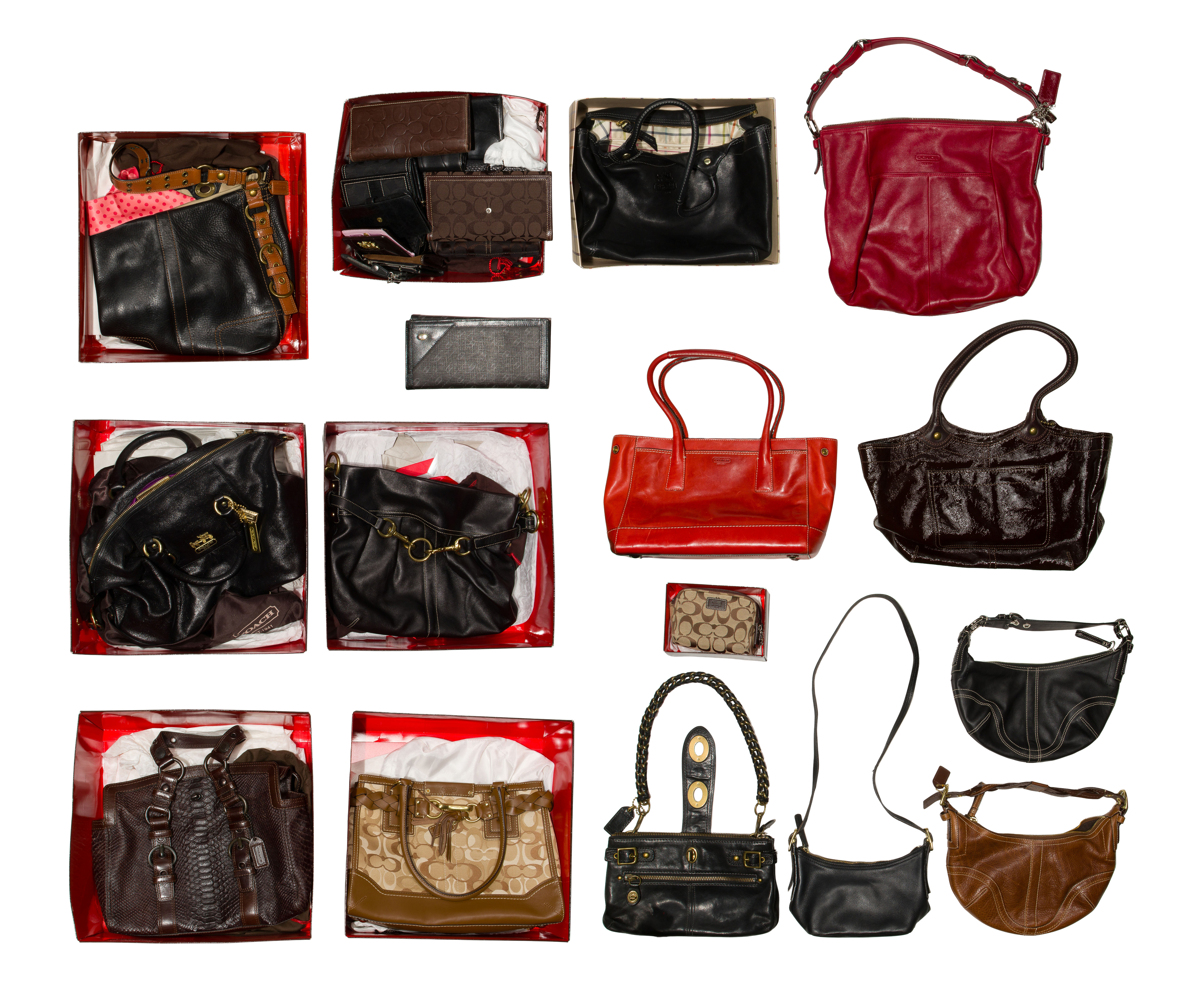 (34) total items including a signature double handle Hampton #M0626-10786, a Hampton belted leather hobo #H05S-8B15, a Madison Sabrina satchel #F0882-12949, a Chelsea printed Embossed python #C0793-11008, a Phoebe shoulder bag #C0769-10959, a Bleeker tote #C0873-12362, a Madeline red leather bag #A0893-11553 and wallet, a Soho red leather bag #G0882-12684, a Hobo handbag #M0769-11622, a brown leather saddle Hobo #ZG066-10042, a black Bleeker zipper tote #C0869-12415, a black leather saddle Hobo #C063-10030, a small black handbag #E1P-9844, a black leather clutch bag #M0769-11622, a black legacy handbag #K1D-9821, a zipper pouch having box, (6) wallet/ checkbook holders, (4) pouches, a wallet and (5) identification holders, some having dust bags and boxes; together with a Gucci wallet