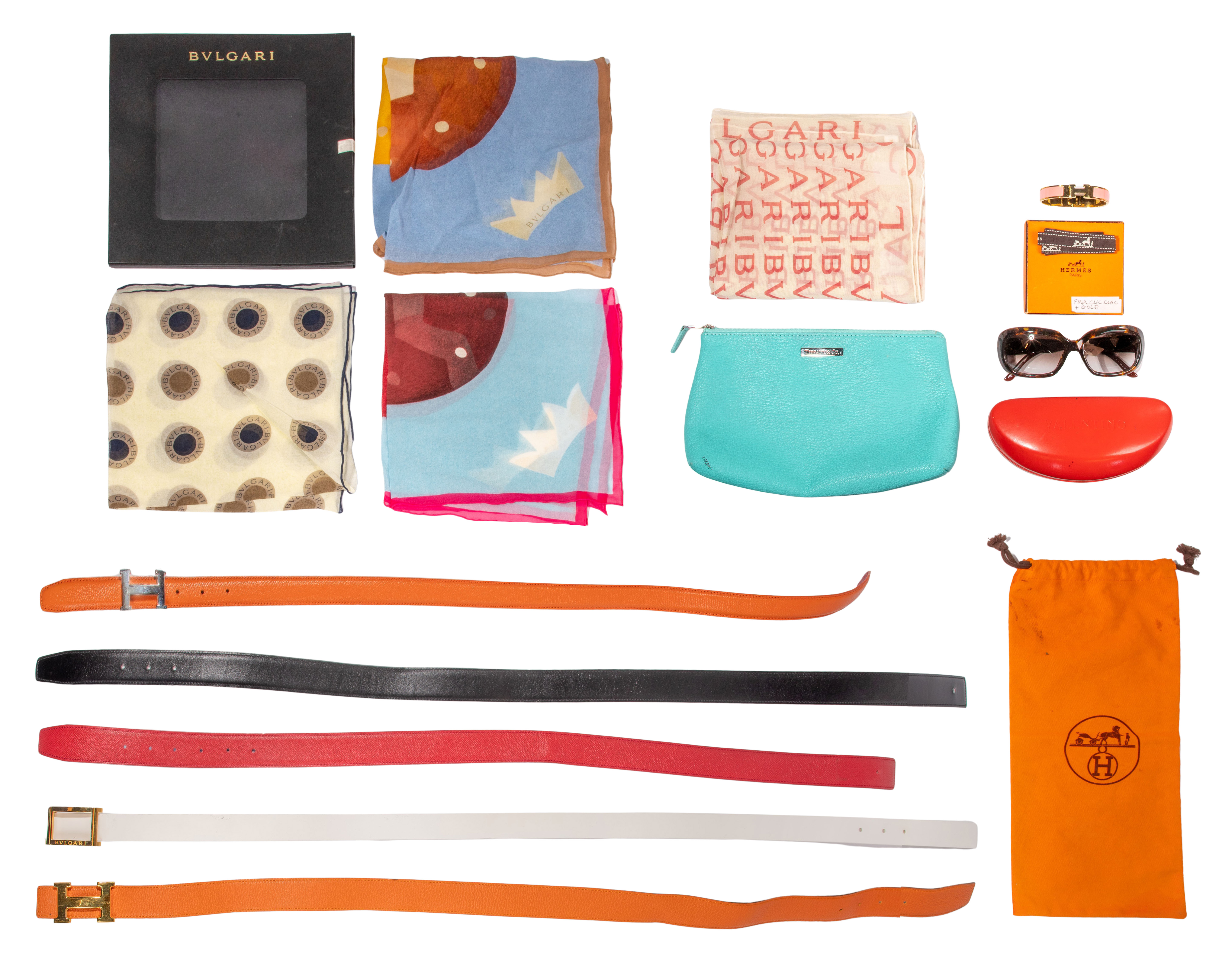 (12) items including (2) H buckles and (4) interchangeable leather belts including two in orange, a black and a red, a Clic style H bracelet having pink enamel and box, all marked ‘Hermes’, (4) scarves having one logo sleeve and a white leather belt, all marked ‘Bulgari’, a pair of Valentino sunglasses in case, as well as a Tiffany leather bag, empty Hermes boxes and a dust bag for a belt