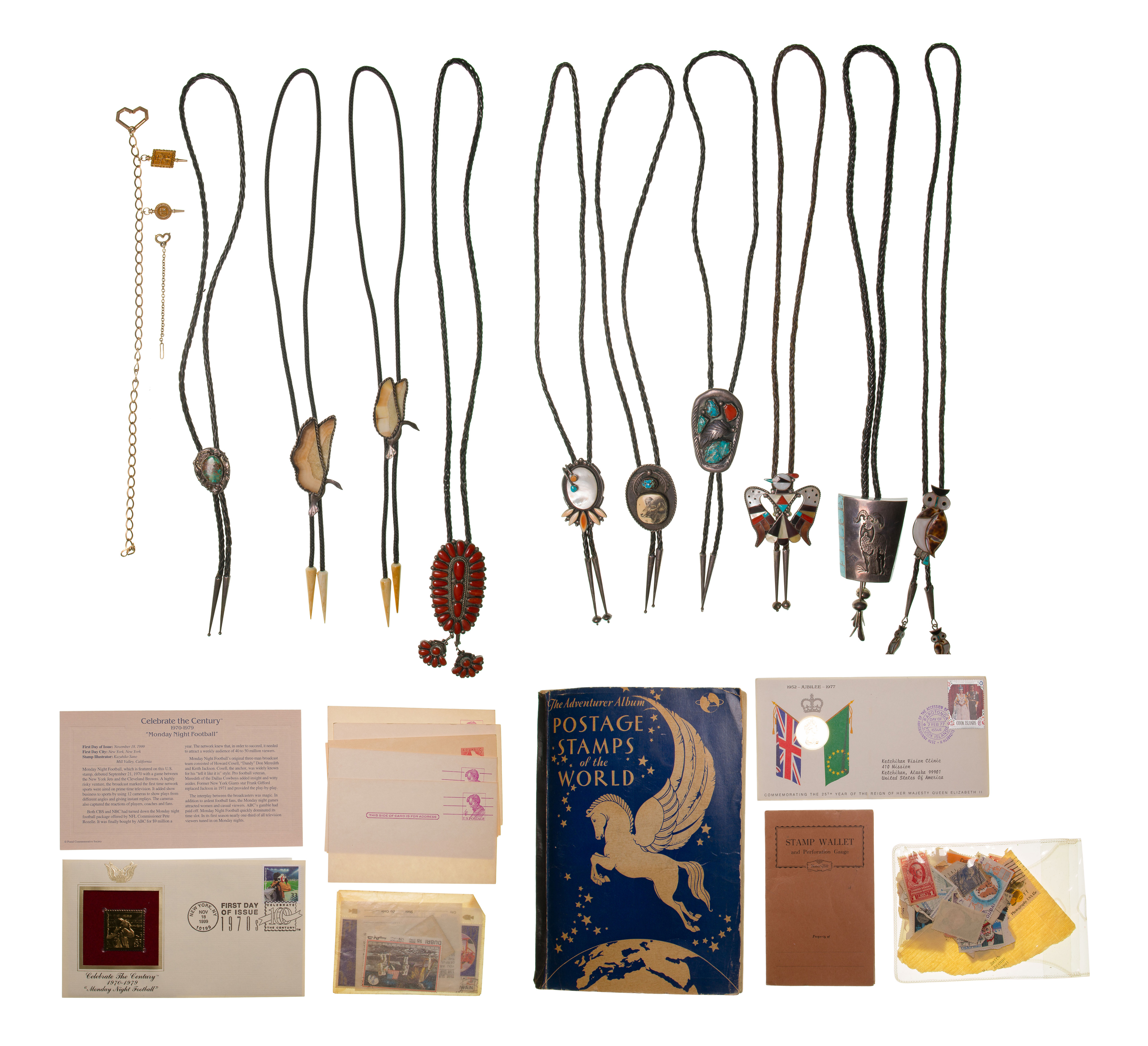 (14) items including (2) watch fobs (unmarked 10k), (2) monogram pendants, (9) bolo ties having various figures, stones and motifs, some signed ‘D & W’, ‘NLP’ and ‘Bobby Corraine’ (all marked ‘925’), a bolo (marked ‘850’); together with world stamp assortment
