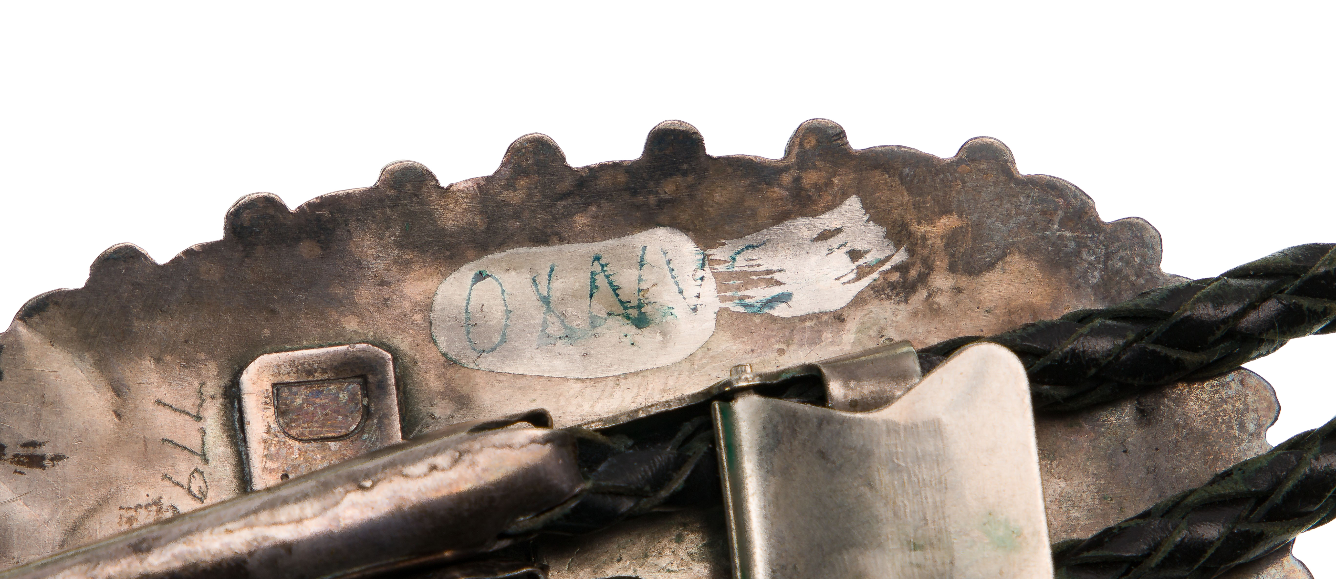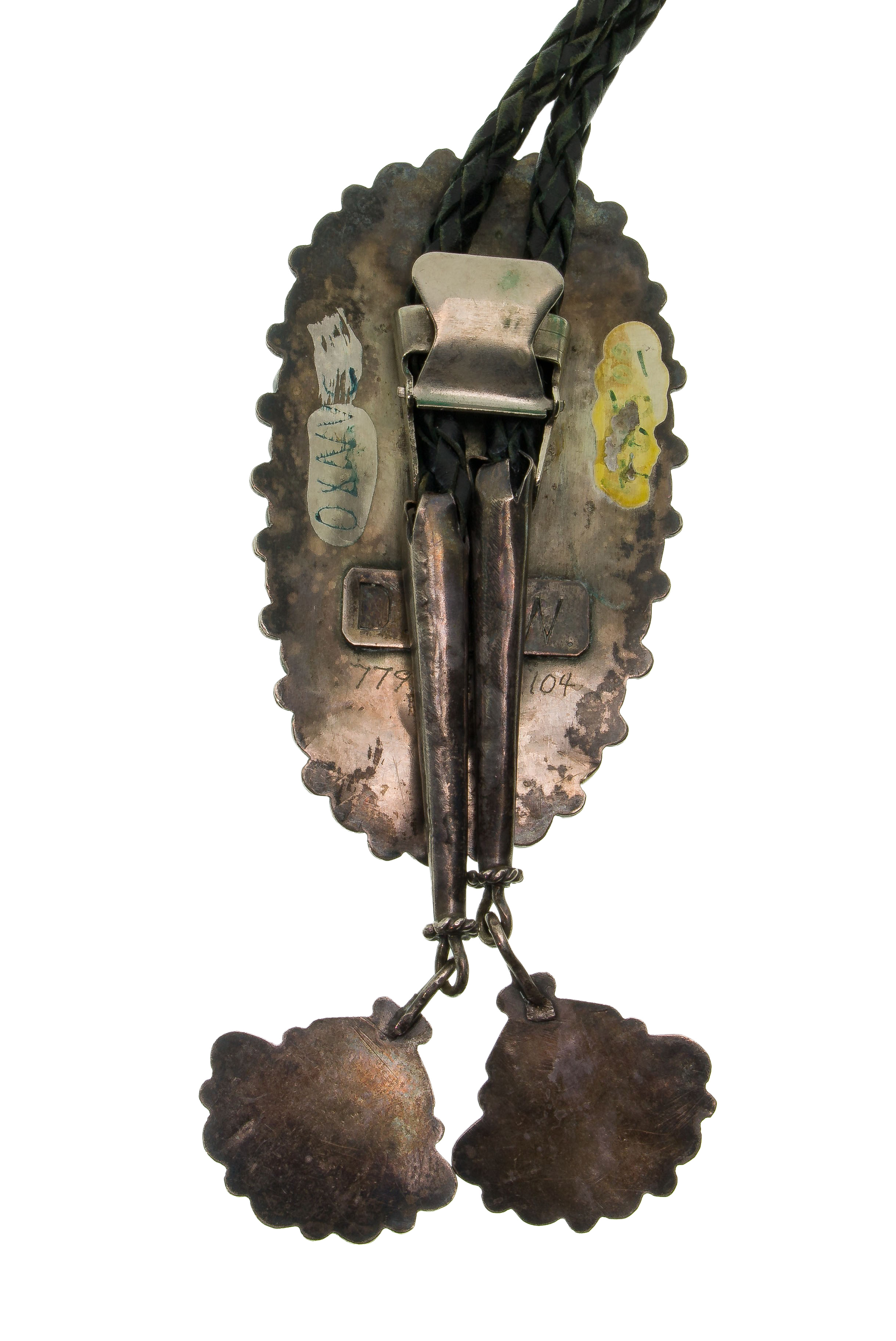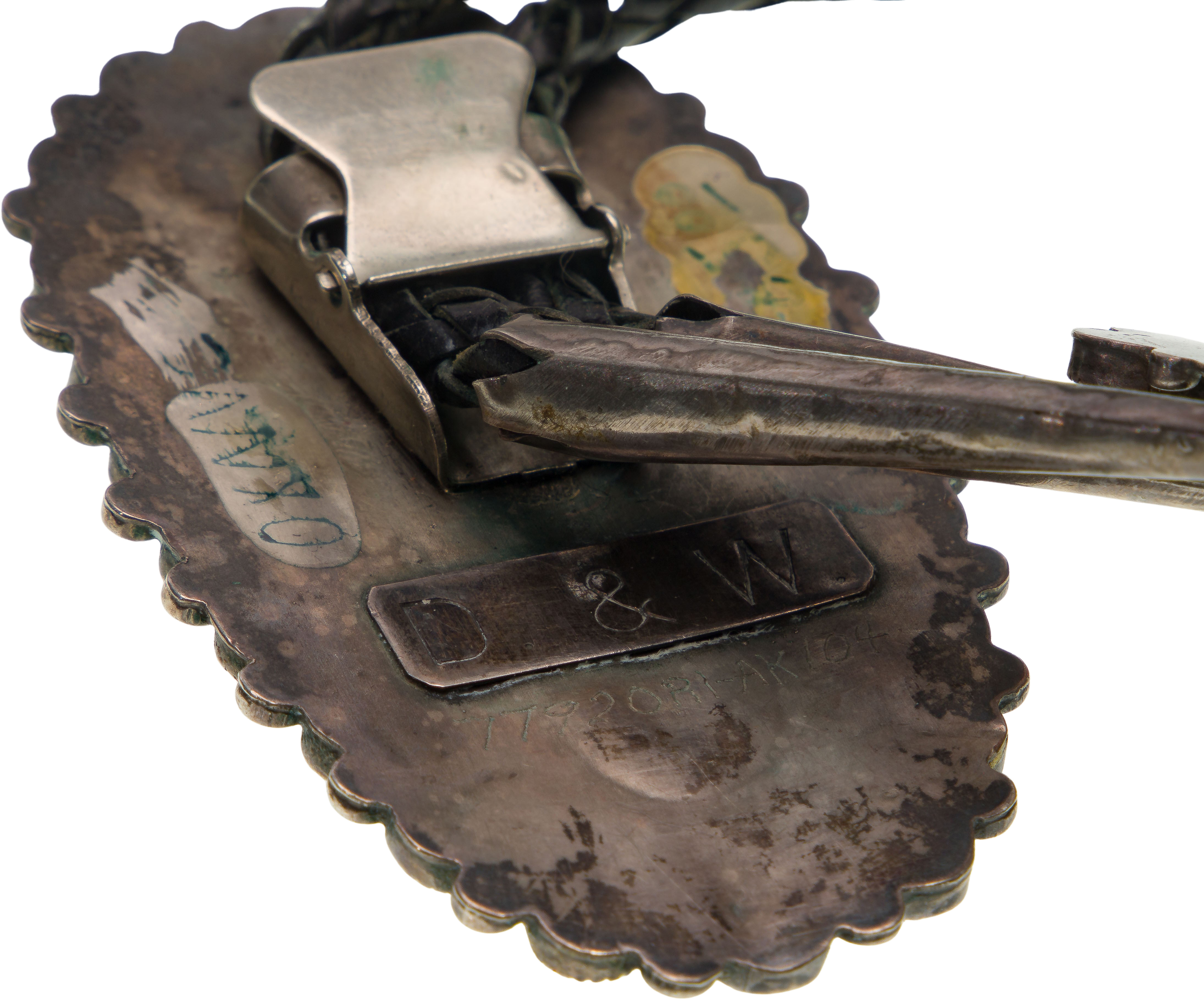 Weight: 10k gold: 18.00 dwts., .925 silver: 14.66 ozt., .830 silver: 0.90 ozt. (total including leather bolo ties)