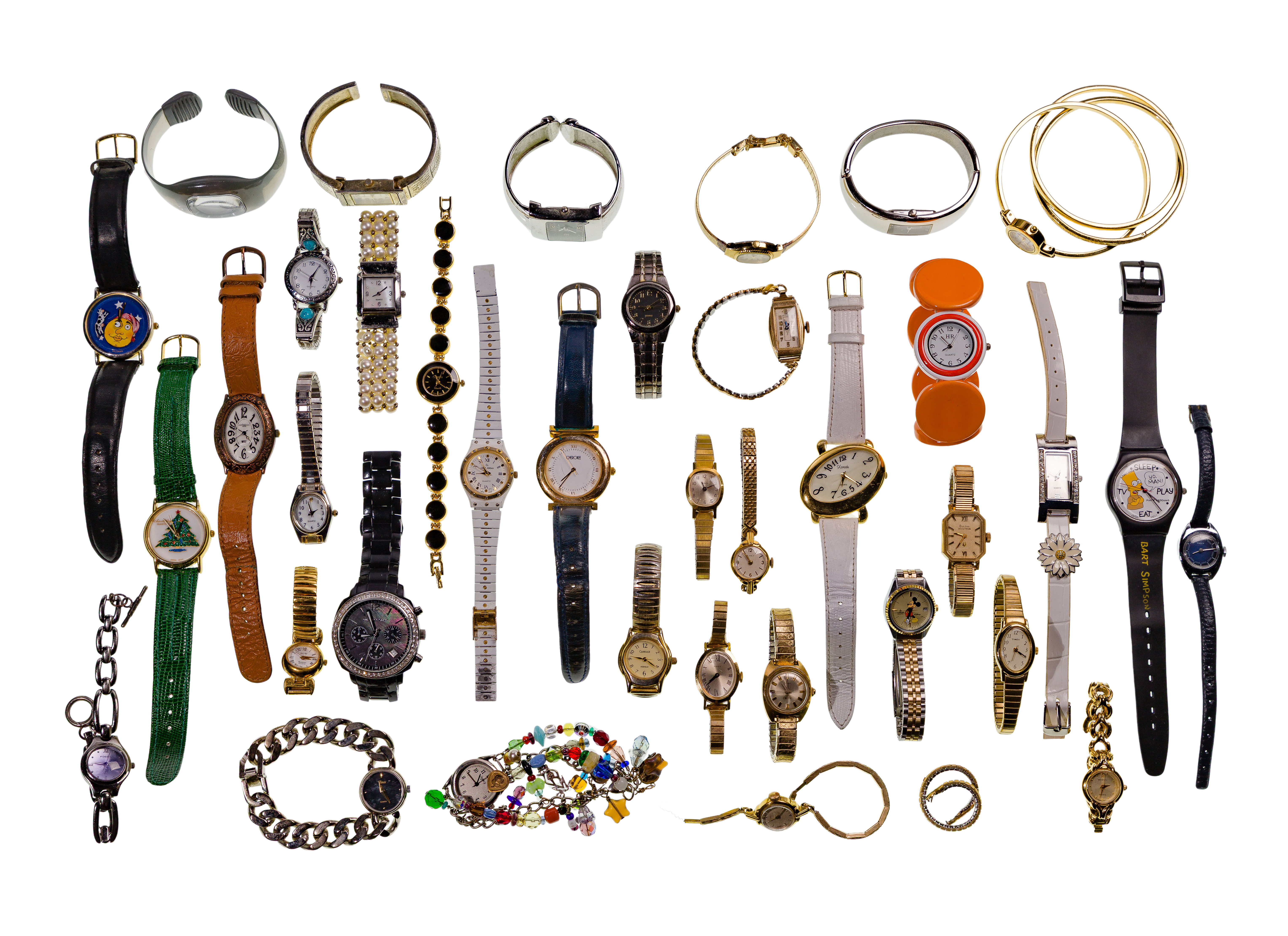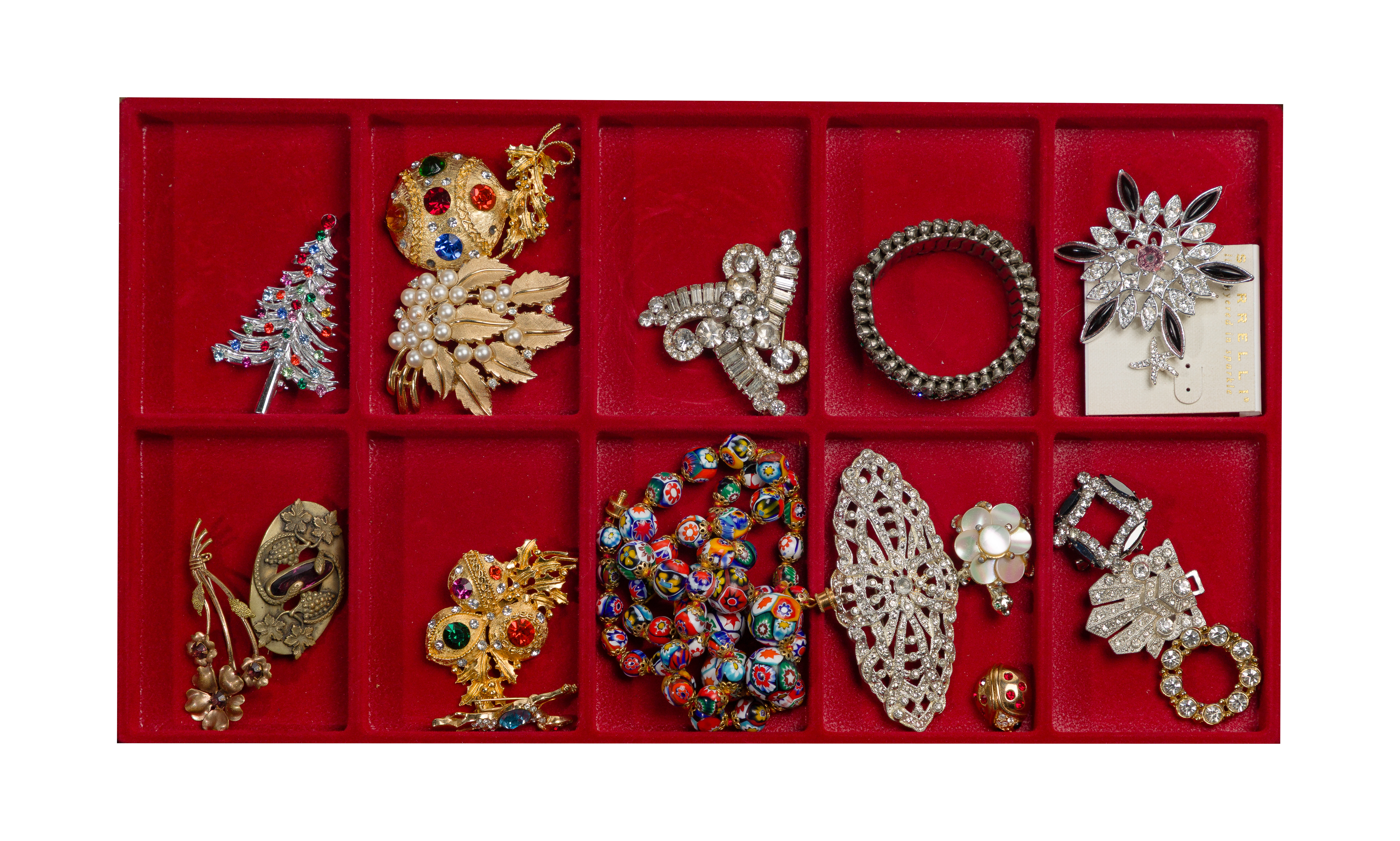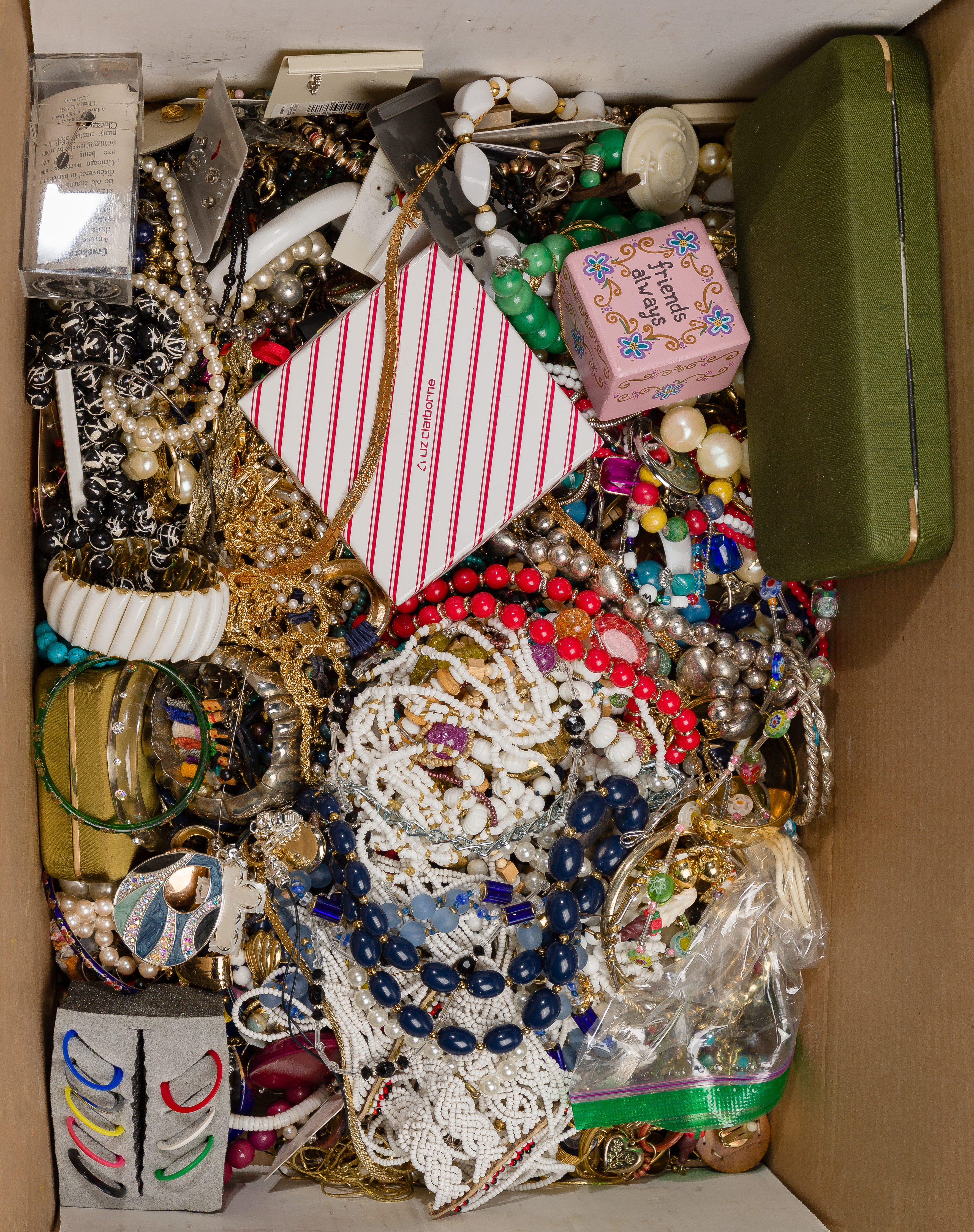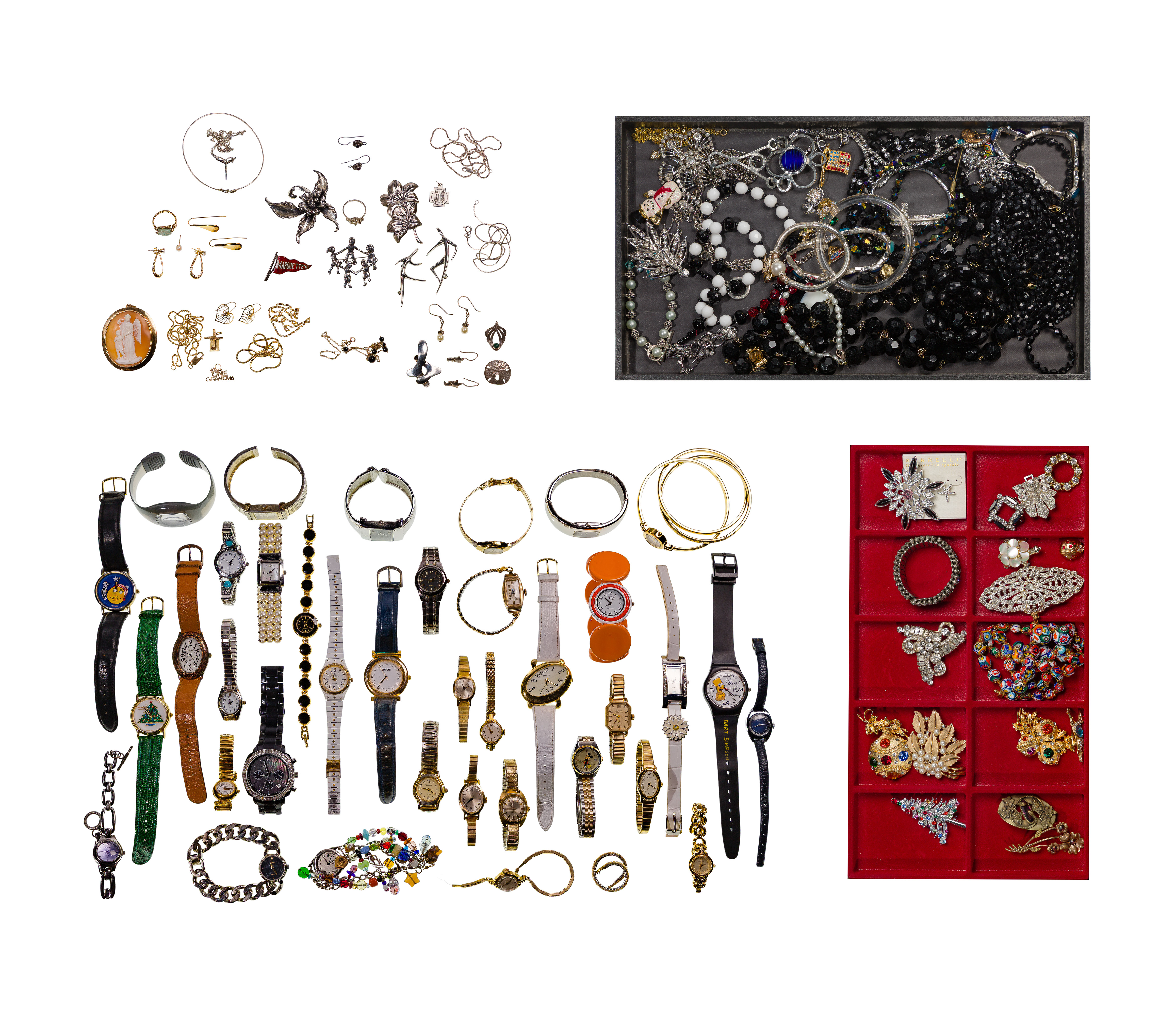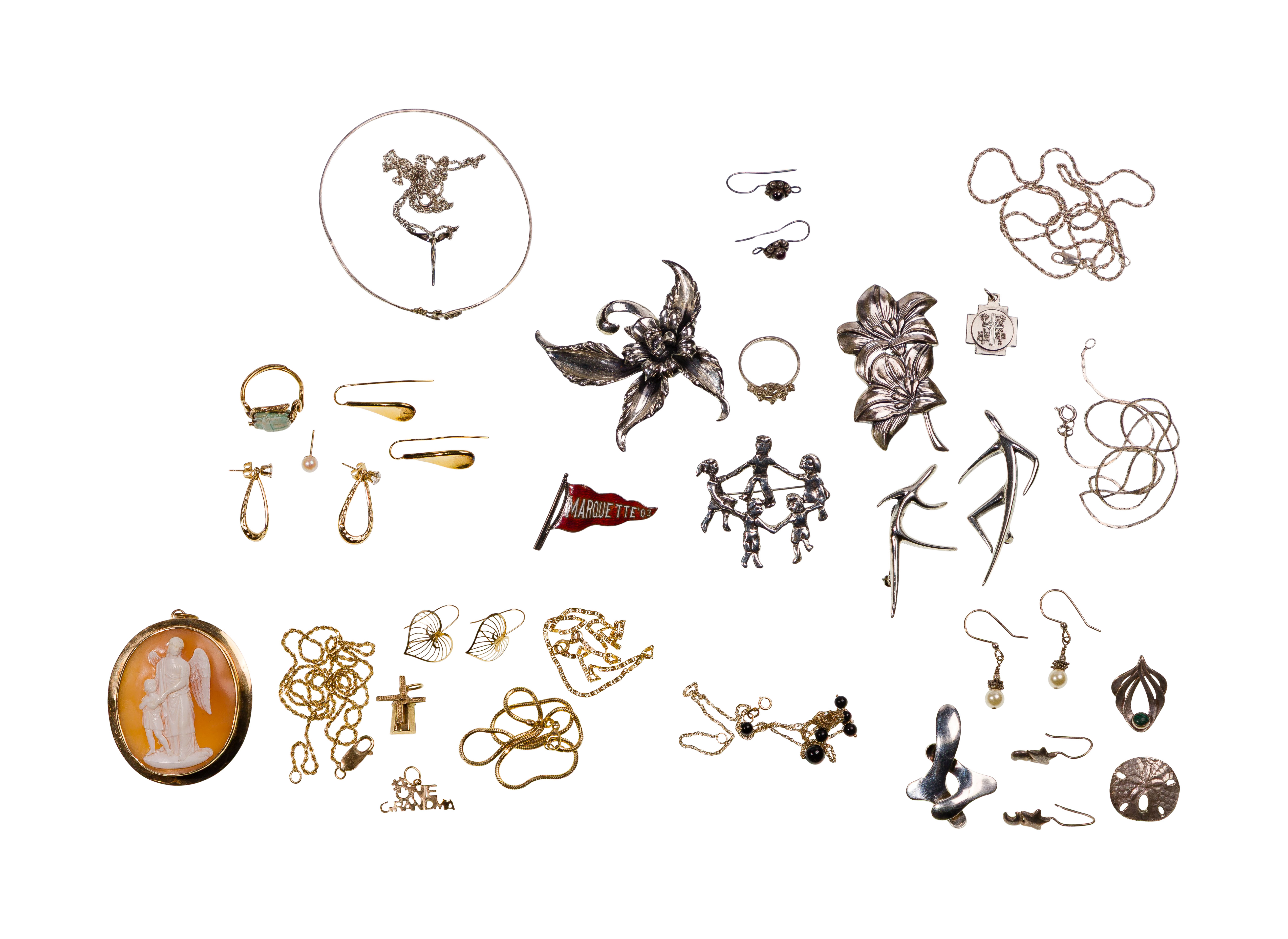 Including a guardian angel cameo pendant, a rope chain, (2) bracelets, an Egyptian scarab ring, (3) pairs of earrings, (2) charms and a single pearl earring (most marked ’14k’ / ‘585’), a black beaded necklace (marked ’10k’), (3) necklaces, a bangle bracelet, (6) pins, (4) pendants, a ring and (3) pairs of earrings (most marked ‘925’ / ‘sterling’) and approximately (24) pounds of costume jewelry necklaces, bracelets, earrings, pins and wristwatches