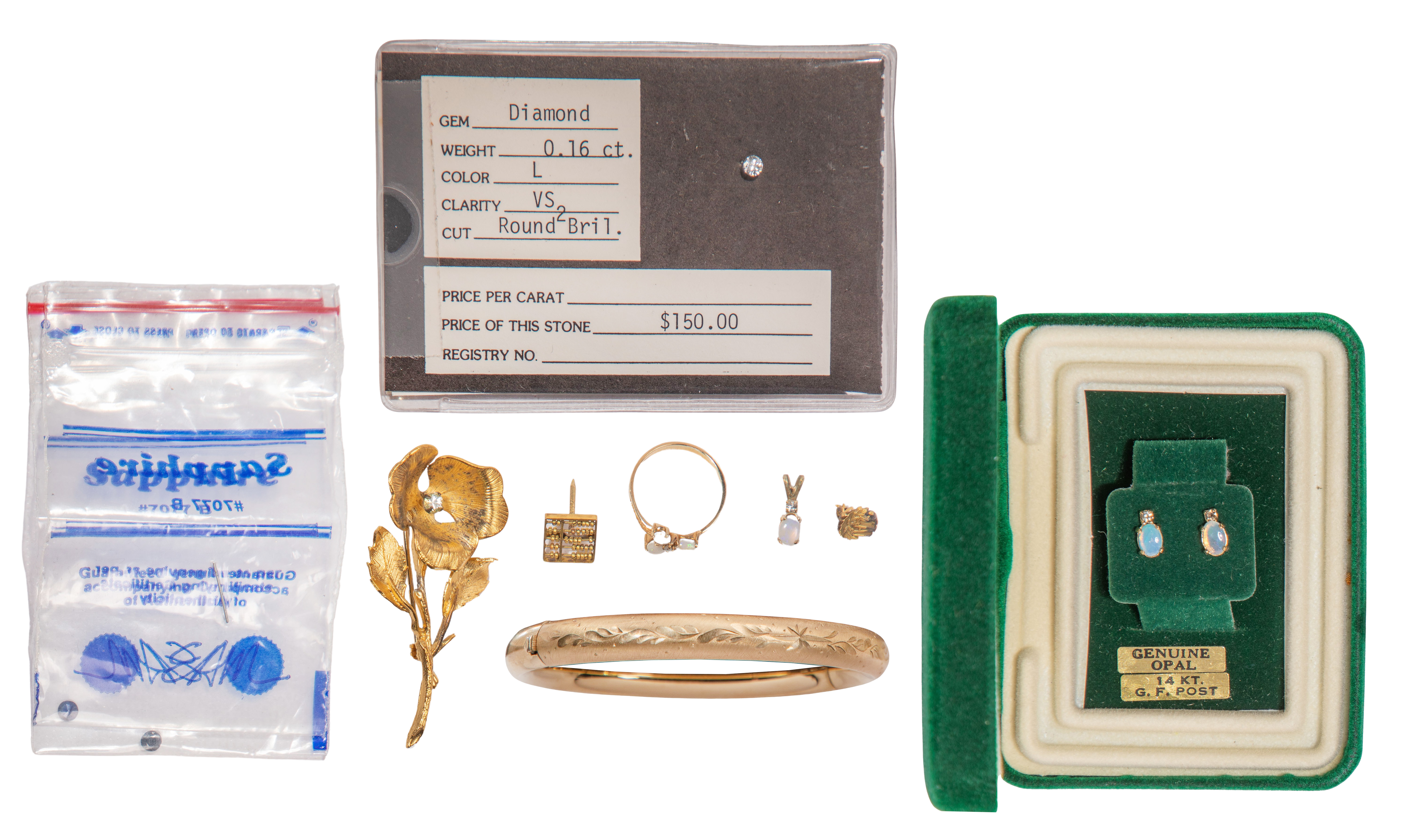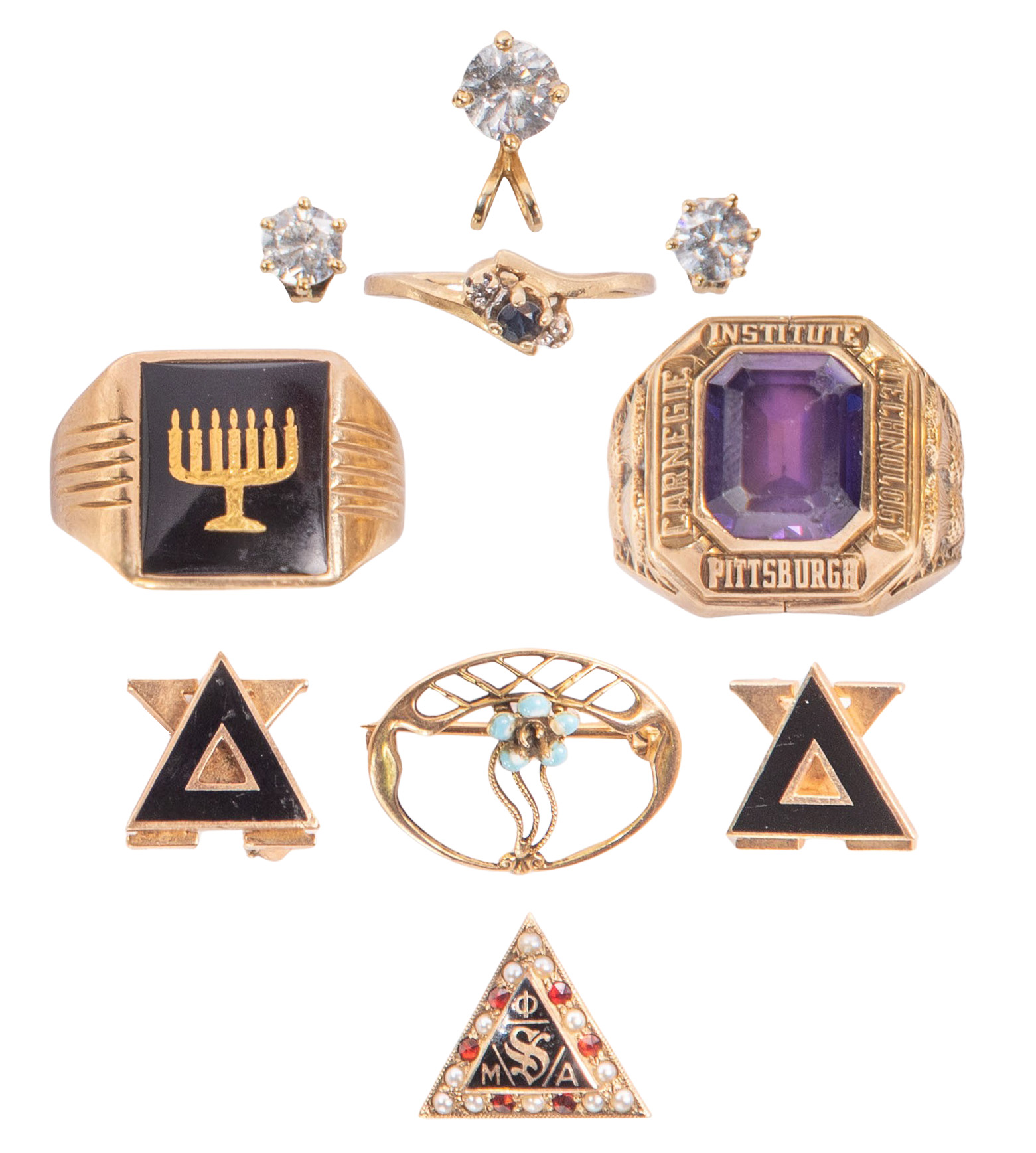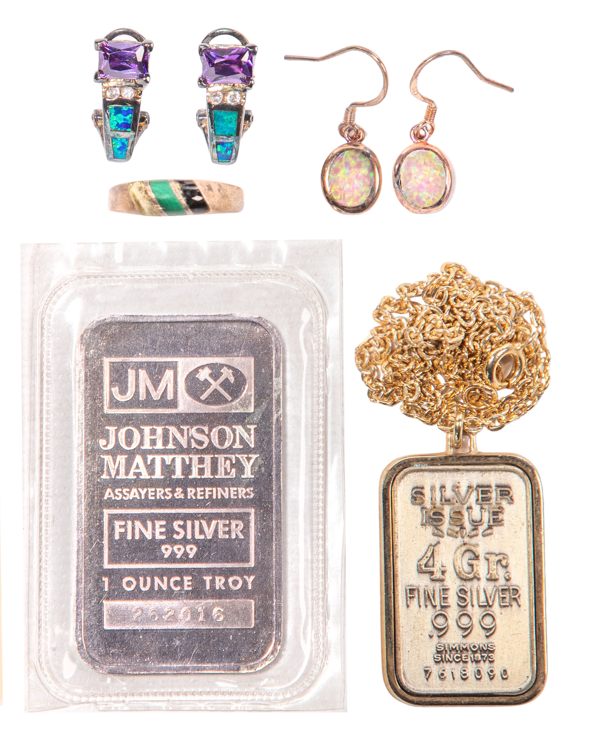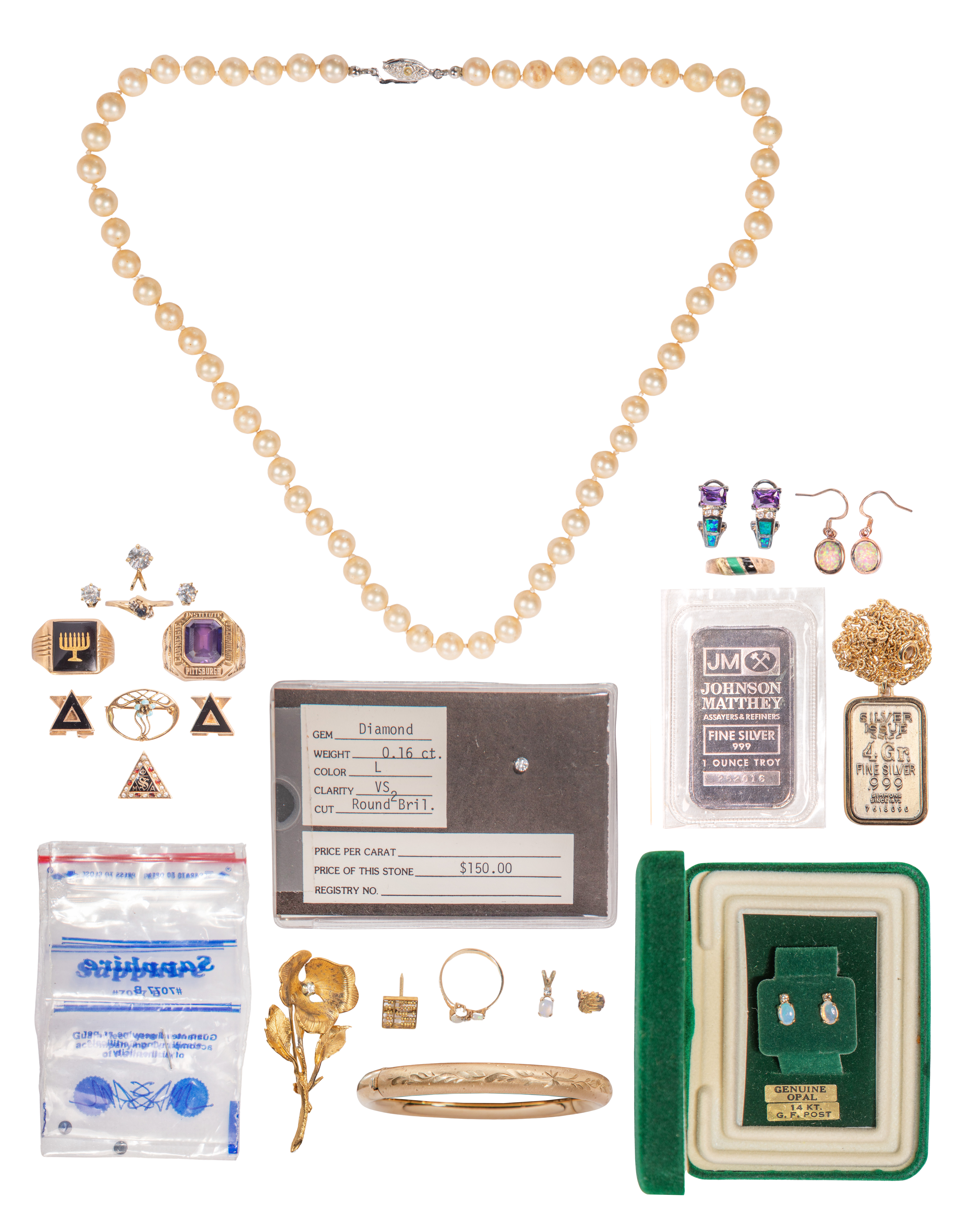 Including a class ring, a menorah themed ring, a blue sapphire ring, (4) pins and a cubic zirconia pendant and pair of earrings (most marked ’10k’), (2) pairs of earrings and a ring (marked ‘925’ / ‘sterling’), a 4 Gr. 0.999 silver bar having a gold plated chain and bezel, a Johnson Matthey 1 ozt 0.999 bar, a loose round cut diamond, (2) loose round cut blue sapphires and costume jewelry including a gold-tone bracelet, earrings, a faux pearl necklace, a ring, pendant and a flower pin