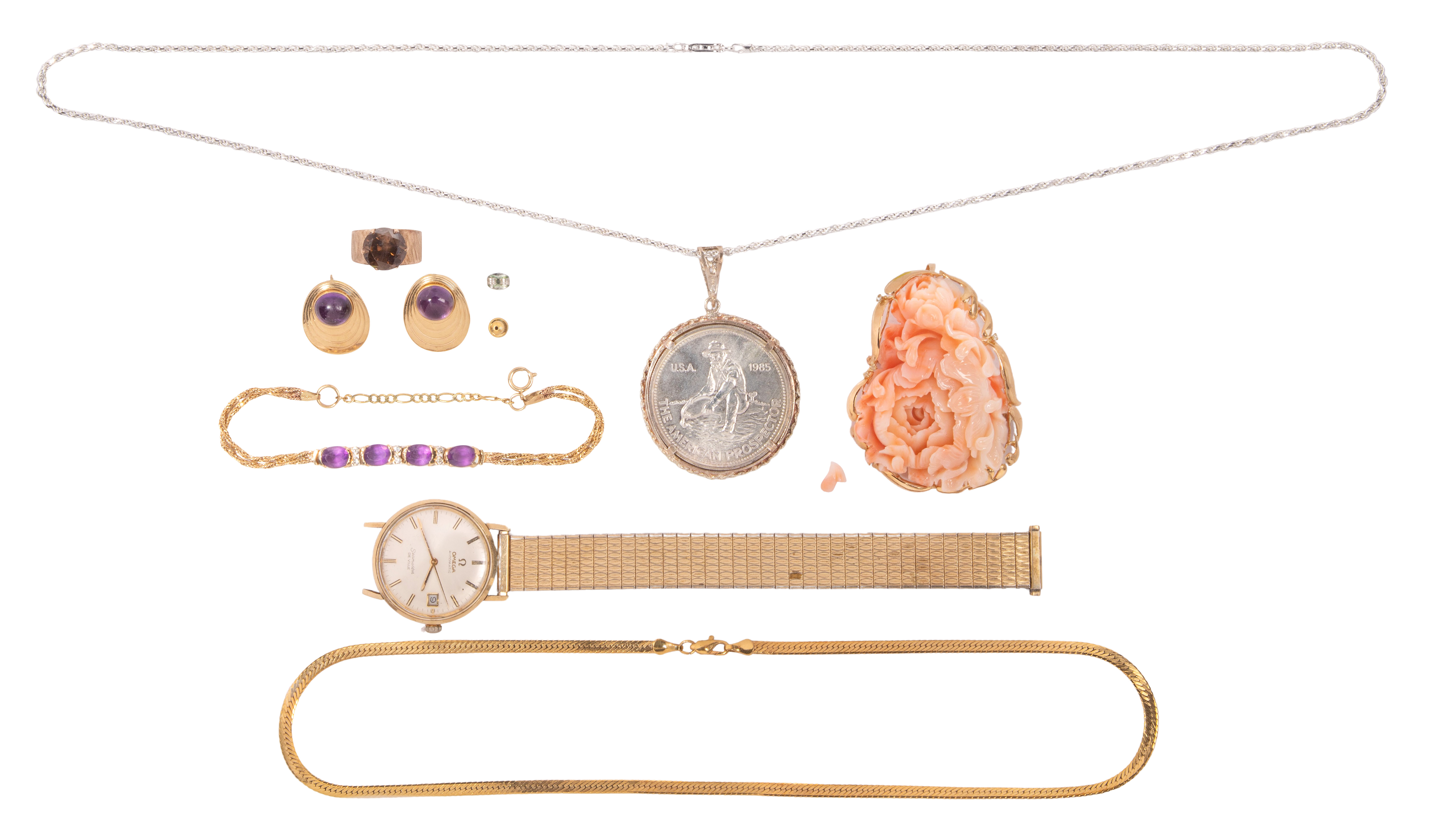 Including a semi-precious purple gemstone bracelet, a pair of purple cabochon earrings and a carved pink coral pin (all marked ’14k’), a smokey quartz ring and a necklace having a coin bezel pendant (marked ‘925’ / ‘999’) as well as a gold-tone Omega automatic Seamaster Deville and a costume jewelry necklace