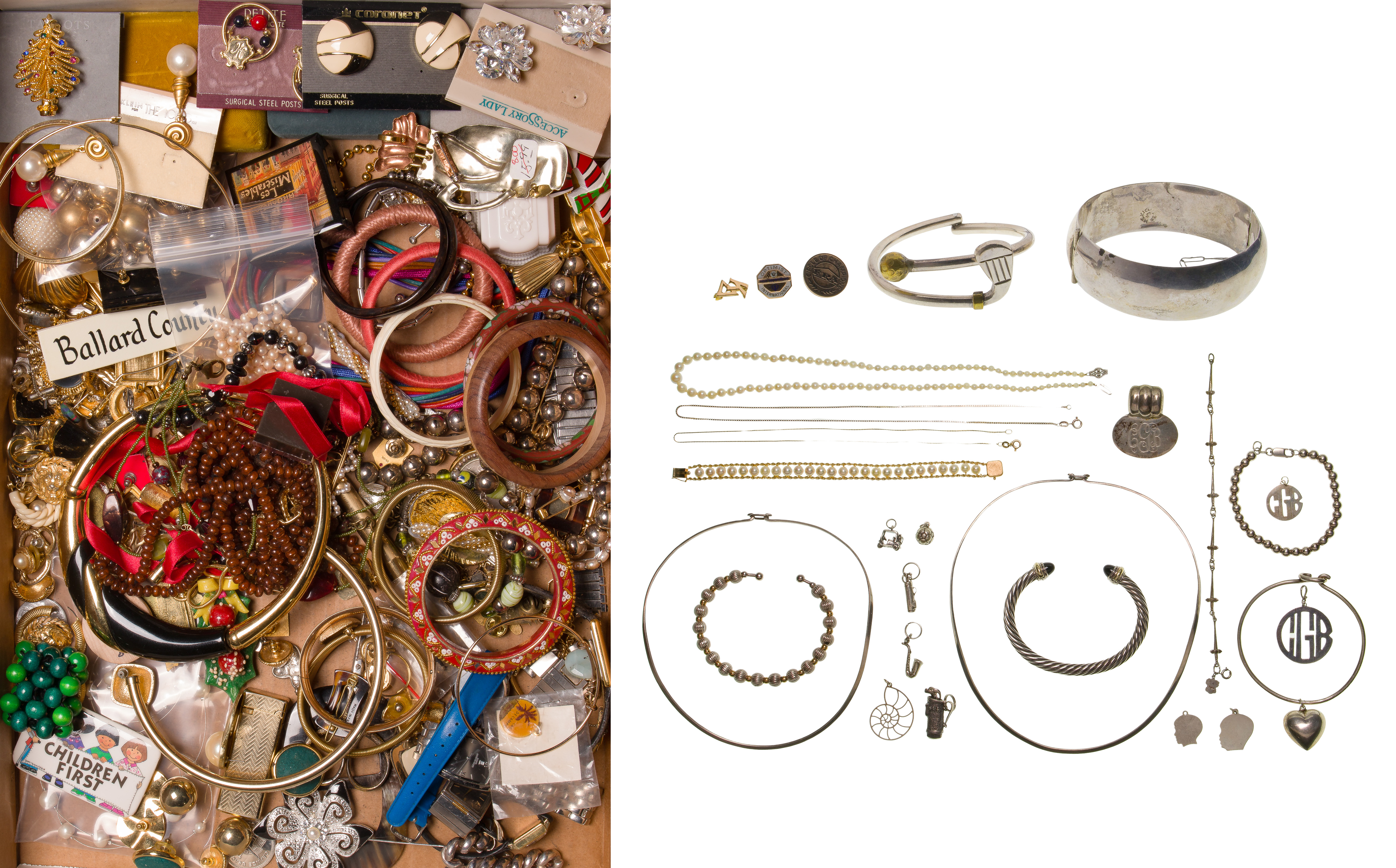 light to moderate wear overall, tarnish, some unmarked but XRF tested as 10k, some unmarked but XRF tested as 0.925 silver