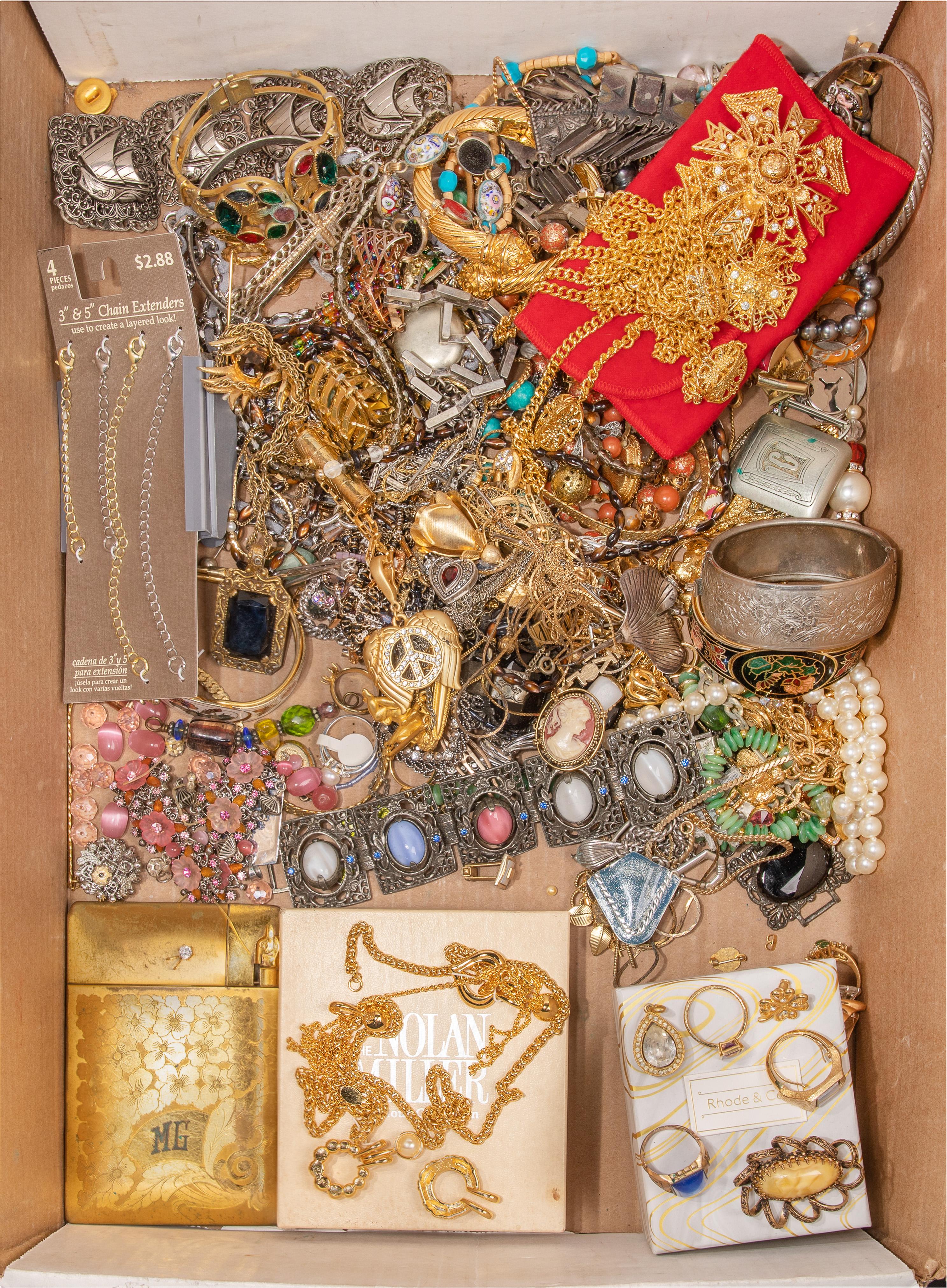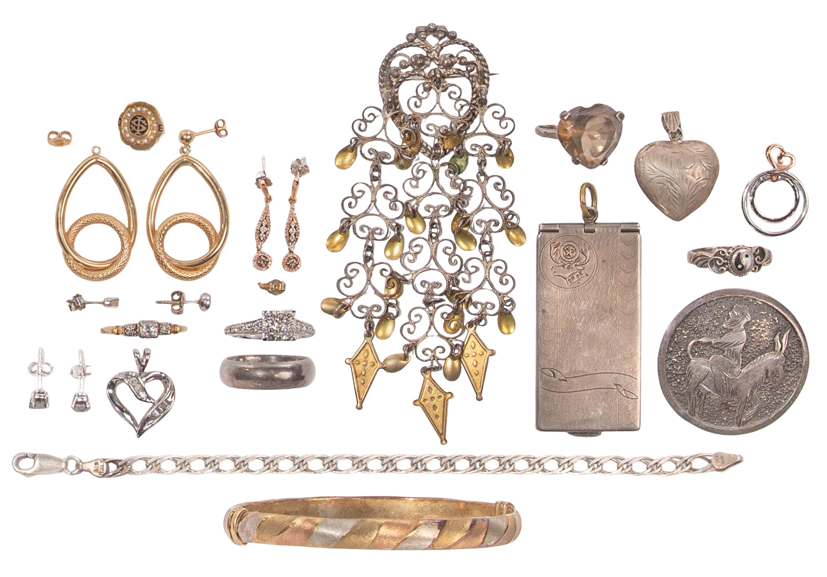 Including a pair of earrings, (3) single earrings, a backer and fraternity pin (most marked ’14k’), a white gold and diamond ring, a diamond ring, a pair of rose gold earrings, a white gold and diamond heart pendant and a scrap part (most marked ’10k’), (2) bracelets, (2) lockets, (3) rings, a heart dangle brooch pin, a pendant, a comical pin and a pair of stud earrings (some marked ‘925’ / ‘sterling’) and approximately (13) pounds of costume jewelry including rhinestones, necklaces, bracelets, rings, pins, earrings, a cigarette lighter case and wristwatches