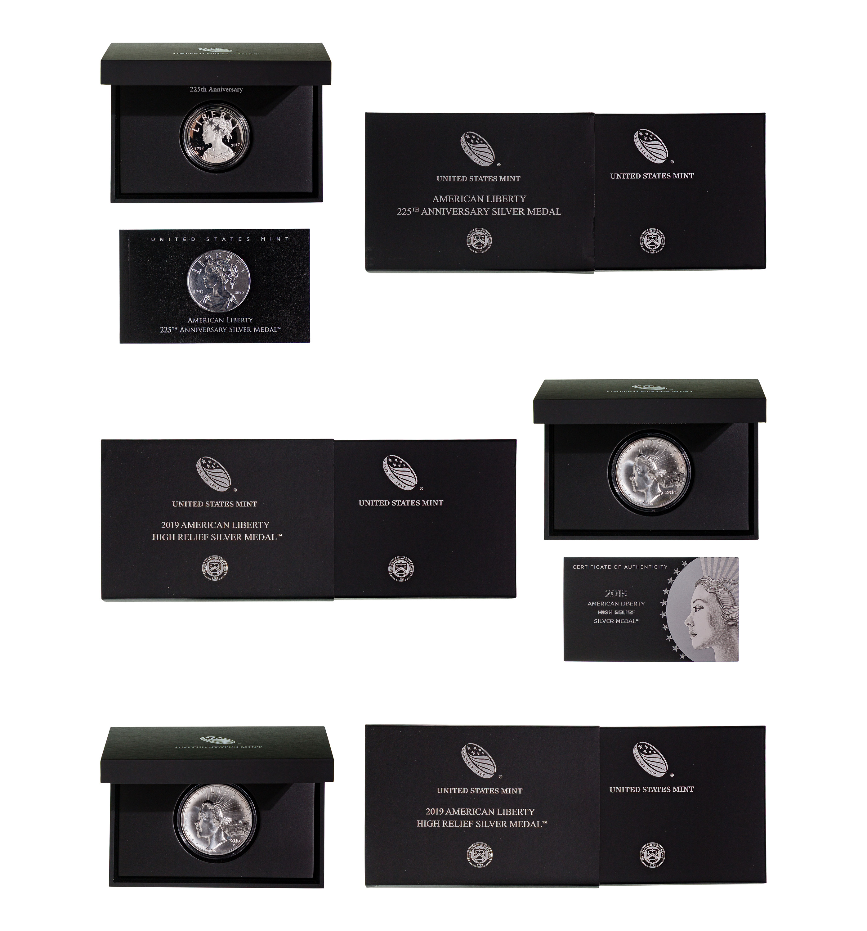 (3) medals including 2017 and (2) 2019 High Relief, having original mint packaging