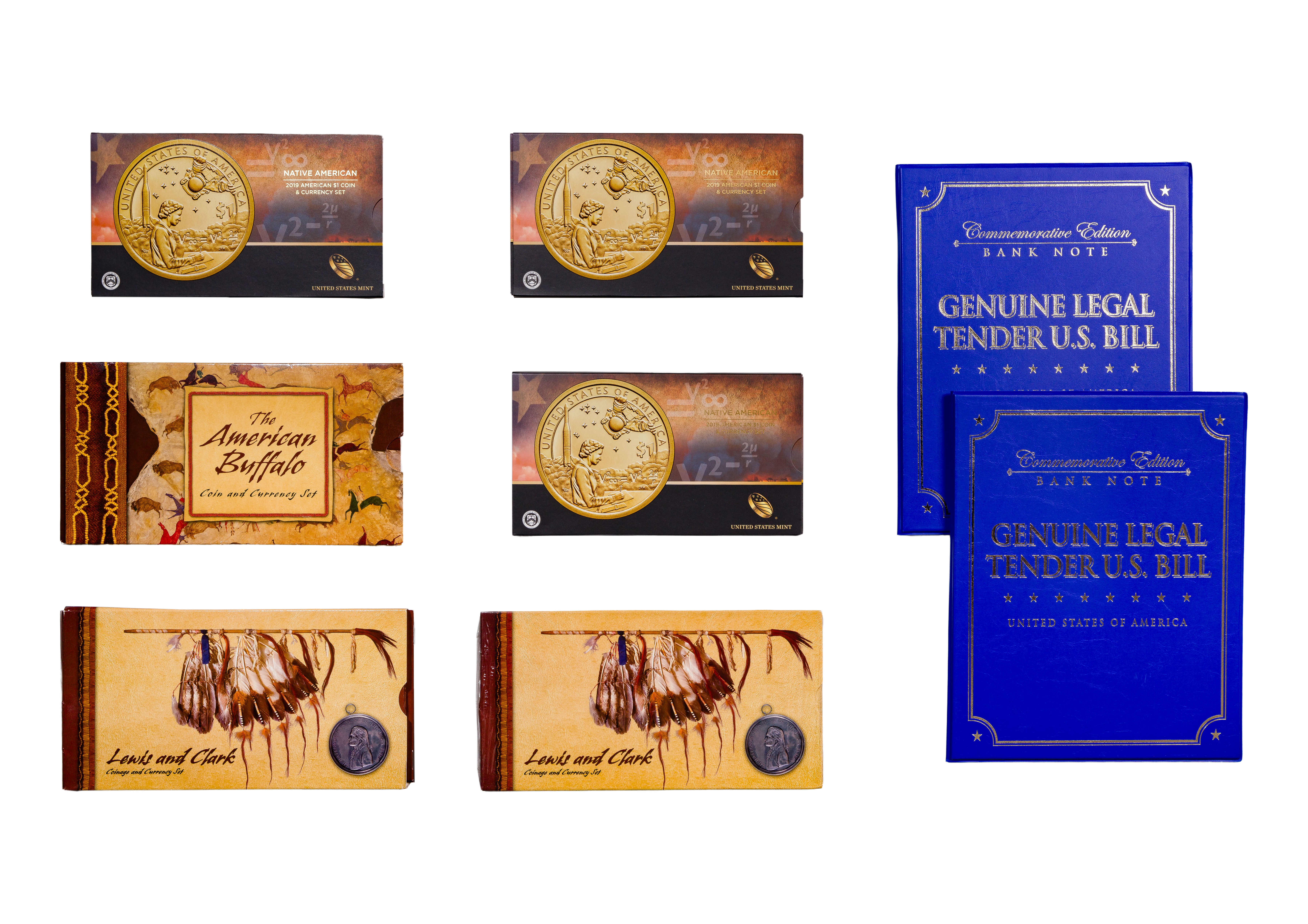 (6) sets including: 2001 American Buffalo, (2) 2004 Lewis and Clark, (3) 2019 Native American, together with (2) colorized $2 notes