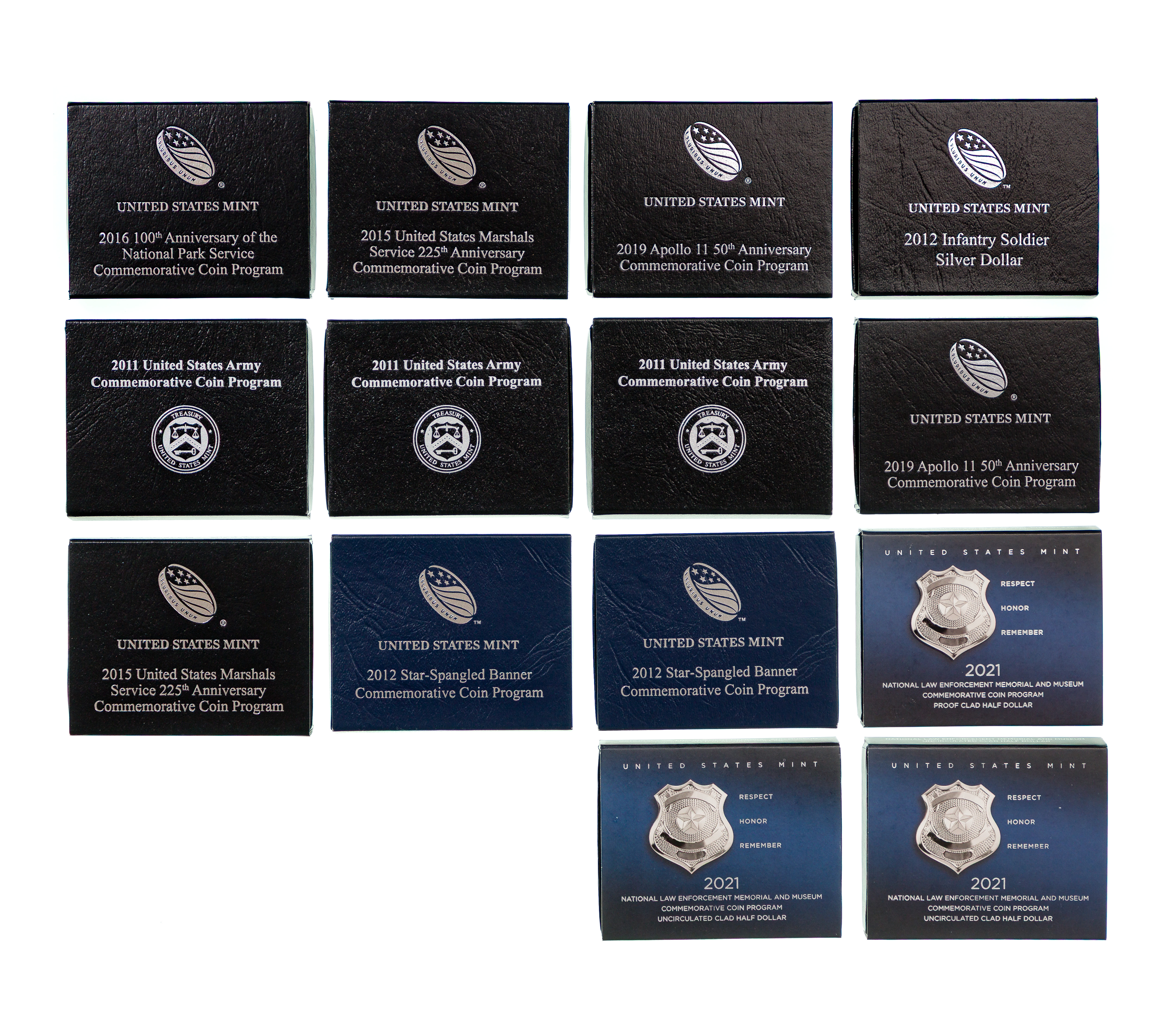 (14) coins including: (2) Star-Spangled Banner, Infantry Soldier, (2) US Marshals Service, Law Enforcement, (2) Apollo 11, National Park Service, US Army, having original packaging