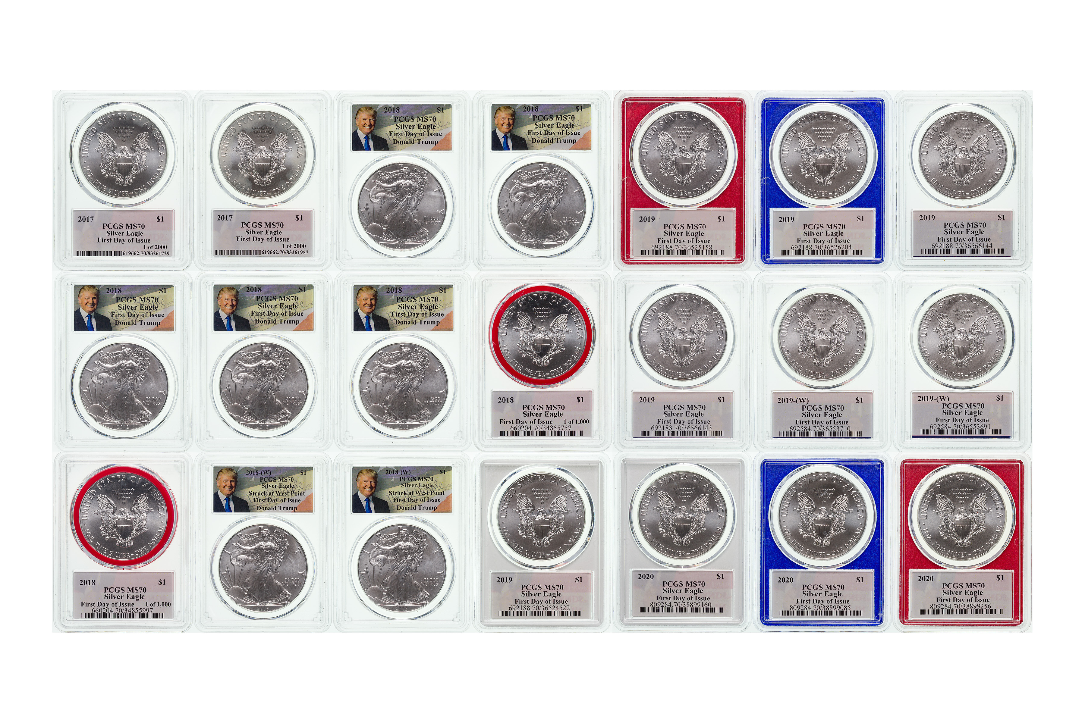 (21) coins including (2) 2017, (7) 2018, (2) 2018-W, (5) 2019, (2) 2019-W, (3) 2020, first day of issue, Donald Trump label