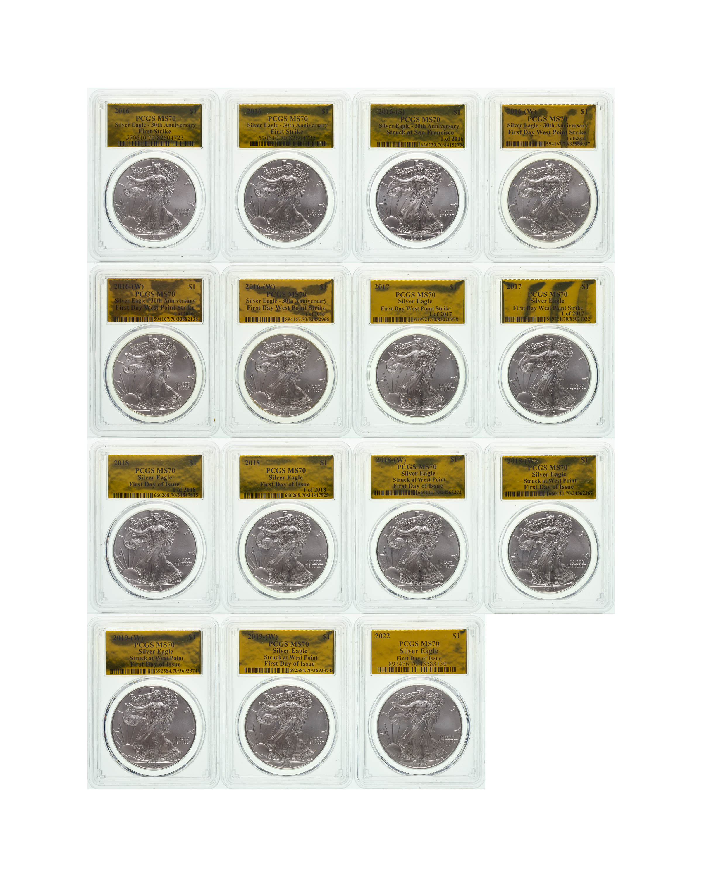 (15) coins including: (2) 2016, 2016-S, (3) 2016-W, (2) 2017, (2) 2018, (2) 2018-W, (2) 2019-W, 2022, first day of issue, gold label