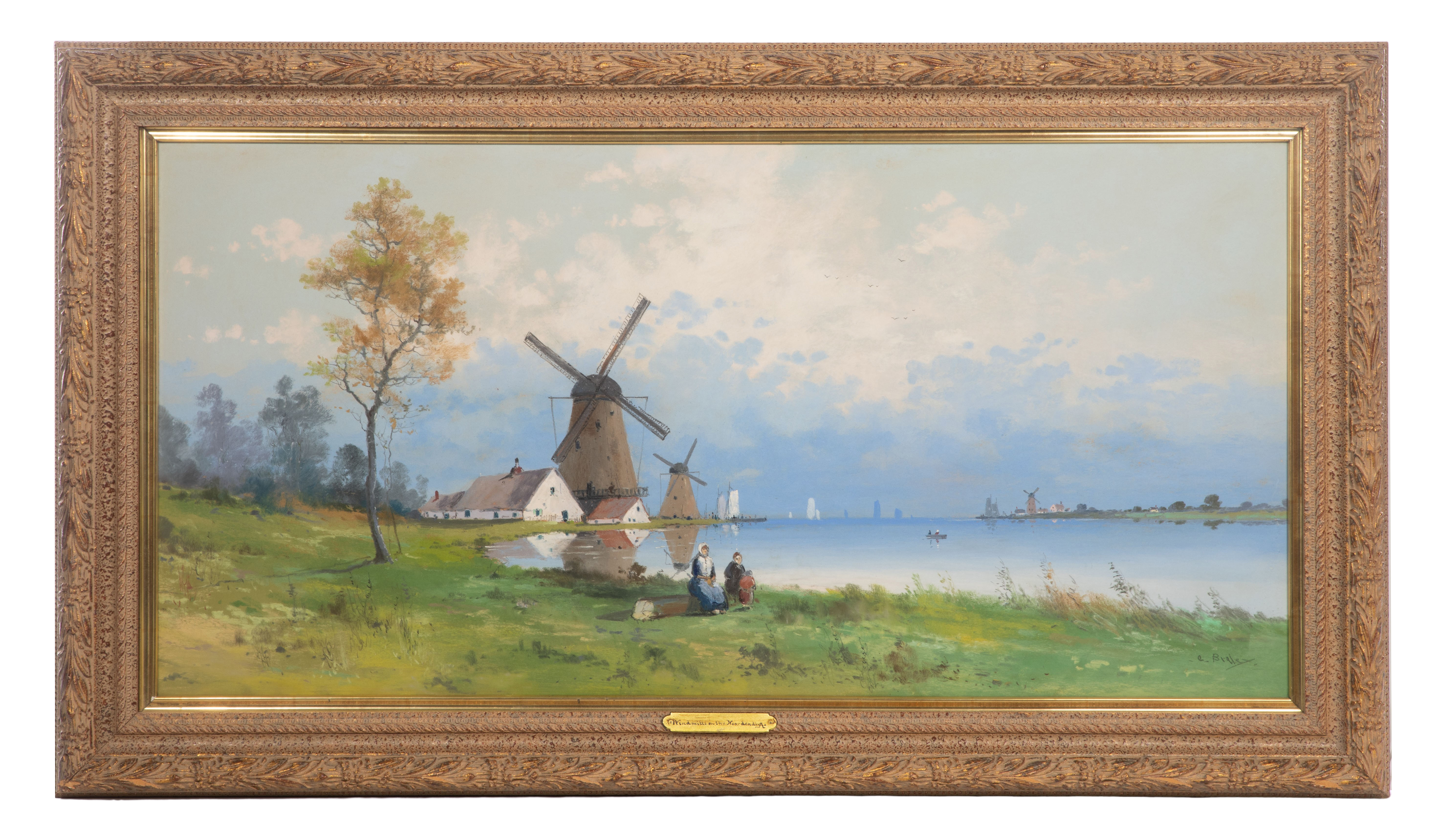 Undated, signed depiction of the Dutch North Dike having windmills and figures at the edge of the water, behind glass in a gold-tone gesso on wood frame having a brass title label