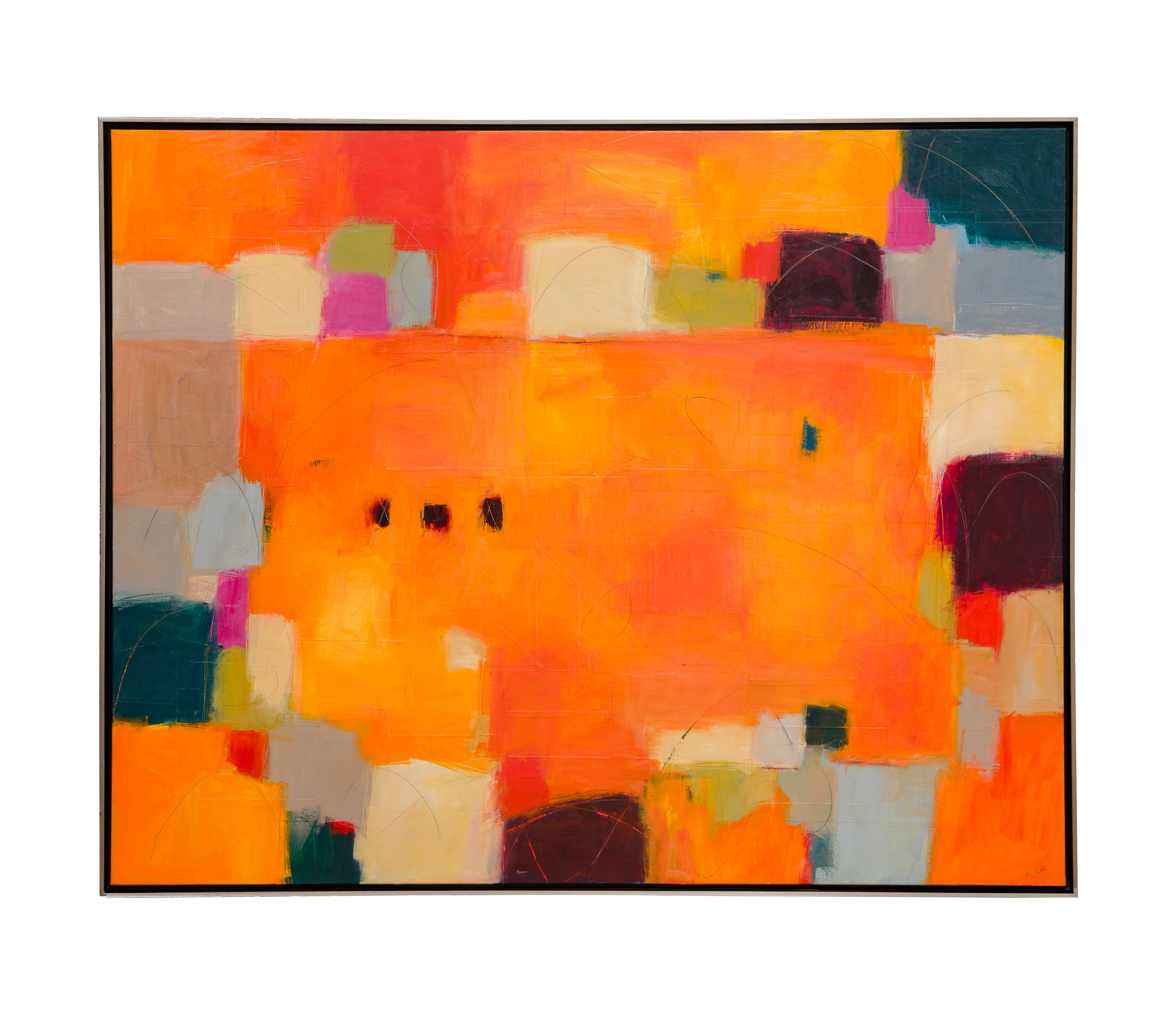 Undated, signed, depicting an abstract image in bright color, in a silver-tone and black wood frame