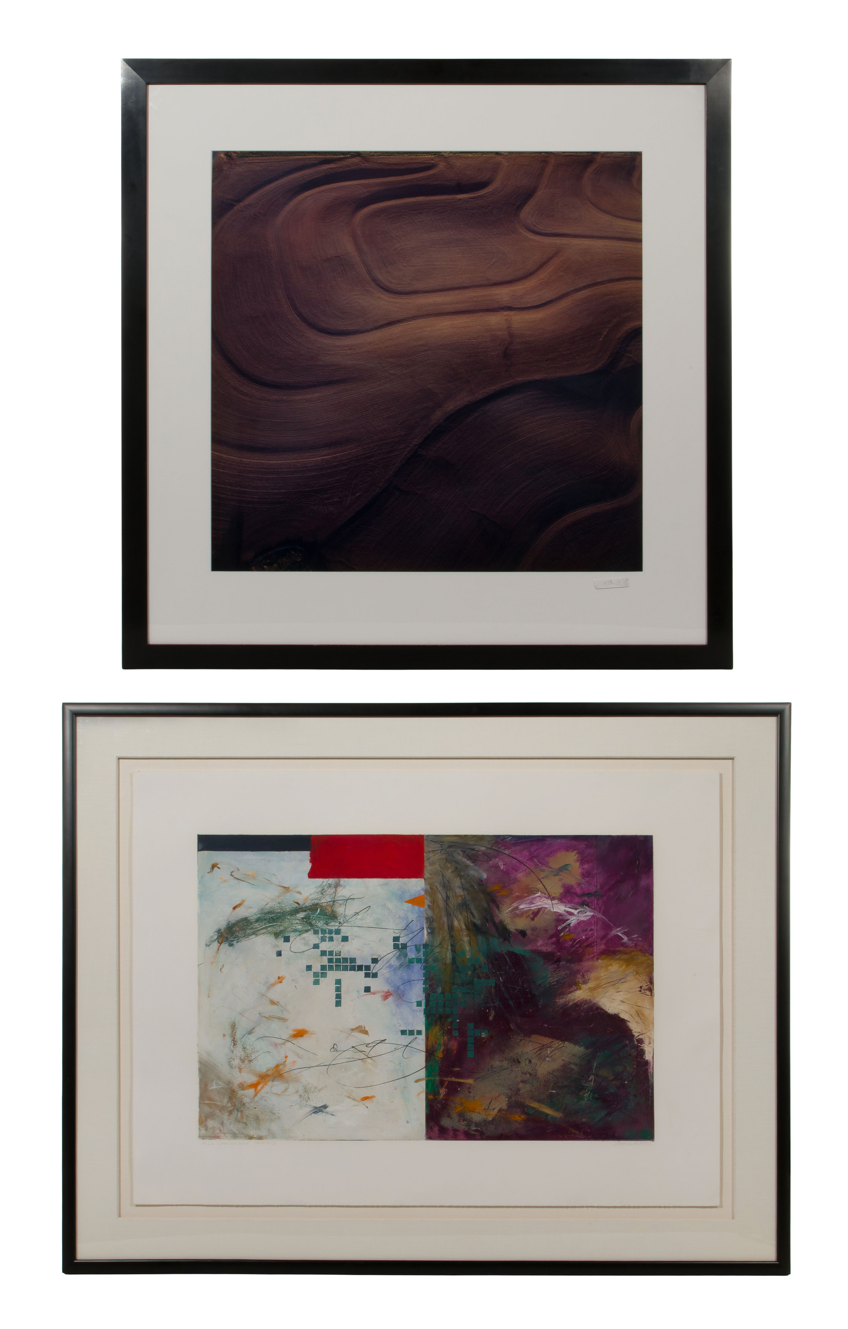 (2) total items including an undated, pencil signed mixed media, titled ‘#11 Landscape Series’ lower left, float mounted within mat behind acrylic in a black wood frame; together with an undated and unsigned photographic image of swirling harrow marks in soil, matted behind acrylic in a black wood frame, retaining a partial label reading ‘Kansas 1990’ verso