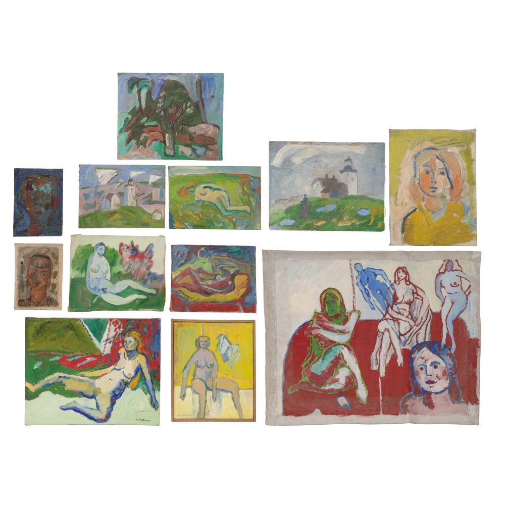 (11) total items including a signed oil on canvas in lath frame and an unframed signed canvas on stretcher; together with attributed, unsigned and unframed items including (4) canvas covered boards, (4) on Masonite, an illustration board and an unstretched canvas