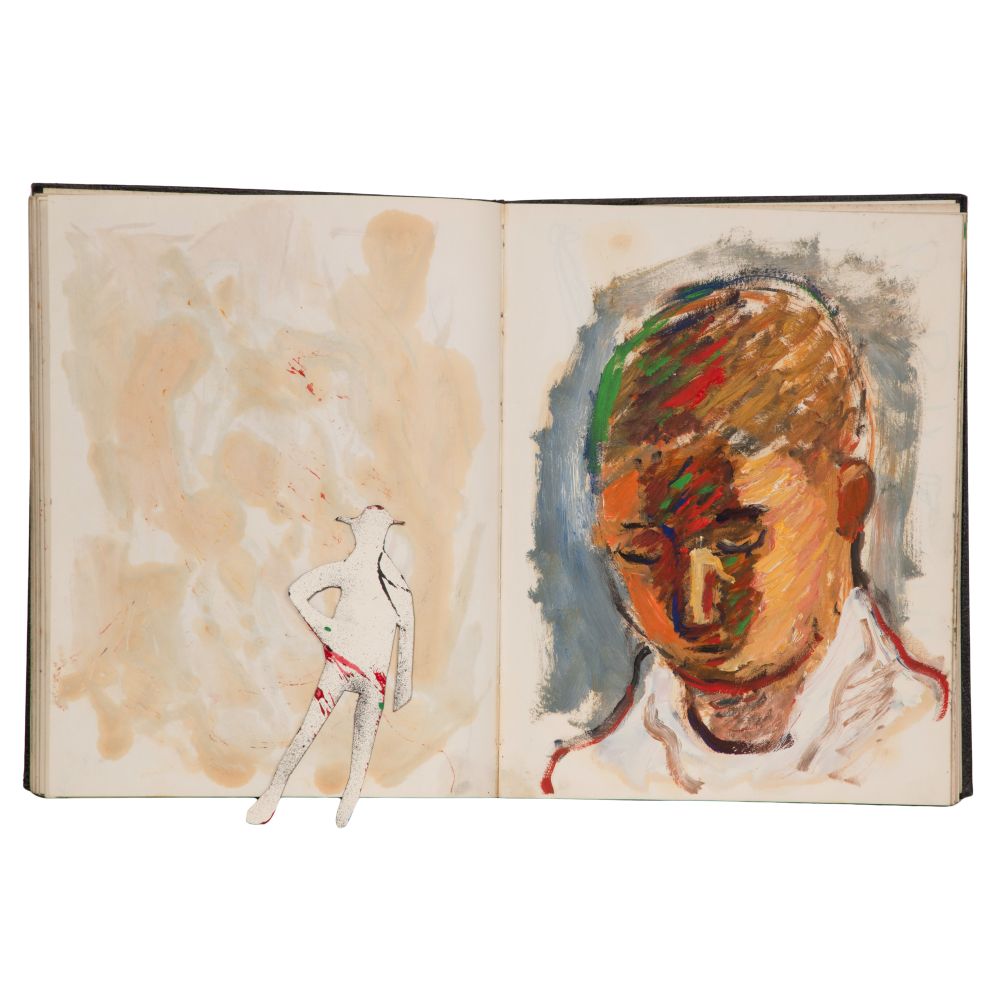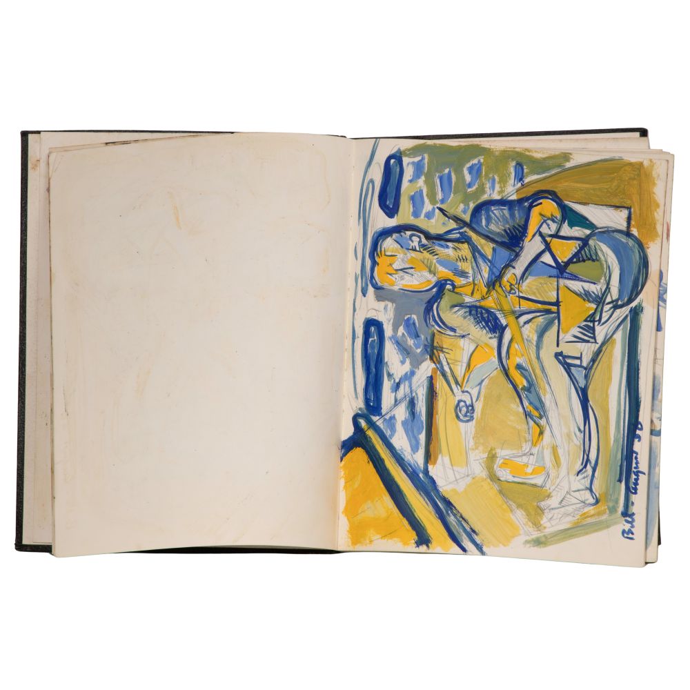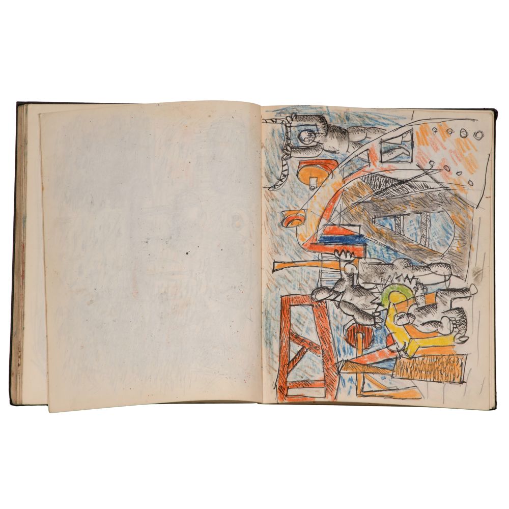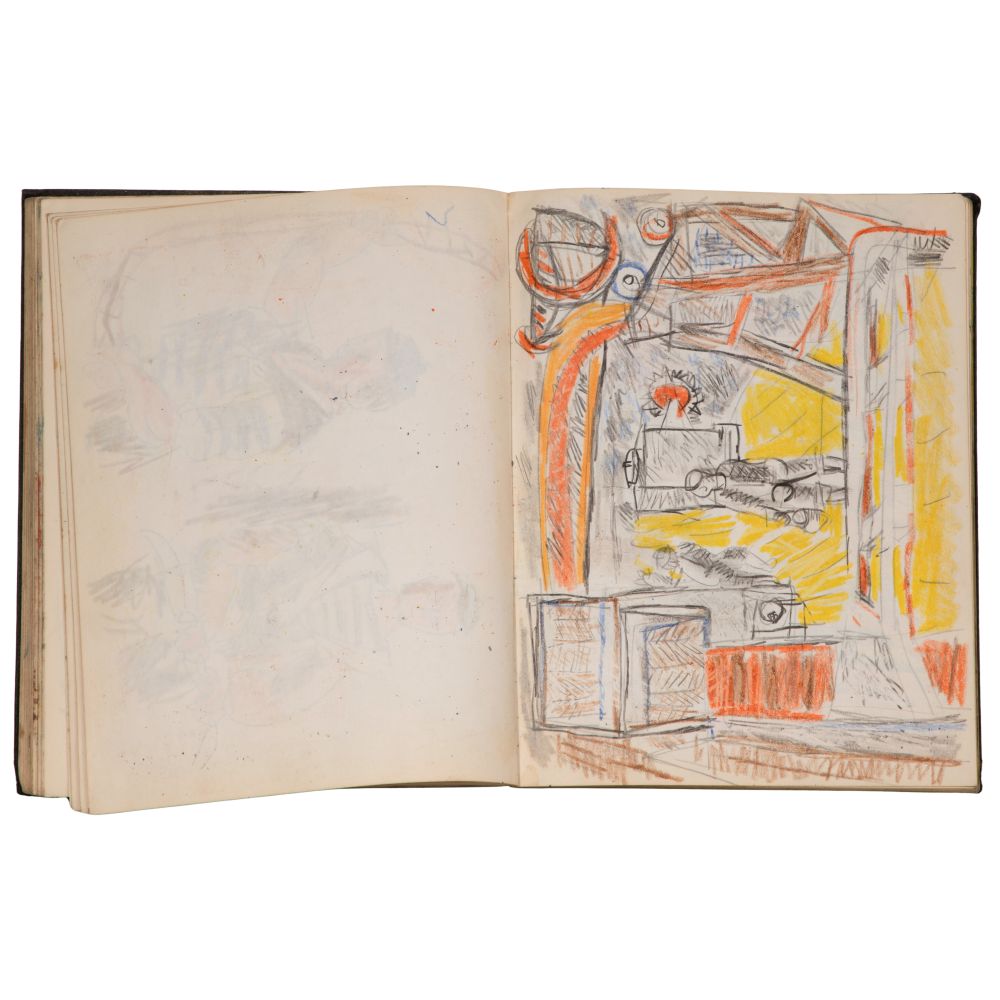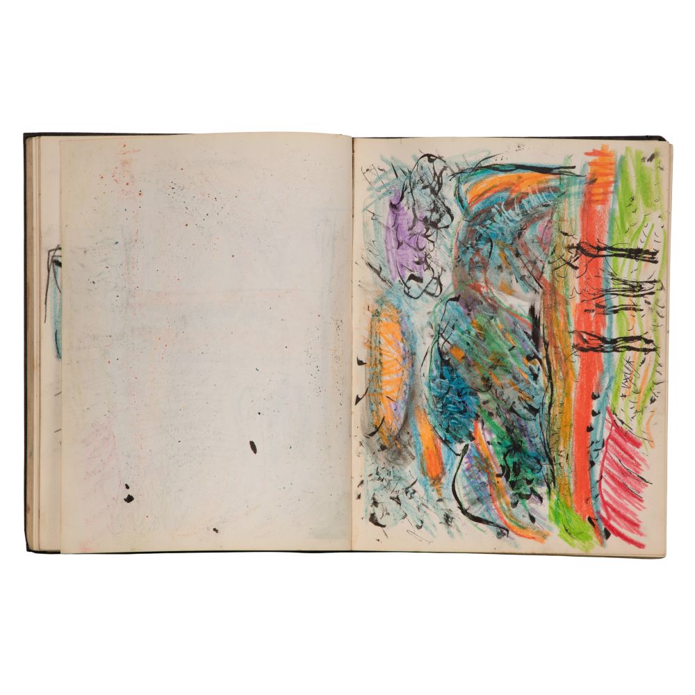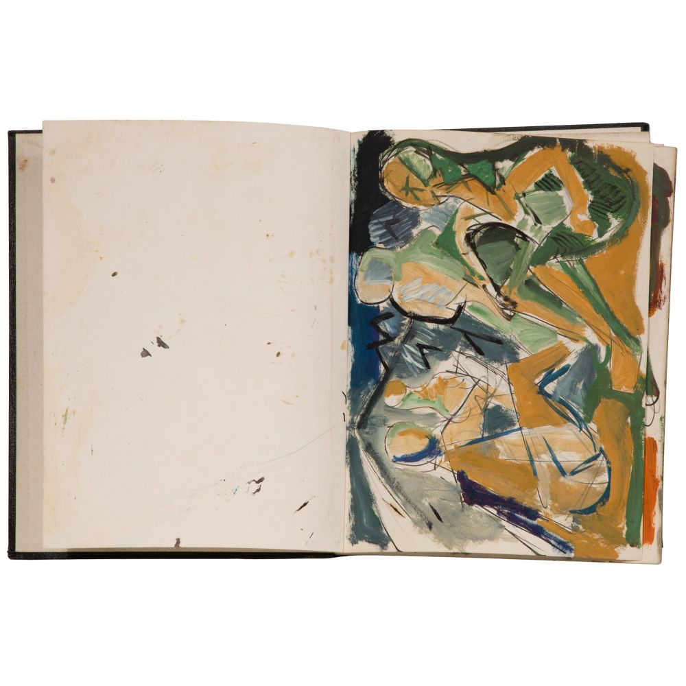 Approximately (25) total items including (2) sketchbooks, one signed on end paper, one only partially filled, having abstract geometric, figural and landscape ink, graphite and mixed media drawings and paintings on paper, (7) loose drawings, one pencil signed, another matted; together with (17) ephemeral items including pamphlets, brochures, and photocopies of print reviews concerning the artist
